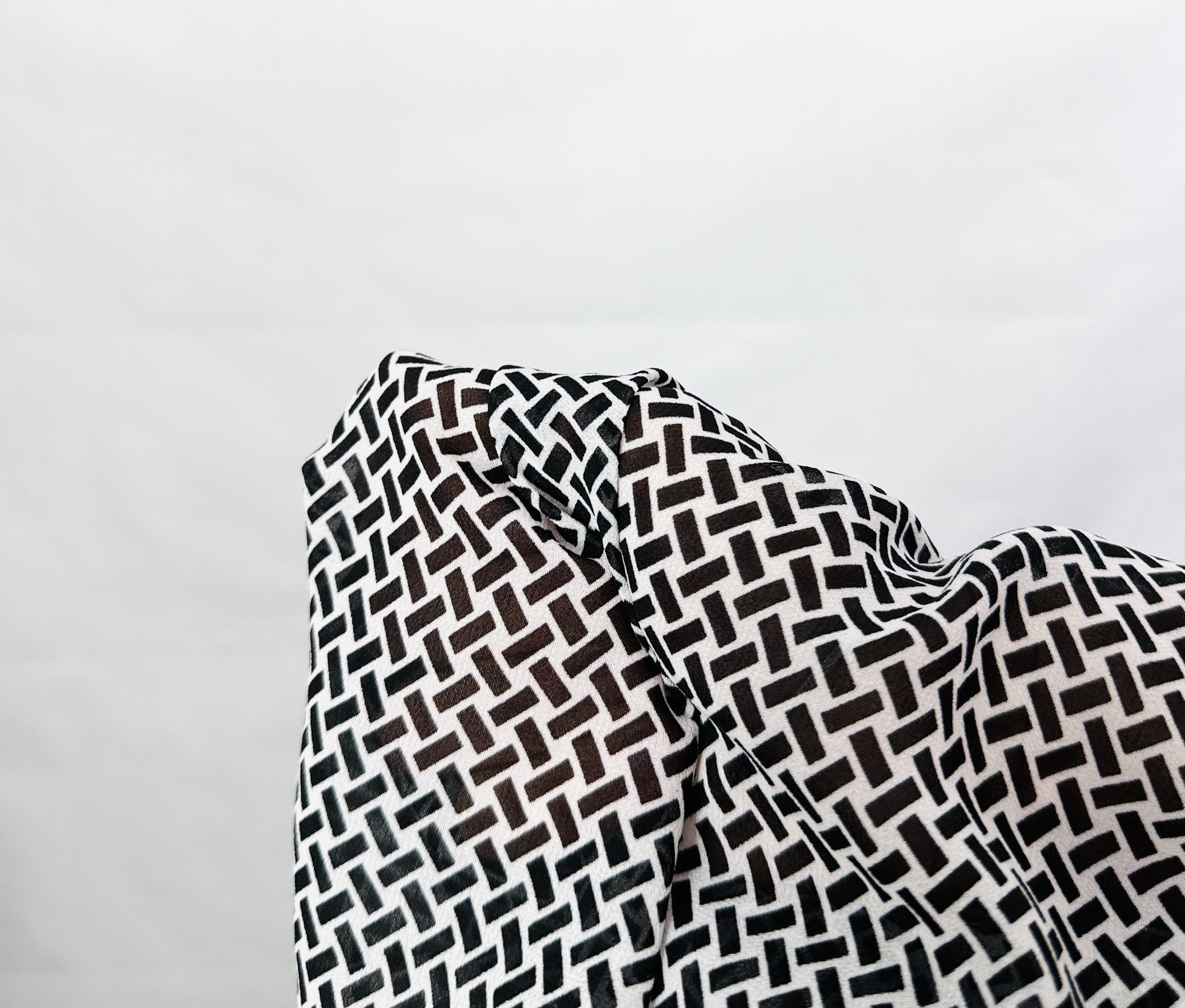 Ta czarno-biała bluzka to kwintesencja nowoczesnej elegancji, która w mistrzowski sposób łączy klasyczną kolorystykę z dynamicznym, geometrycznym motywem. Całość tkaniny pokrywa misterny wzór przypominający drobną, regularną plecionkę, który nadaje ubraniu trójwymiarowości i niezwykłego szyku. Kontrastowe zestawienie głębokiej czerni i czystej bieli tworzy harmonijną kompozycję, która przyciąga wzrok, pozostając jednocześnie doskonałą bazą dla profesjonalnych i wizytowych stylizacji. To idealny wybór dla kobiet, które cenią sobie wyraziste desenie w stonowanym, eleganckim wydaniu.
