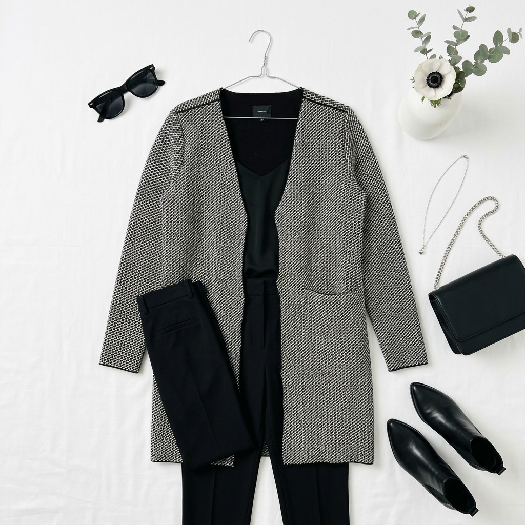 W stylizacjach narzutka będzie uniwersalnym elementem od codziennych po bardziej formalne: na co dzień zestaw ją z wąskimi jeansami i sneakersami lub botkami, do pracy noś z eleganckimi cygaretkami i gładkim topem, a na spotkanie wieczorne wybierz dopasowane spodnie i subtelne półbuty lub czółenka. Czarno biała grafika świetnie łączy się z neutralami — bielą i czernią — oraz z denimem i kremowymi dodatkami; jeśli chcesz dodać akcentu, postaw na mocniejszy kolor w dodatkach, na przykład bordo lub butelkową zieleń. Ta narzutka to funkcjonalna, stylowa baza, która wniesie do garderoby uporządkowaną elegancję i dużo możliwości stylizacyjnych.