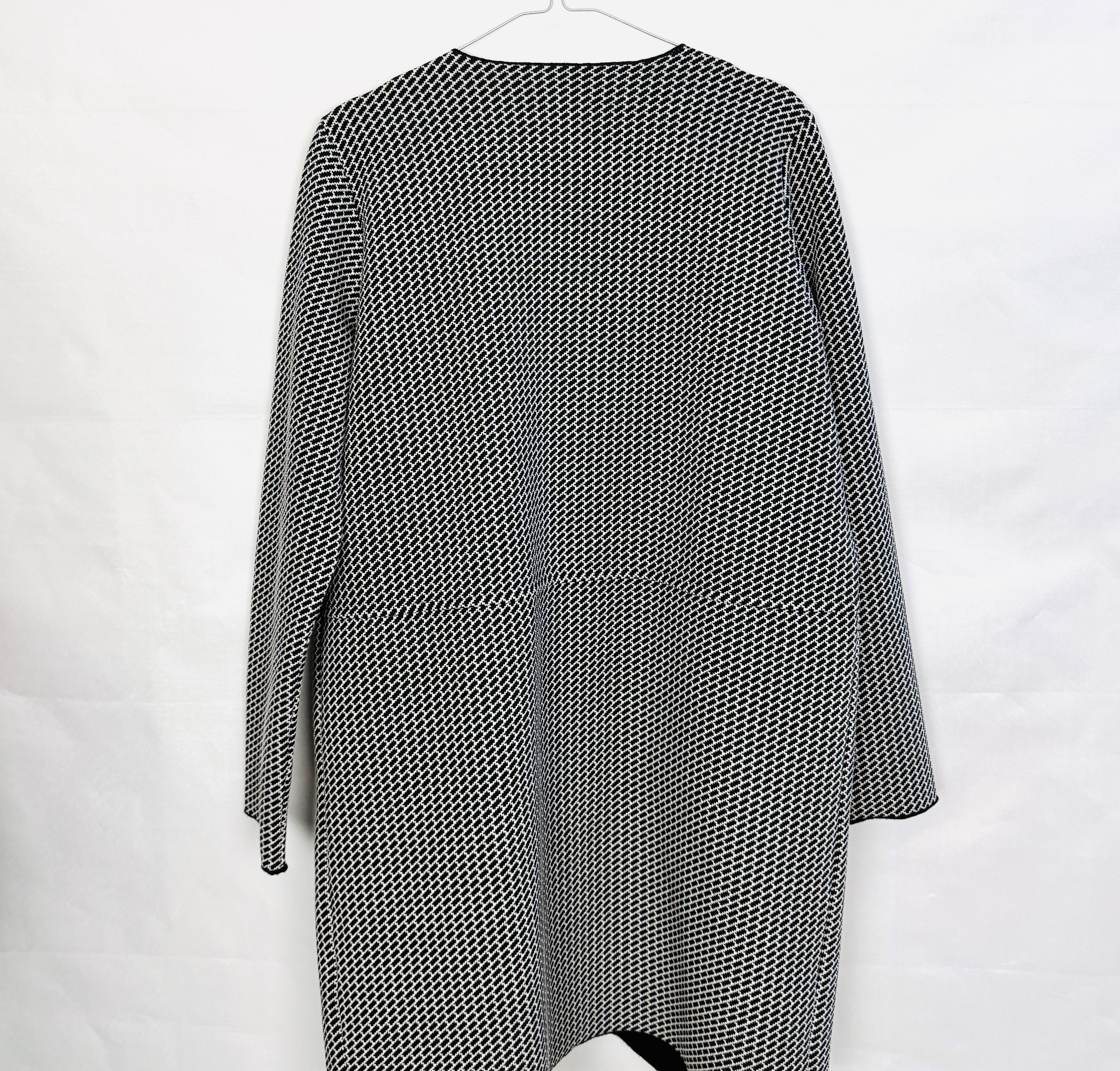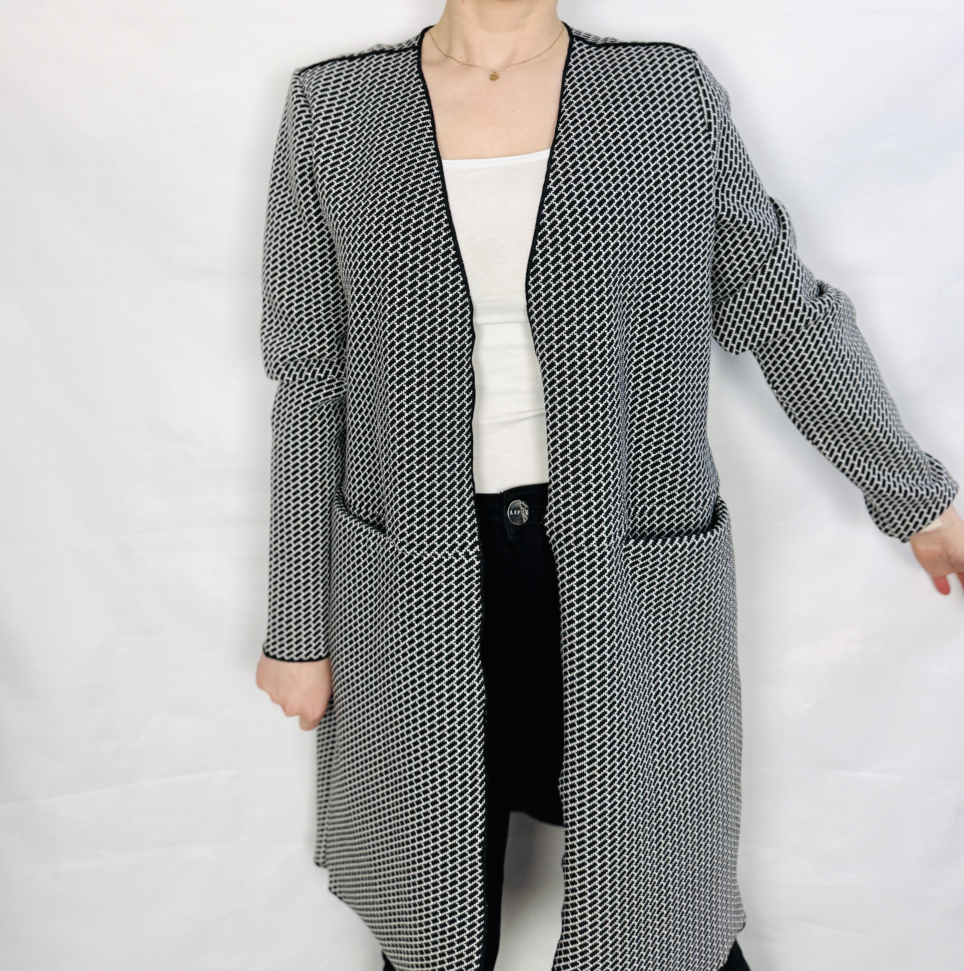 Ta narzutka to elegancka, a zarazem lekko swobodna propozycja, która łączy graficzny charakter wzoru z kobiecą prostotą kroju. Czarno biała kompozycja nadaje jej uniwersalnego, ponadczasowego wyrazu — wygląda świeżo i uporządkowanie, a zarazem wnosi do garderoby mocny, dekoracyjny akcent. Forma wydłużona i otwarty przód sprawiają, że narzutka emanuje spokojem i naturalną klasą, idealną dla tych, które szukają łatwego sposobu na podkreślenie stylu bez nadmiaru dodatków.