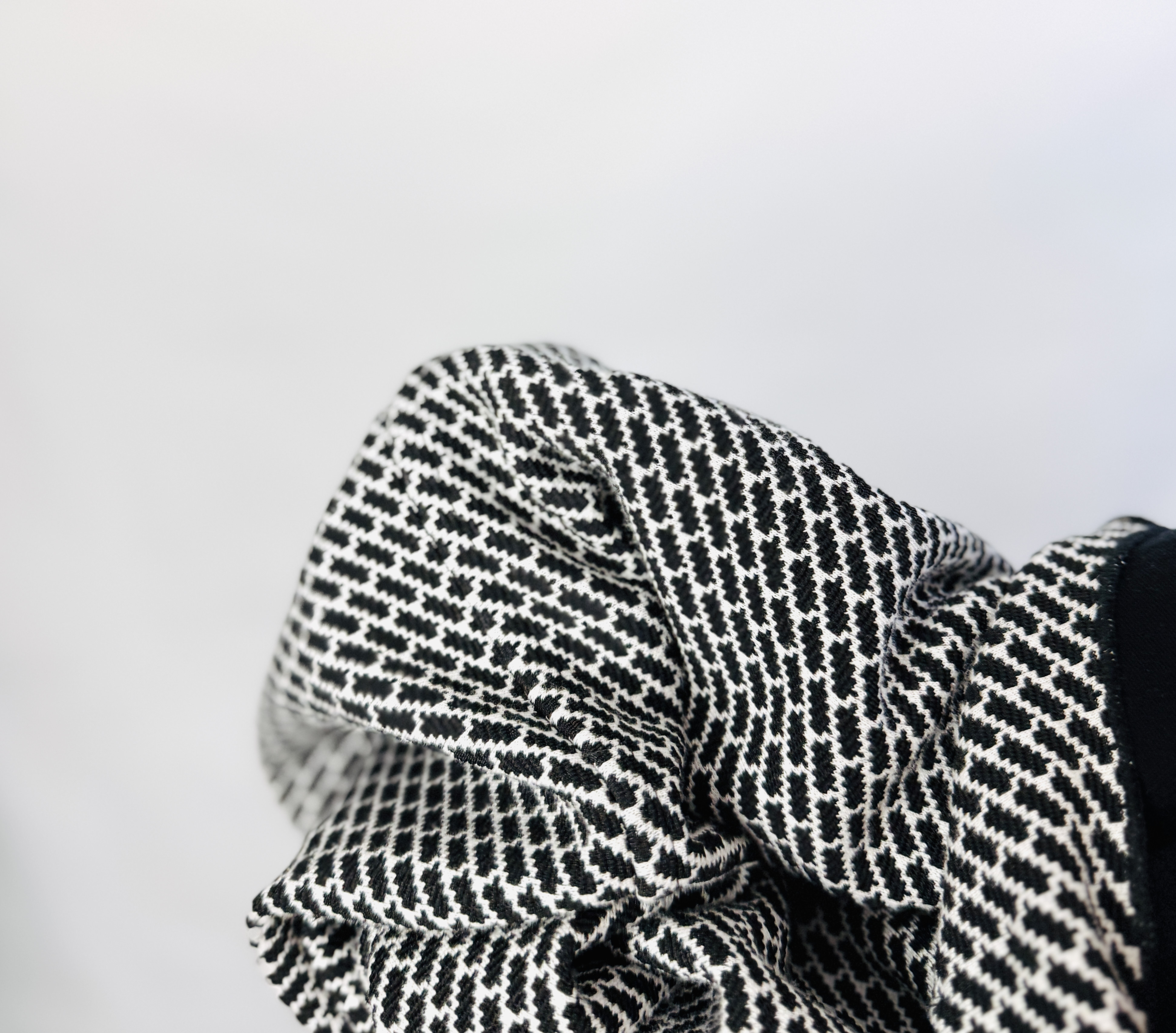 Wzór to drobna, rytmiczna grafika o regularnym charakterze, która tworzy efekt delikatnego odpływu światła i cienia; ta geometryczna struktura nadaje tkaninie dekoracyjnej głębi, nie przytłaczając przy tym sylwetki. Materiał prezentuje się jako miękko układający się, o lekko uporządkowanej fakturze — jest raczej lekki niż ciężki, co pozwala narzutce pięknie falować przy ruchu i wygodnie układać się w warstwach. Wykończenie brzegu i kieszeni jest dyskretne i schludne, podkreślając staranne detale konstrukcyjne.