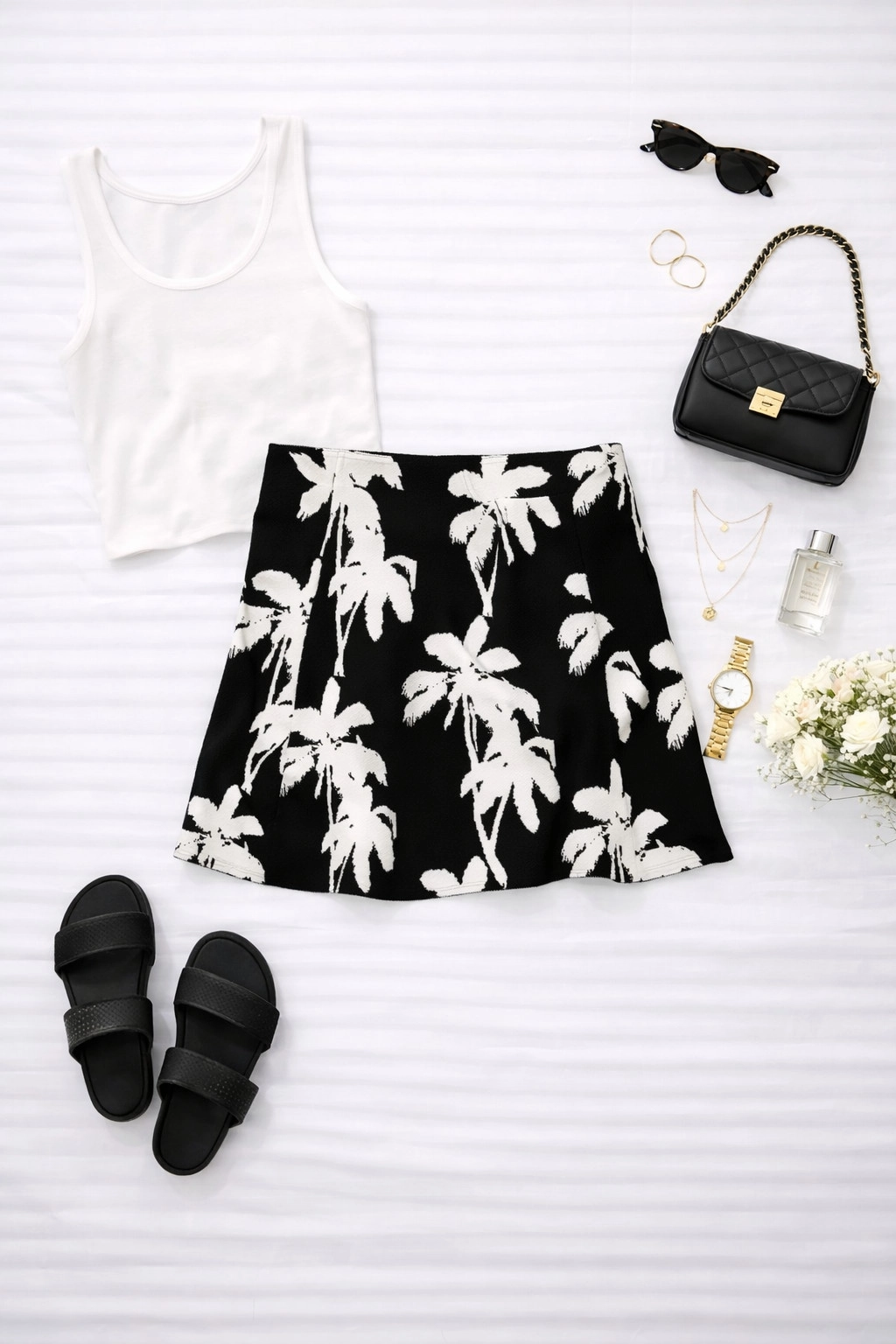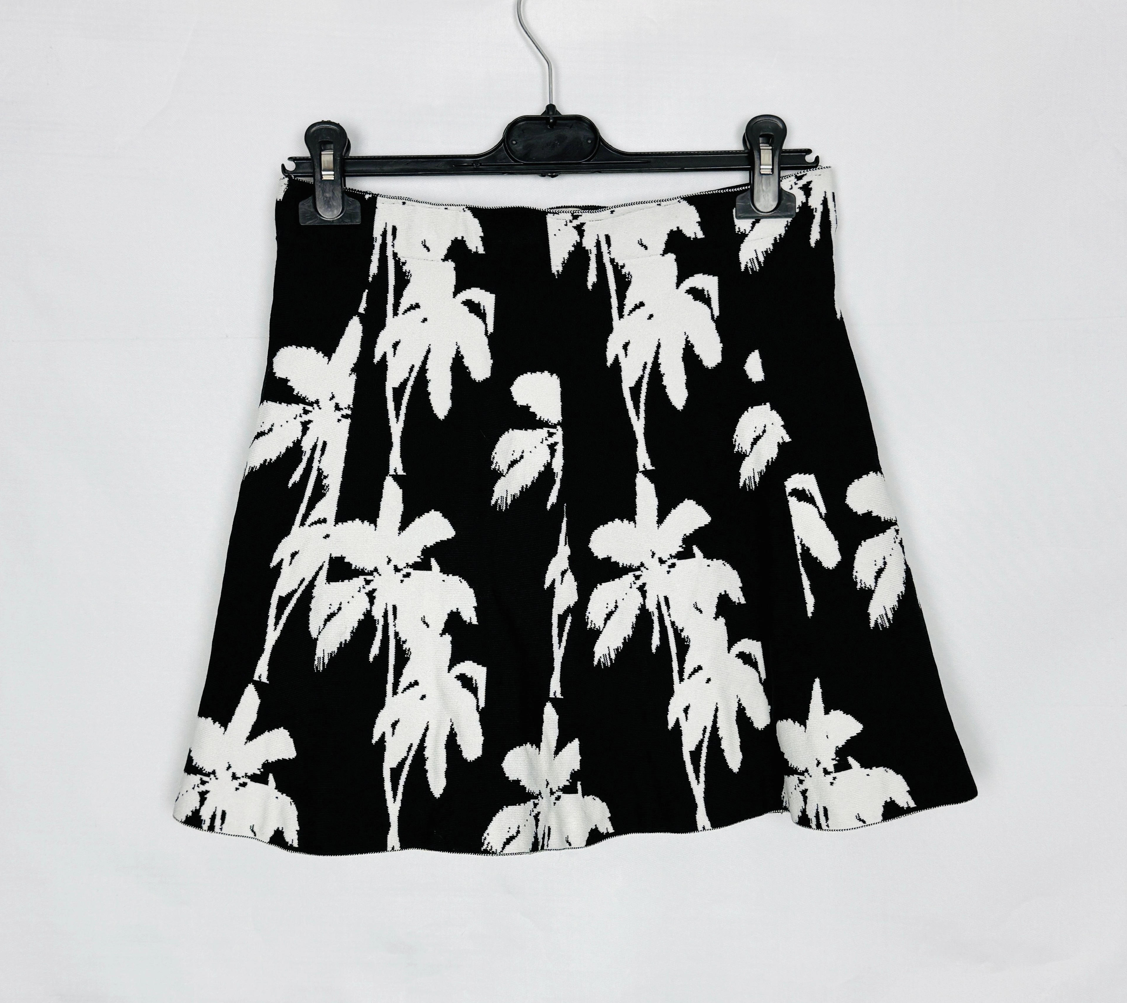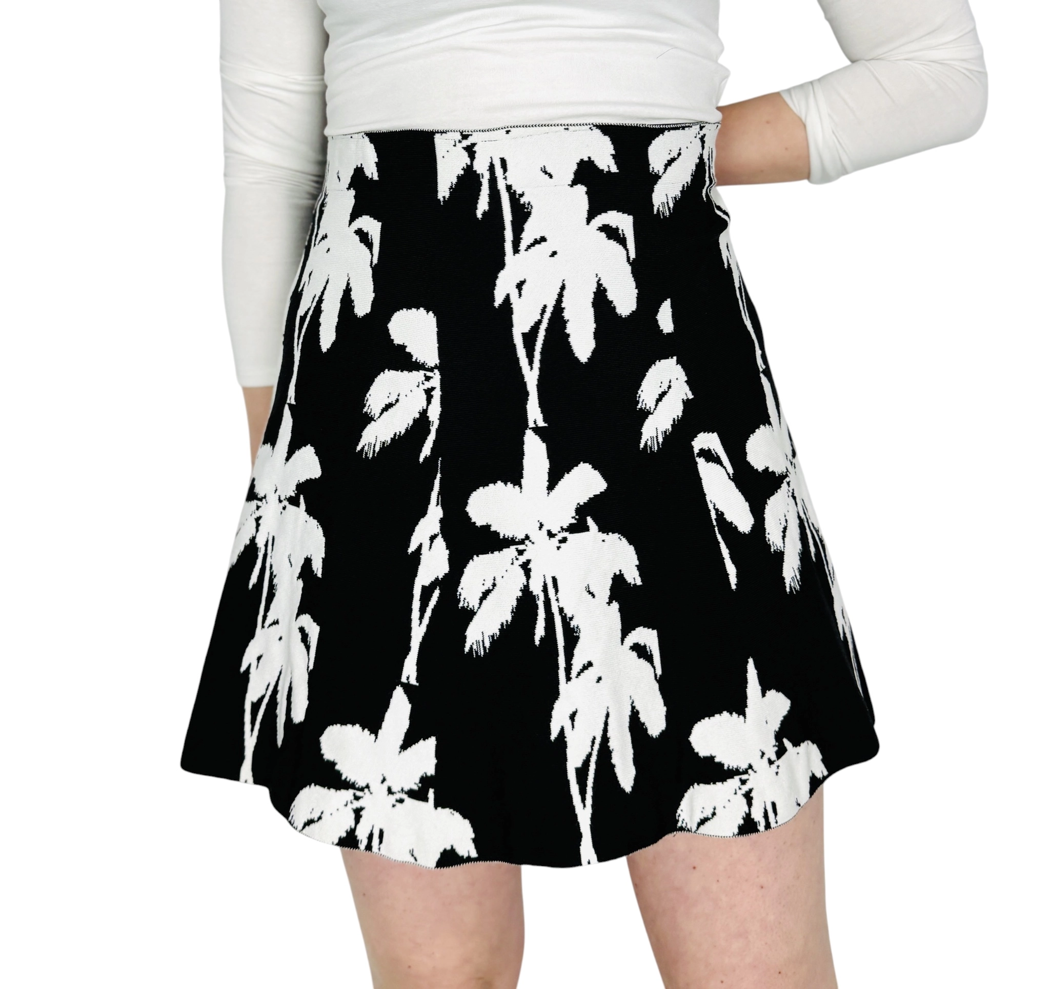 Ta spódnica to radosne przywołanie letniej energii i nastrojowego, wakacyjnego klimatu, zamknięte w klasycznej, czarno białej kolorystyce. Wyrazisty motyw białych palm na głębokim, czarnym tle od razu przyciąga uwagę, nadając stylizacji dynamicznego i nowoczesnego charakteru. To projekt, który nienagannie łączy w sobie radosną swobodę z nastrojową elegancją, będąc radosnym wyborem dla kobiet, które chcą czuć się nastrojowo i stylowo zarówno podczas spaceru brzegiem morza, jak i w nienagannym, miejskim zgiełku.
