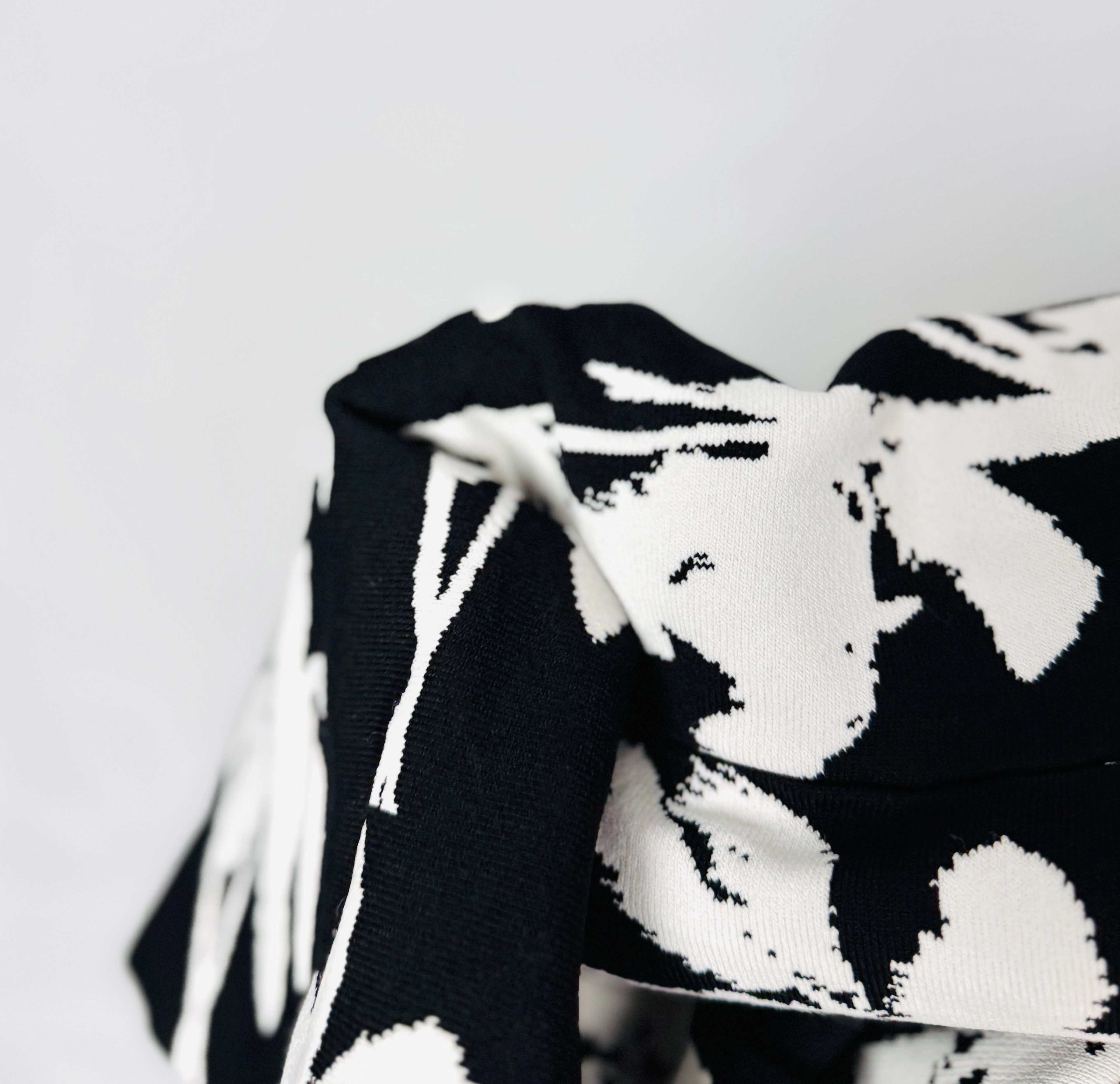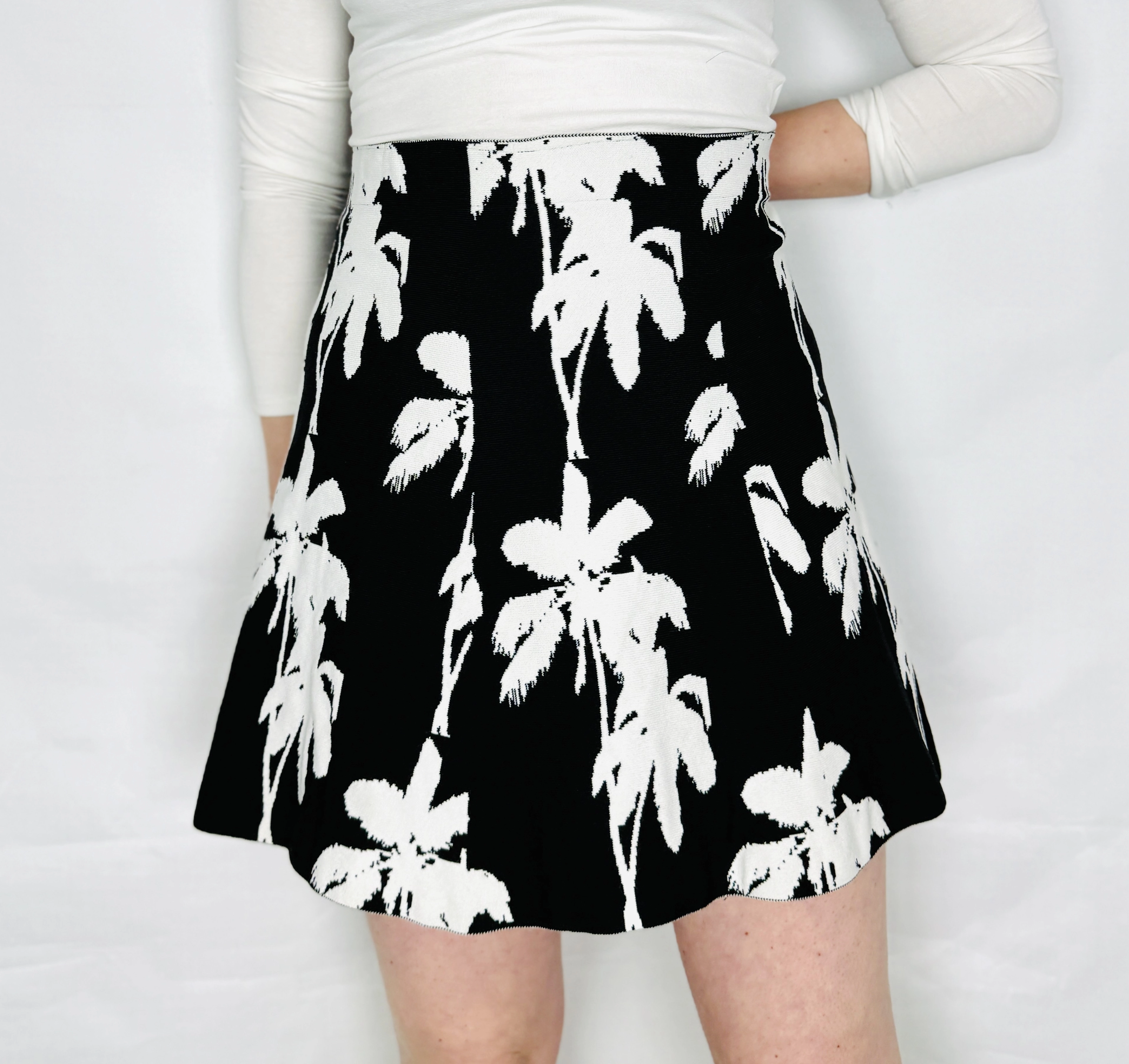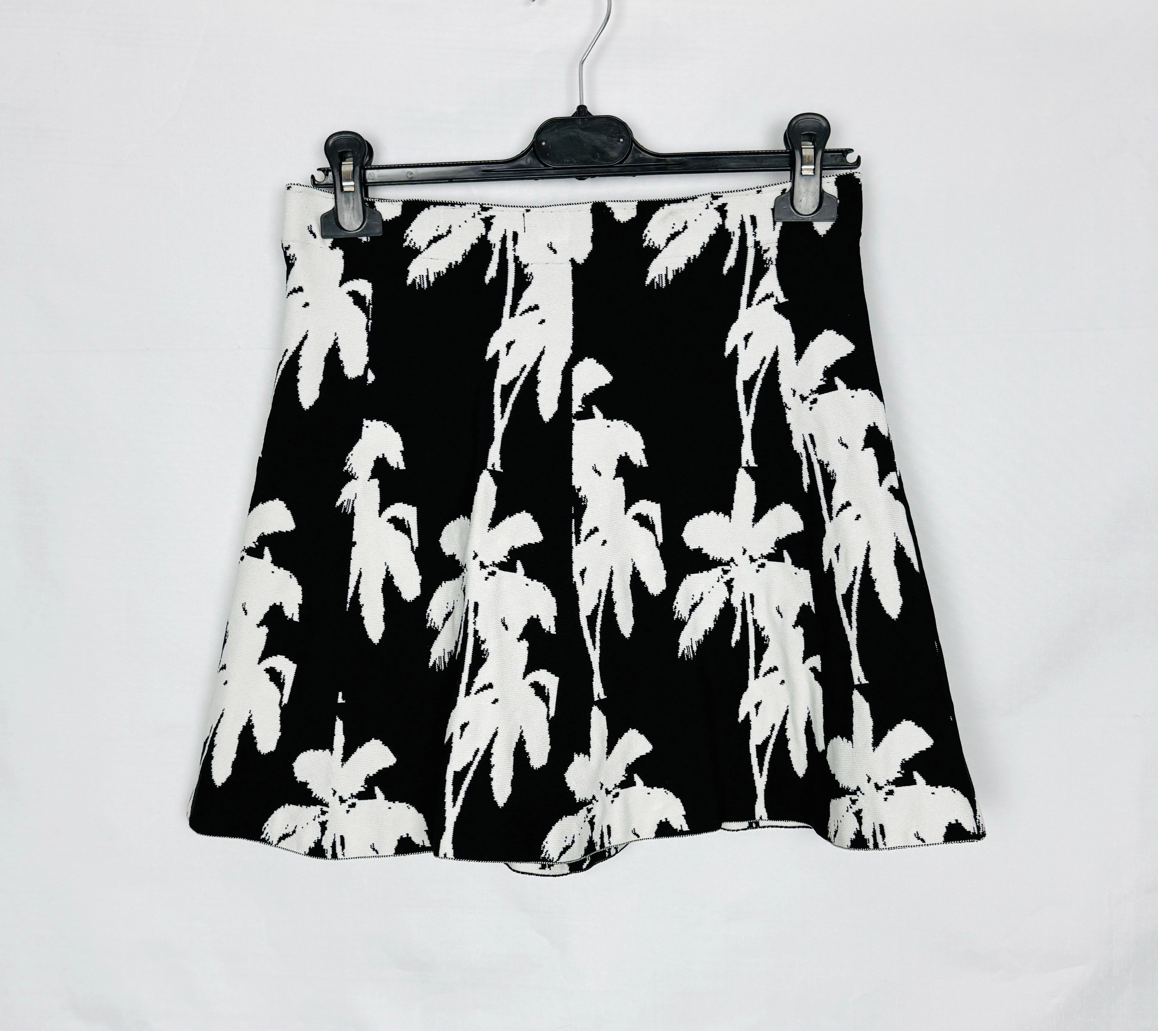 Ta spódnica to radosne przywołanie letniej energii i nastrojowego, wakacyjnego klimatu, zamknięte w klasycznej, czarno białej kolorystyce. Wyrazisty motyw białych palm na głębokim, czarnym tle od razu przyciąga uwagę, nadając stylizacji dynamicznego i nowoczesnego charakteru. To projekt, który nienagannie łączy w sobie radosną swobodę z nastrojową elegancją, będąc radosnym wyborem dla kobiet, które chcą czuć się nastrojowo i stylowo zarówno podczas spaceru brzegiem morza, jak i w nienagannym, miejskim zgiełku.