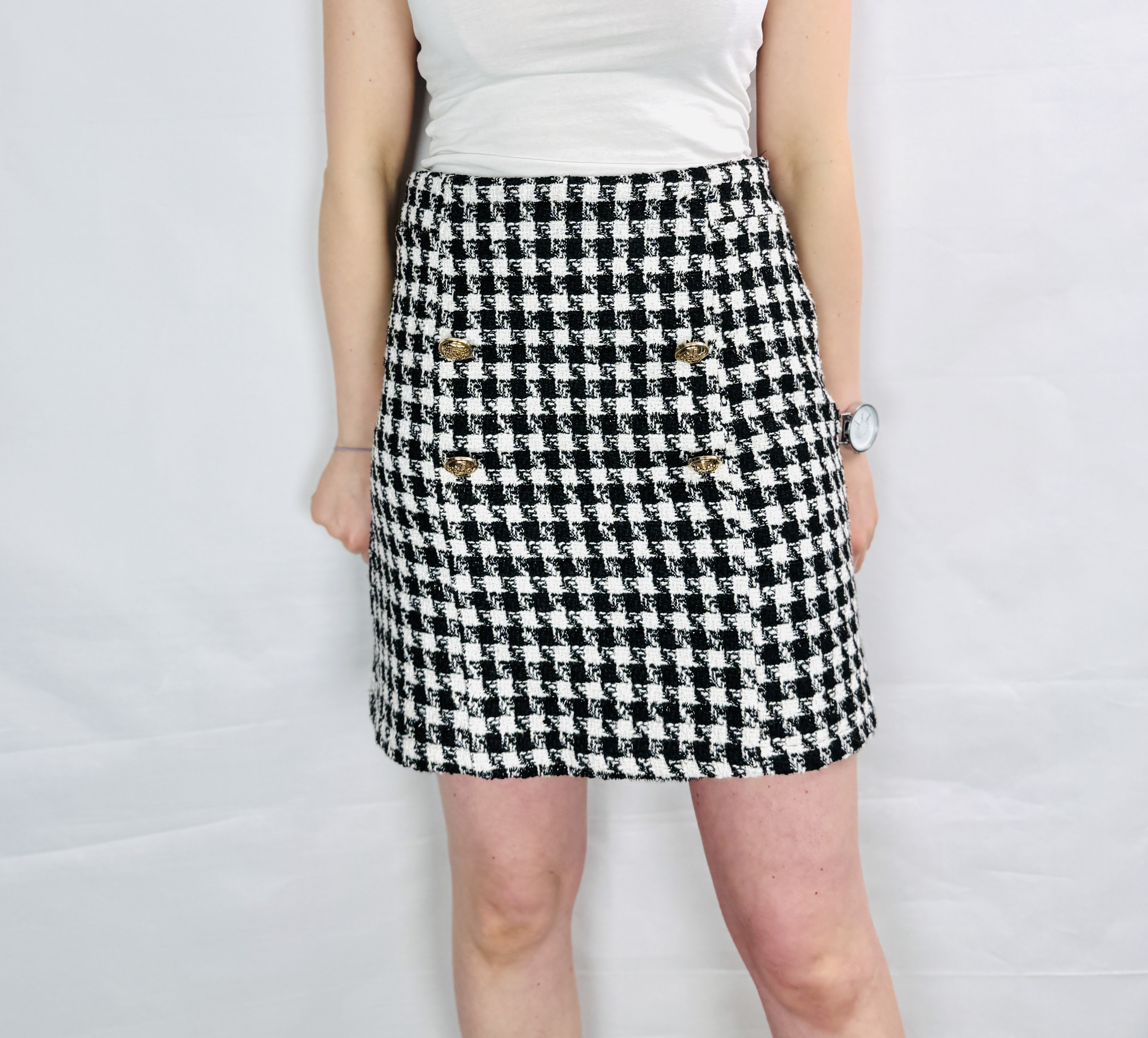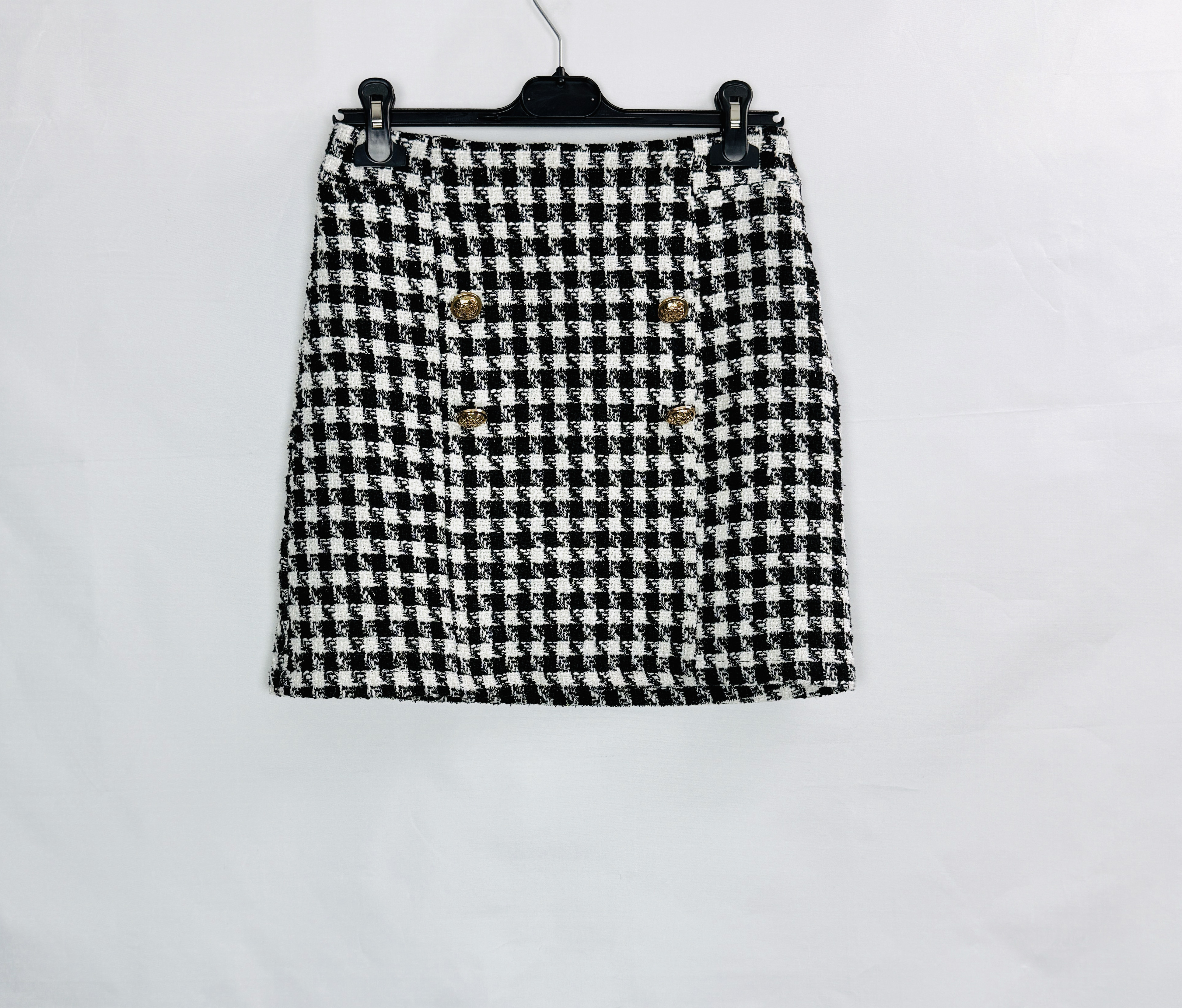 Krój spódnicy jest prosty, lekko dopasowany w biodrach z minimalnym, subtelnym rozszerzeniem ku dołowi, dzięki czemu otrzymuje klasyczną, kobiecą proporcję sięgającą nad kolano. Górna linia została wyraźnie podkreślona podwyższonym pasem, który porządkuje talię i optycznie wydłuża nogi. Na przodzie znajdują się cztery dekoracyjne, złote guziki ułożone w dwie równe pary — to elegancki akcent, który ożywia wzór pepitki i nadaje całości szykownego tonu. Dolna krawędź wykończona jest równo i estetycznie, co podkreśla uporządkowaną formę spódnicy.