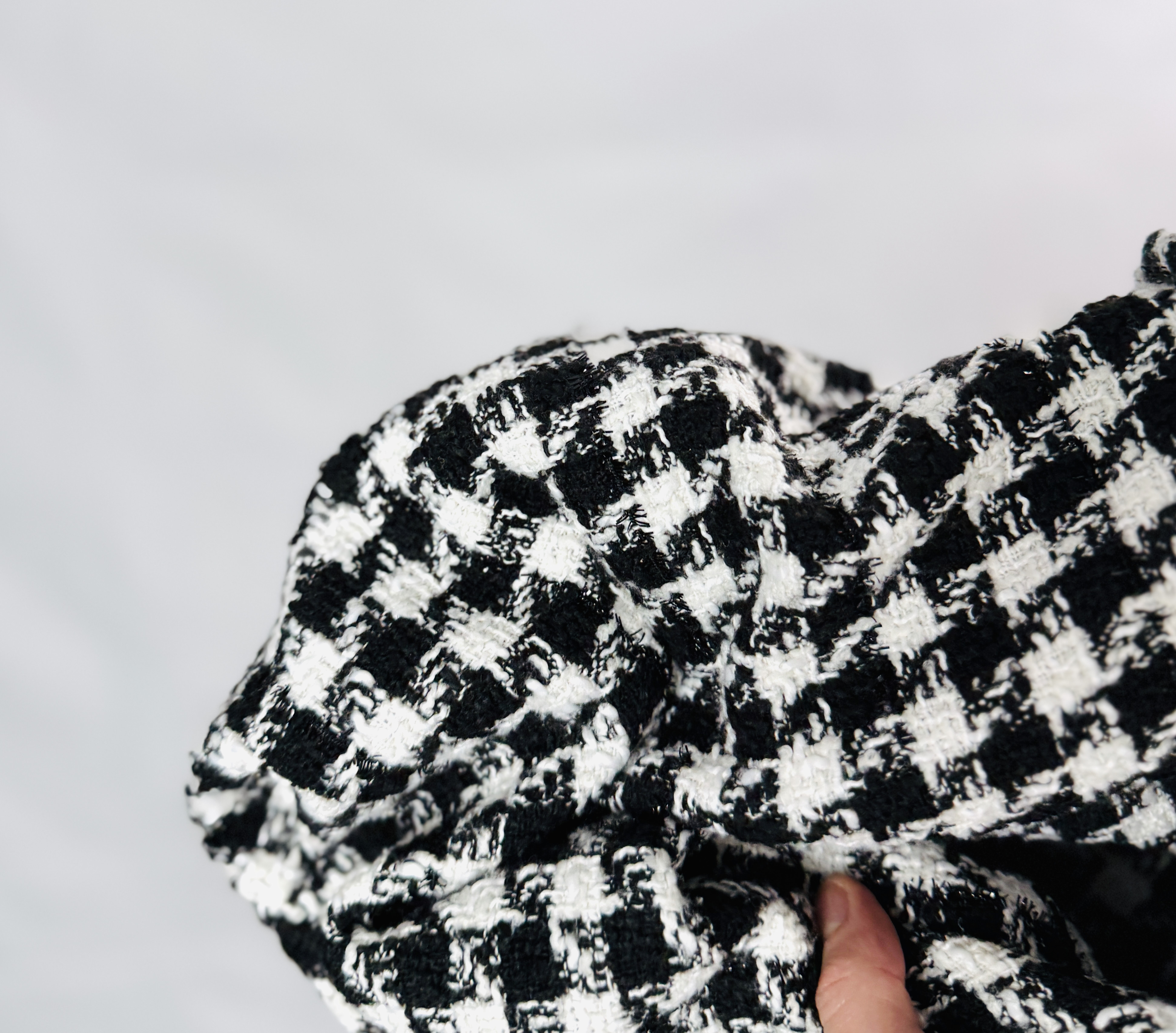 Materiał prezentuje się jako nieco grubszy i otulający, o wyraźnej, tkanej strukturze z delikatnie chropowatą powierzchnią; tkanina trzyma formę, dzięki czemu wzór pepitki pozostaje czytelny, a sylwetka zachowuje uporządkowaną linię. Powierzchnia ma matowe wykończenie, które dodaje projektowi stonowanej elegancji, a jednocześnie sprawia wrażenie ciepła i jakości. Splot materiału nadaje wyrazistości fakturze, co sprawia, że spódnica wygląda starannie i luksusowo, mimo oszczędnej formy.