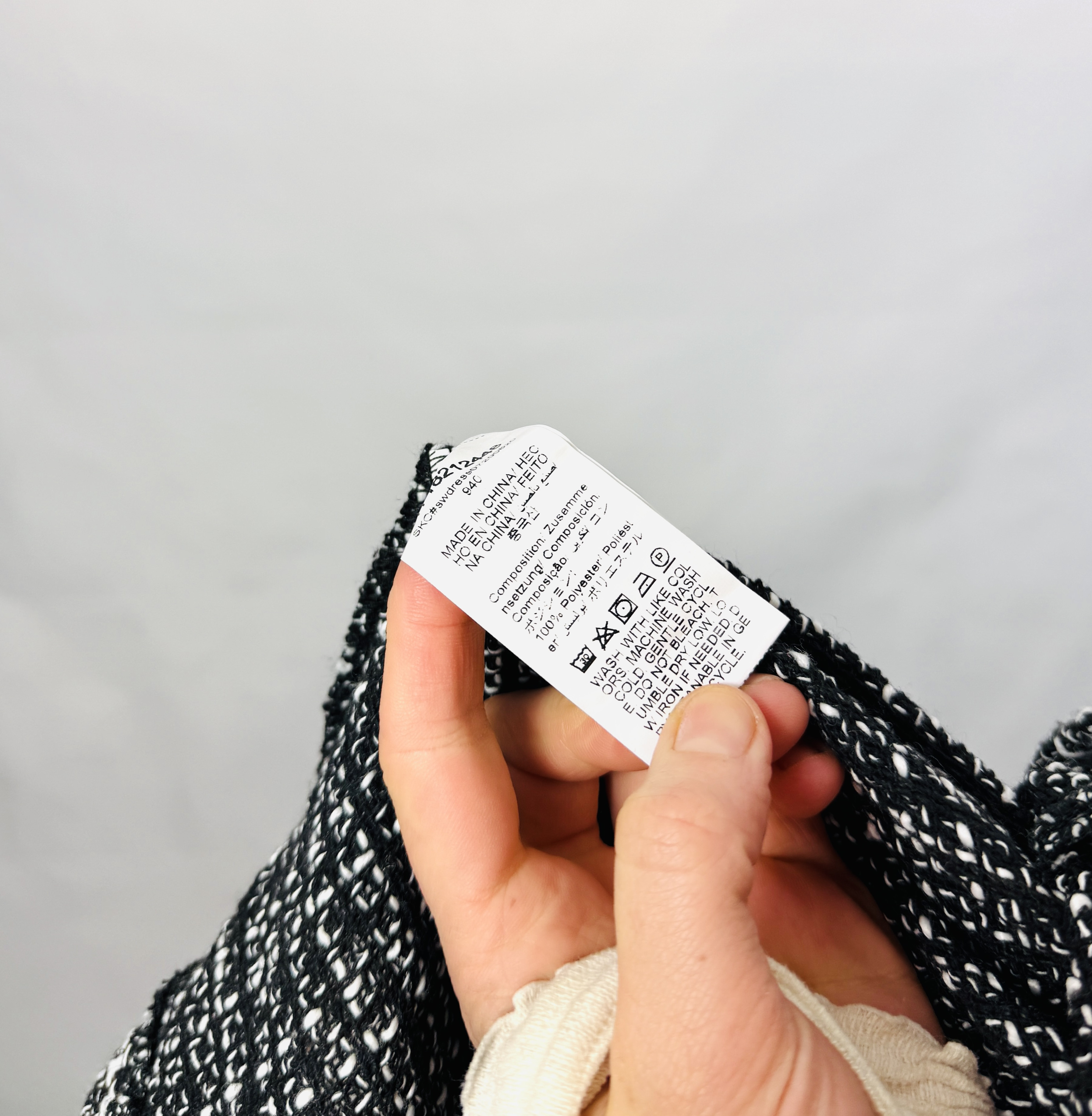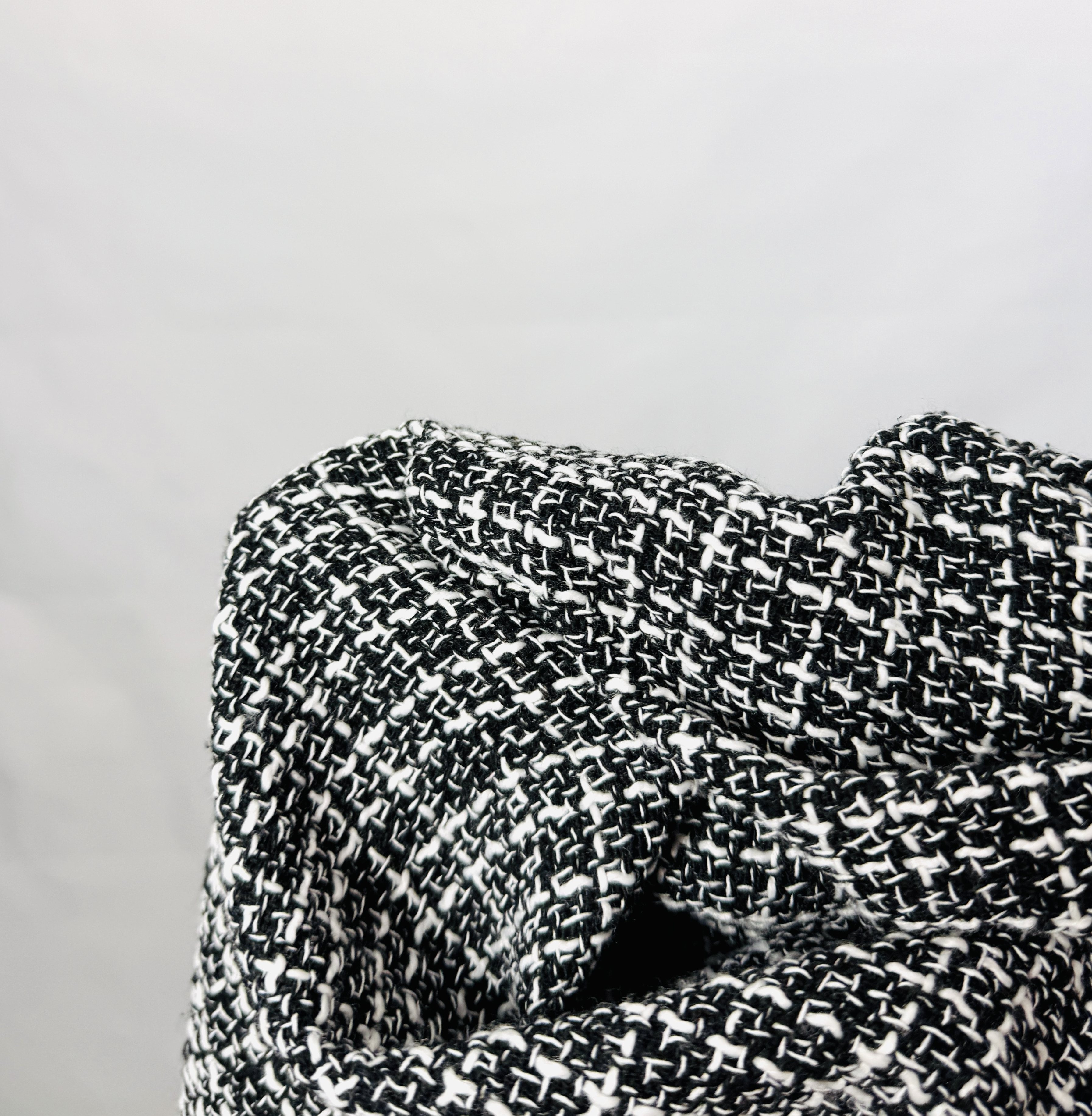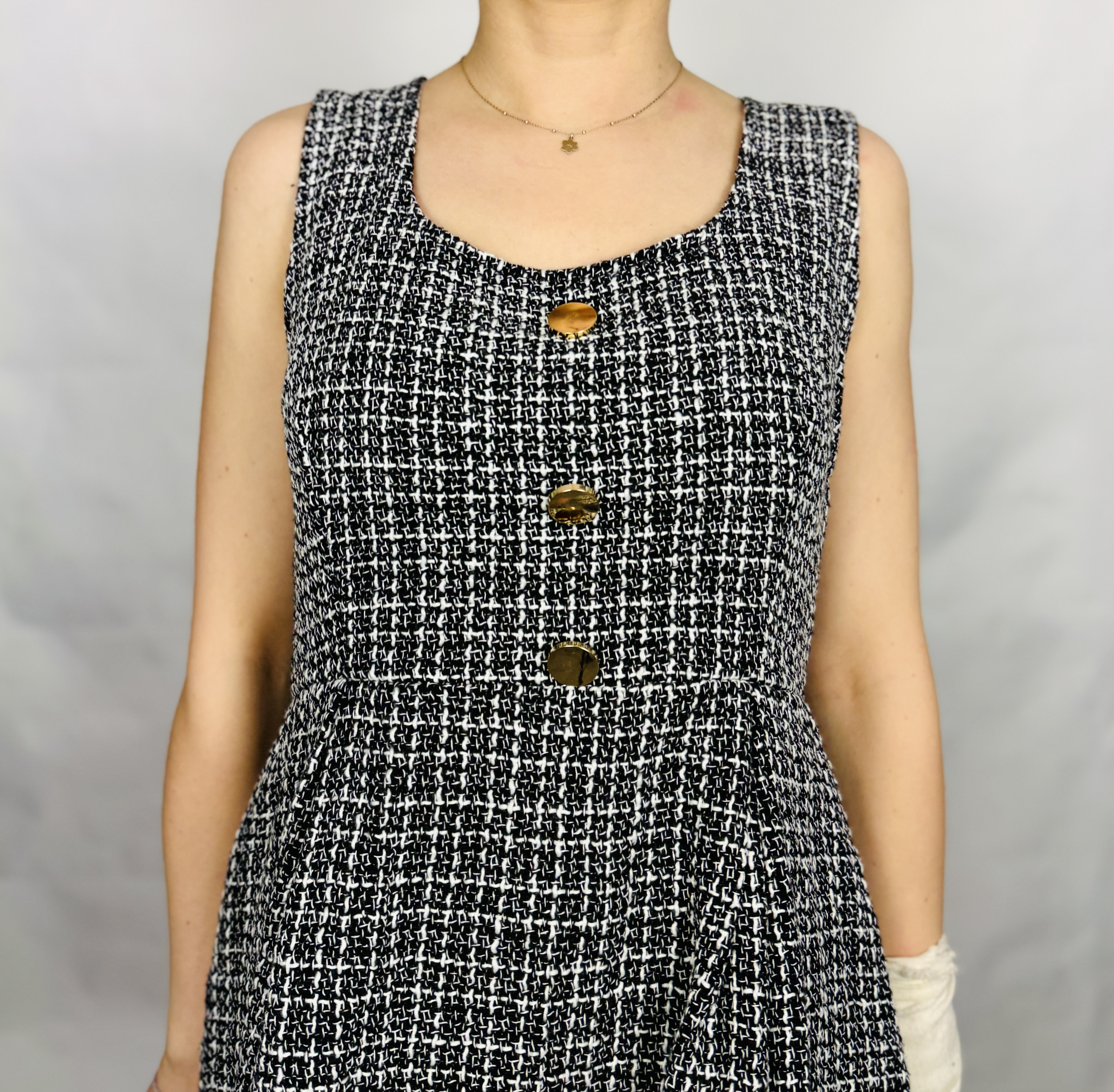 Materiał prezentuje się jako nieco grubszy i strukturalny, o wyraźnej fakturze przypominającej klasyczny tweed czy splot kraty, dzięki czemu sukienka zachowuje formę i kształt. Taka tkanina nadaje konstrukcji stabilności — góra jest uporządkowana i modelująca, natomiast dół pozostaje lekki i swobodny. Wizualnie fason wysmukla tułów i podkreśla talię, a dzięki rozkloszowanemu dołowi sprzyja maskowaniu bioder i subtelnemu zrównoważeniu proporcji, co sprawdzi się zarówno przy sylwetce klepsydry, jak i gruszki czy prostokąta.