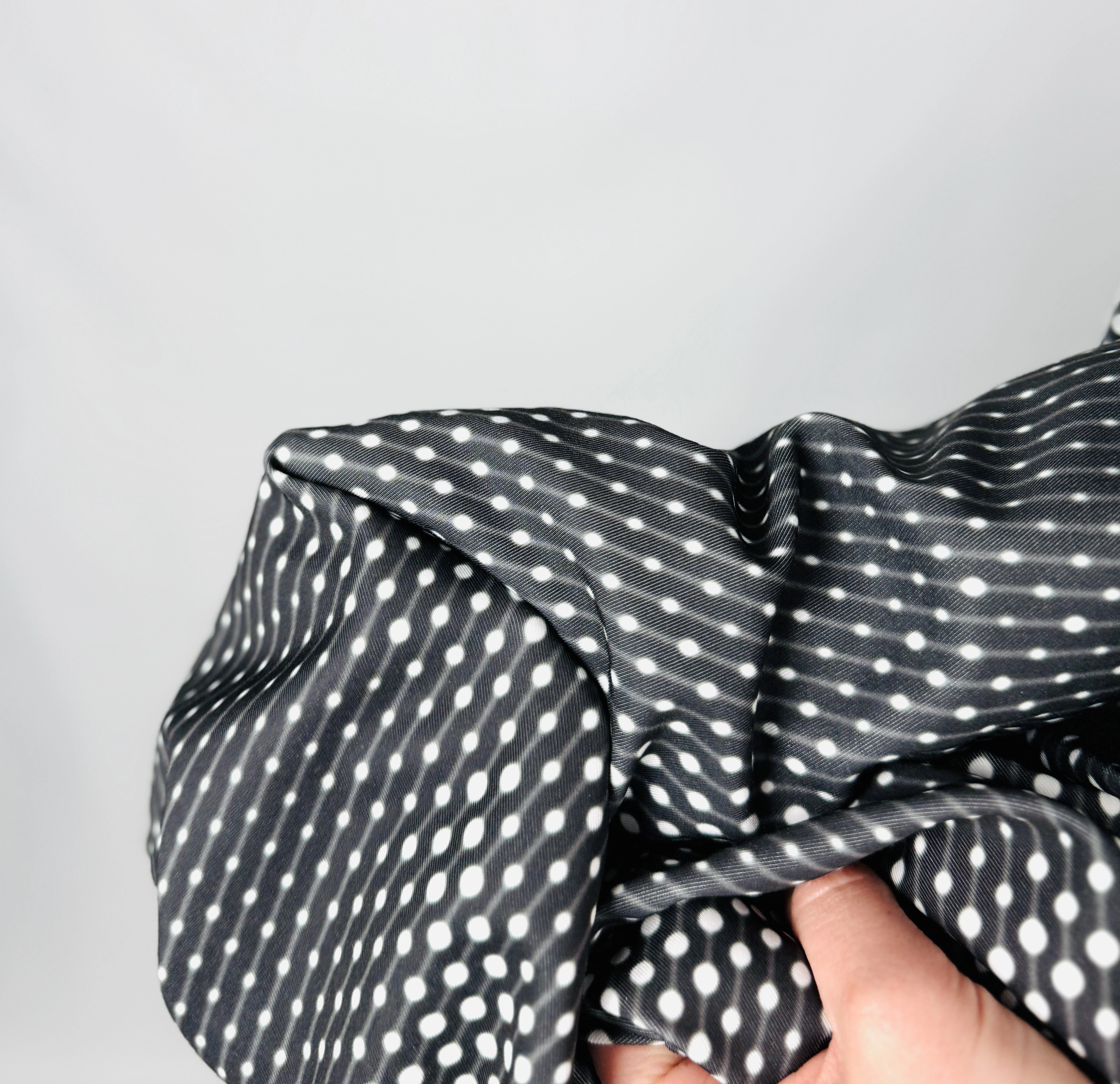 Wizualna strona produktu opiera się na kontraście czerni i bieli, który został wykorzystany w sposób bardzo przemyślany. Geometryczny motyw drobnych kropek, które w niektórych miejscach zagęszczają się, tworząc iluzję przejść tonalnych i skośnych linii, pozwala na sprytne manipulowanie proporcjami sylwetki. Na dole jednej z nogawek widać subtelny detal, który podkreśla markowy charakter ubrania, harmonijnie wpisując się w czarno-białą kolorystykę. Materiał wygląda na zwarty i odpowiednio gruby, co pozwala uniknąć nieestetycznego prześwitywania, jednocześnie zachowując lekkość i elastyczność niezbędną przy każdym rodzaju aktywności fizycznej, od jogi po trening siłowy.