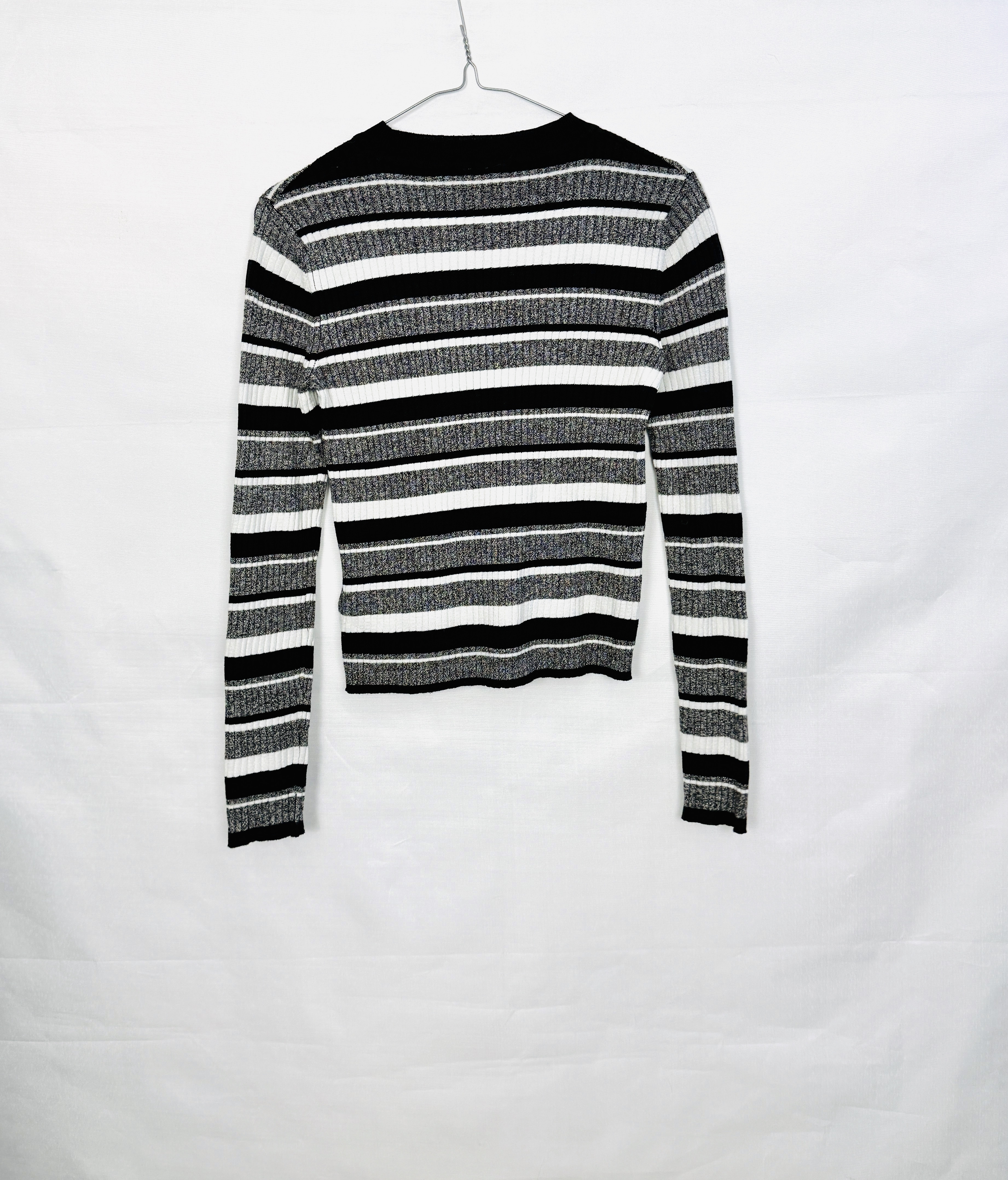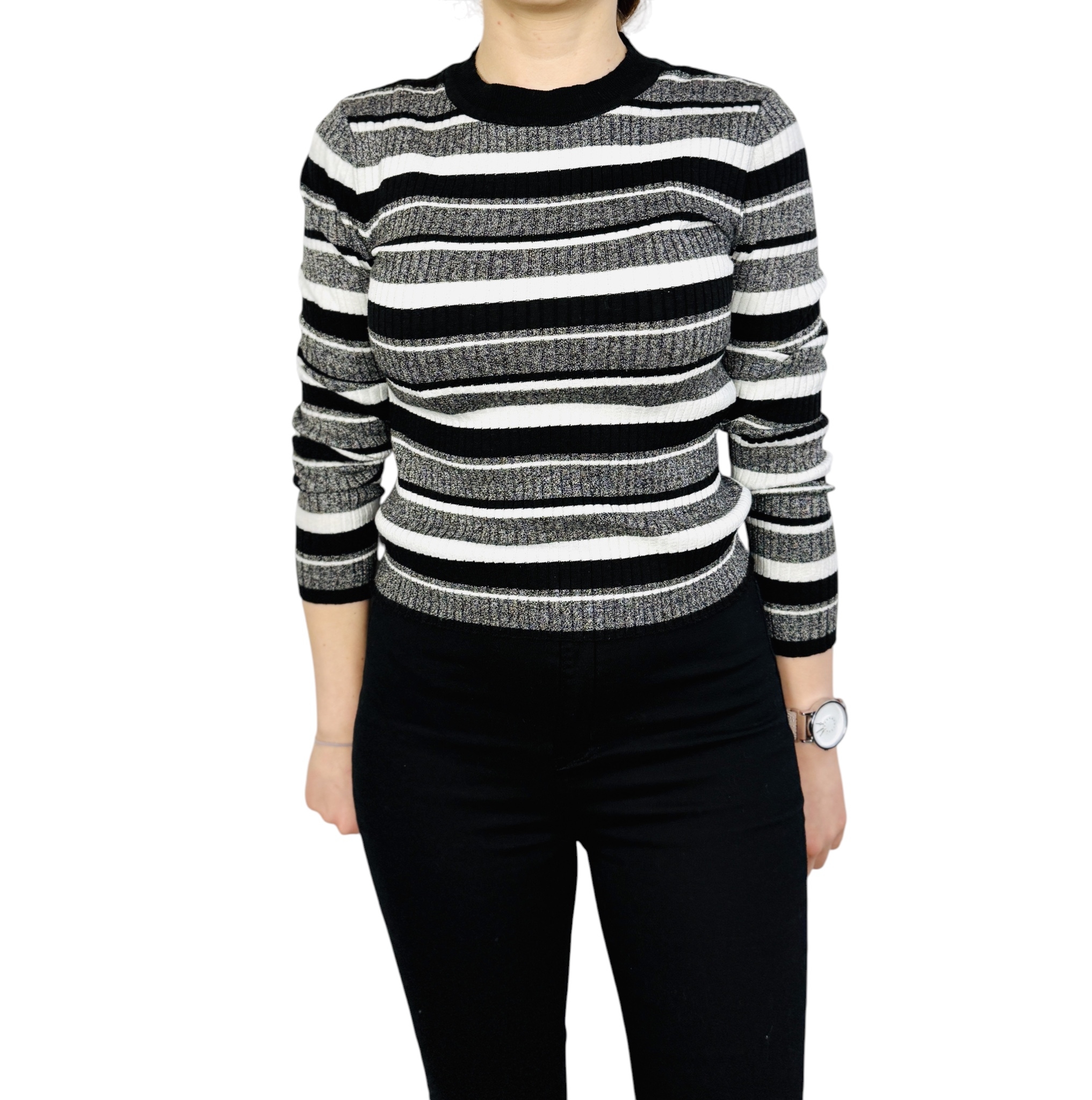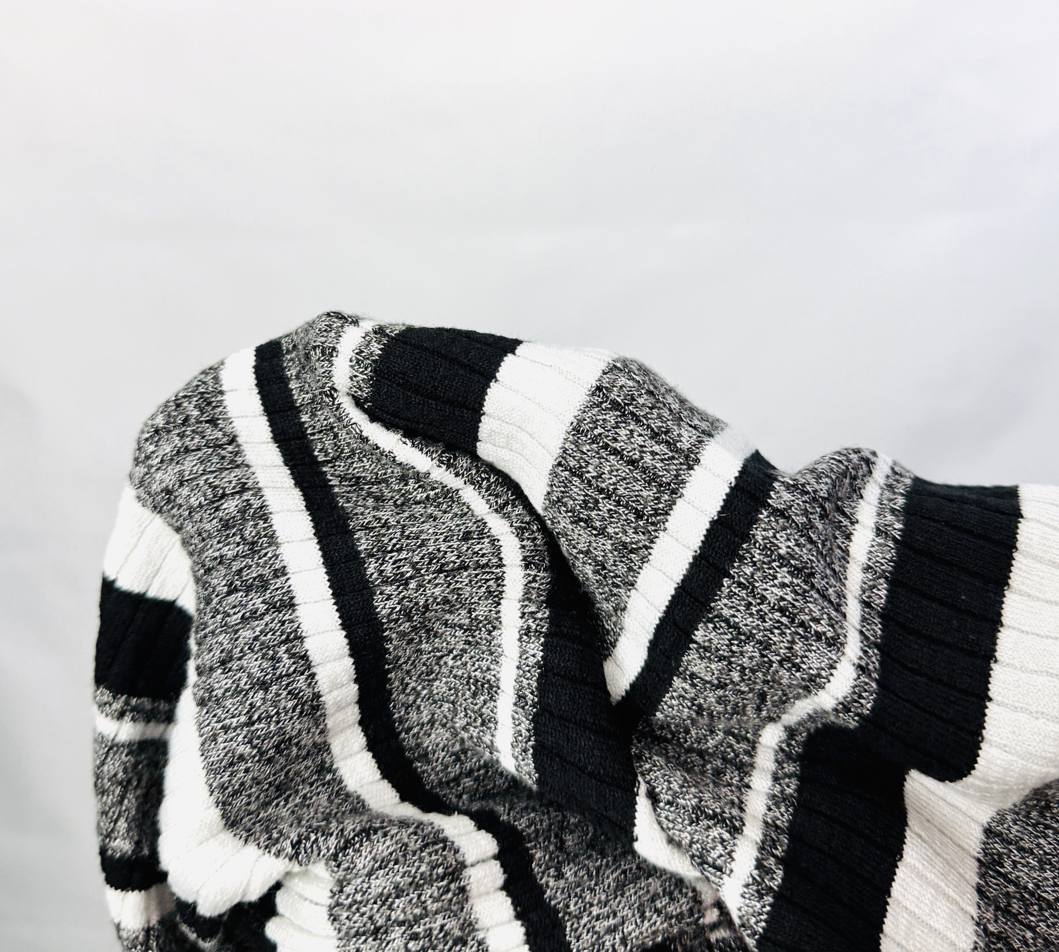 To ponadczasowy sweter, który łączy w sobie prostotę i wyrazisty charakter dzięki rytmicznym, poziomym paskom. Kontrast czerni i bieli przełamany jest odcieniami szaro, co nadaje całości eleganckiej, miejskiej nuty i sprawia, że sweter jest zarówno klasyczny, jak i nowoczesny. Prążkowana struktura tkaniny oraz harmonijne przejścia kolorystyczne tworzą ciekawą fakturę, dzięki której prosta forma nabiera wyrazu i subtelnej głębi.