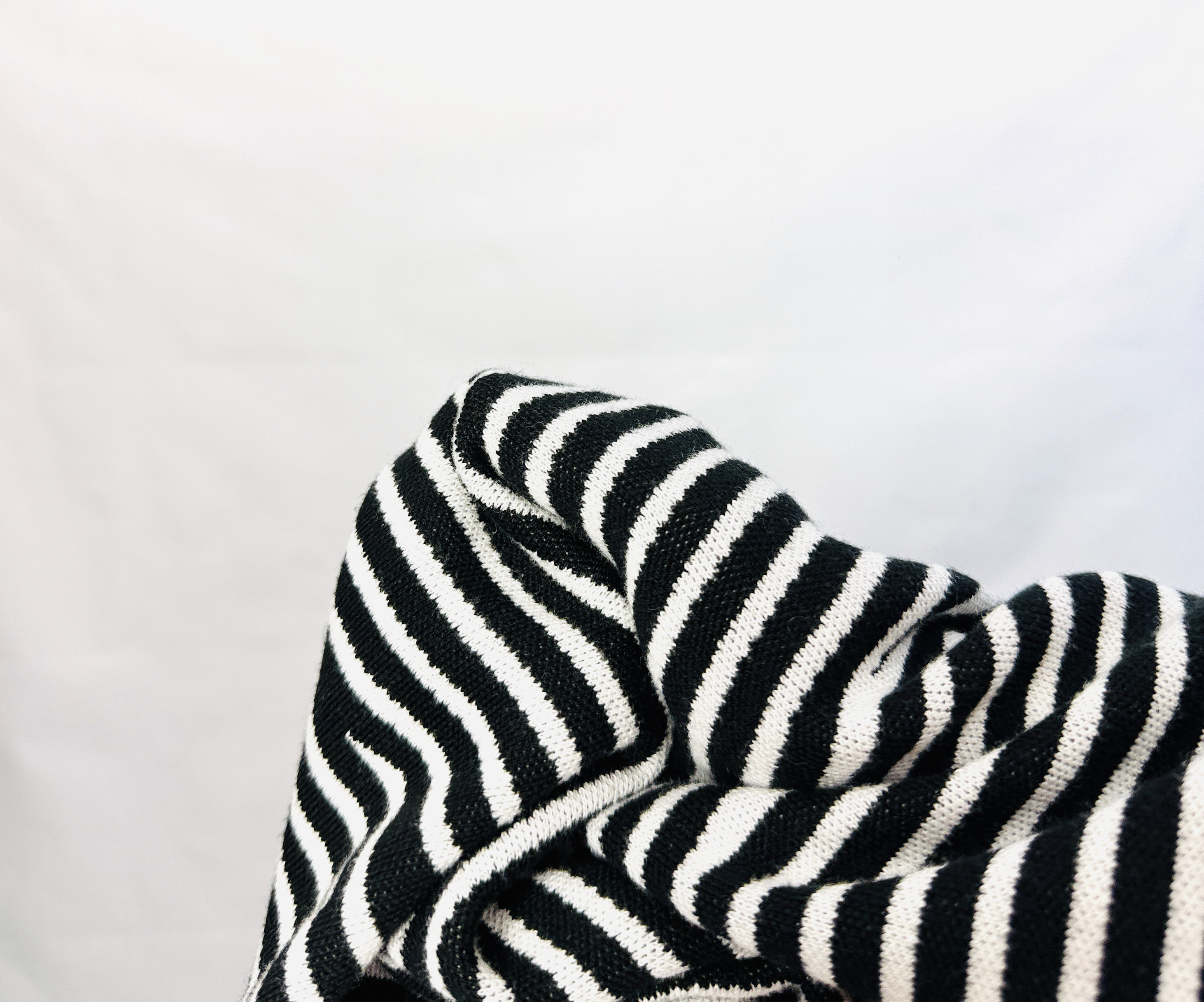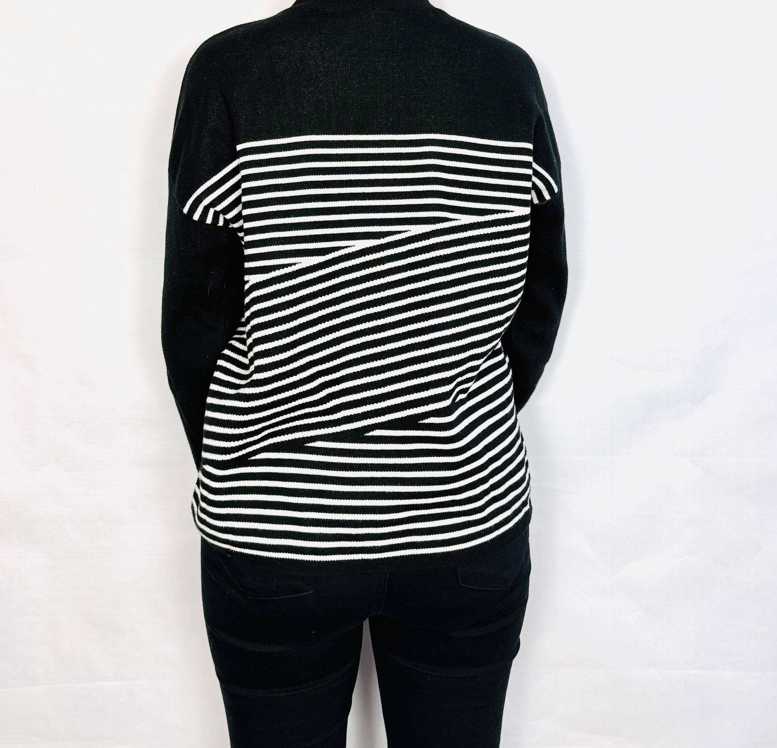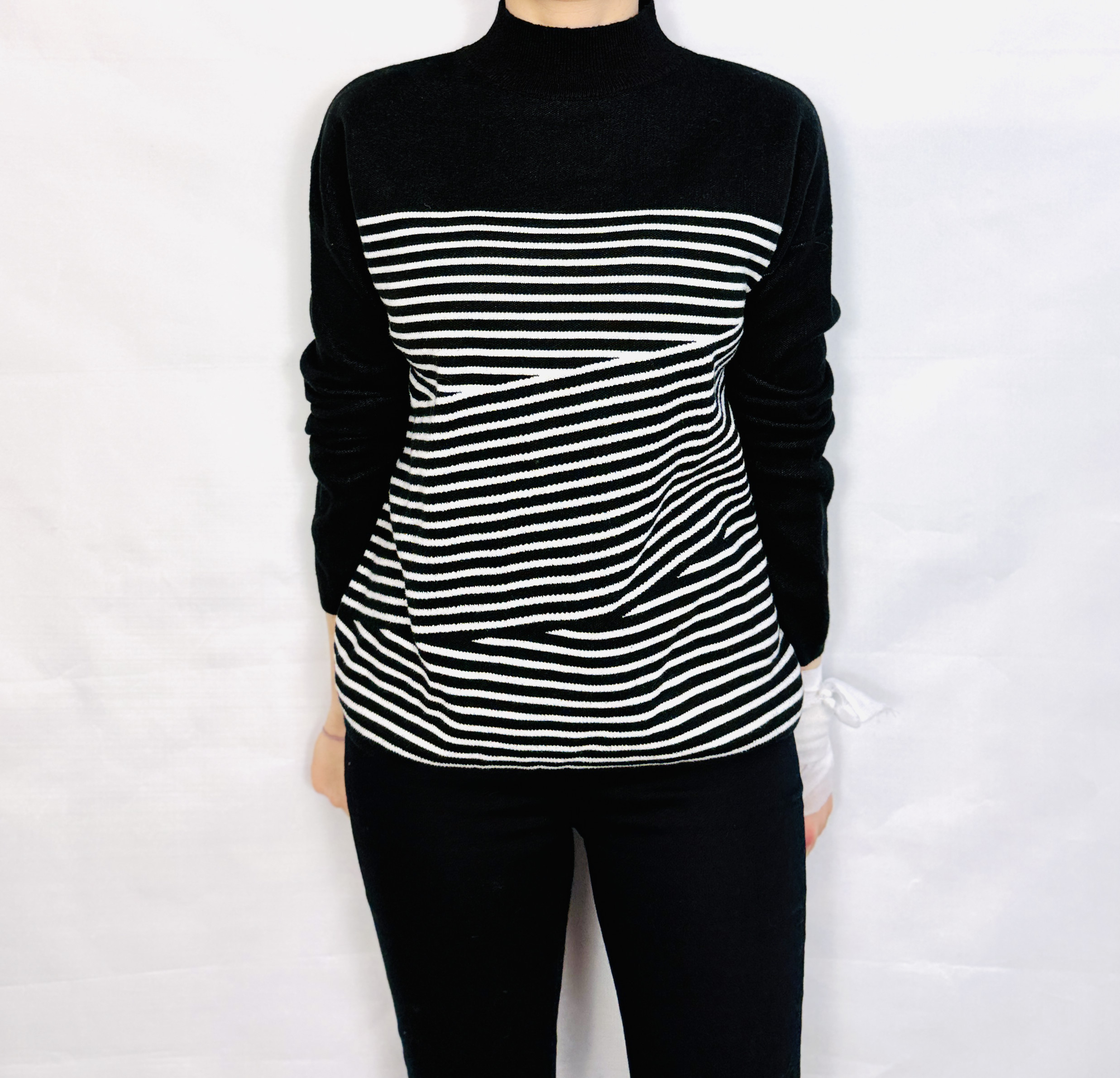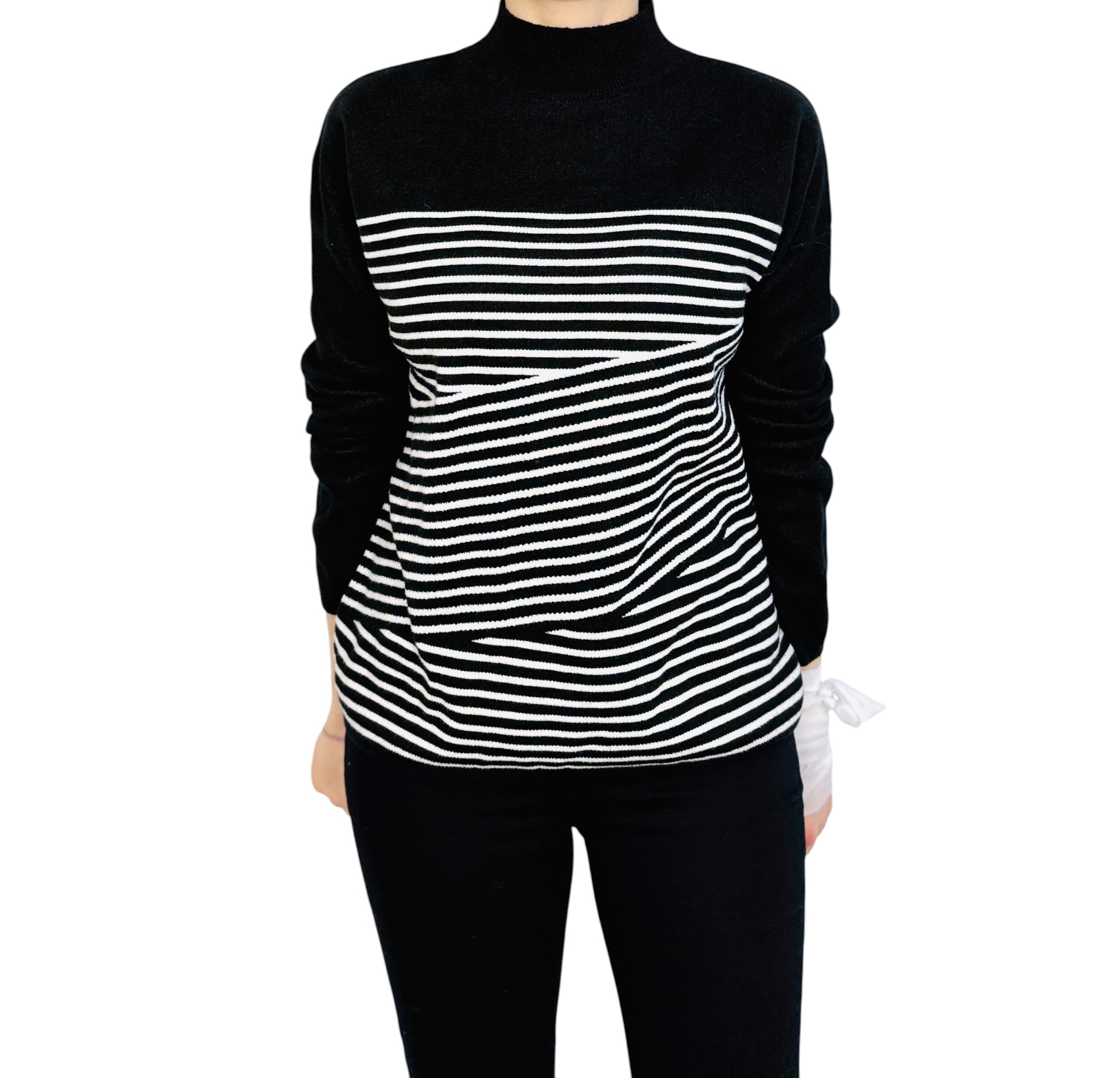 Główna część sweterka ozdobiona jest regularnymi, wąskimi paskami w kontrastowej bieli, które na wysokości talii zmieniają kierunek i układają się subtelnie ukośnie, dodając formie optycznego modelowania. Powierzchnia tkaniny wygląda na gładką i lekko sprężystą, miękko układającą się przy ruchu, co tworzy efekt dopasowania bez nadmiernego opinania. Wykończenia przy szyi, mankietach i dole są gładkie i staranne, co podkreśla dopracowaną formę i daje wrażenie jakościowego, uporządkowanego projektu.