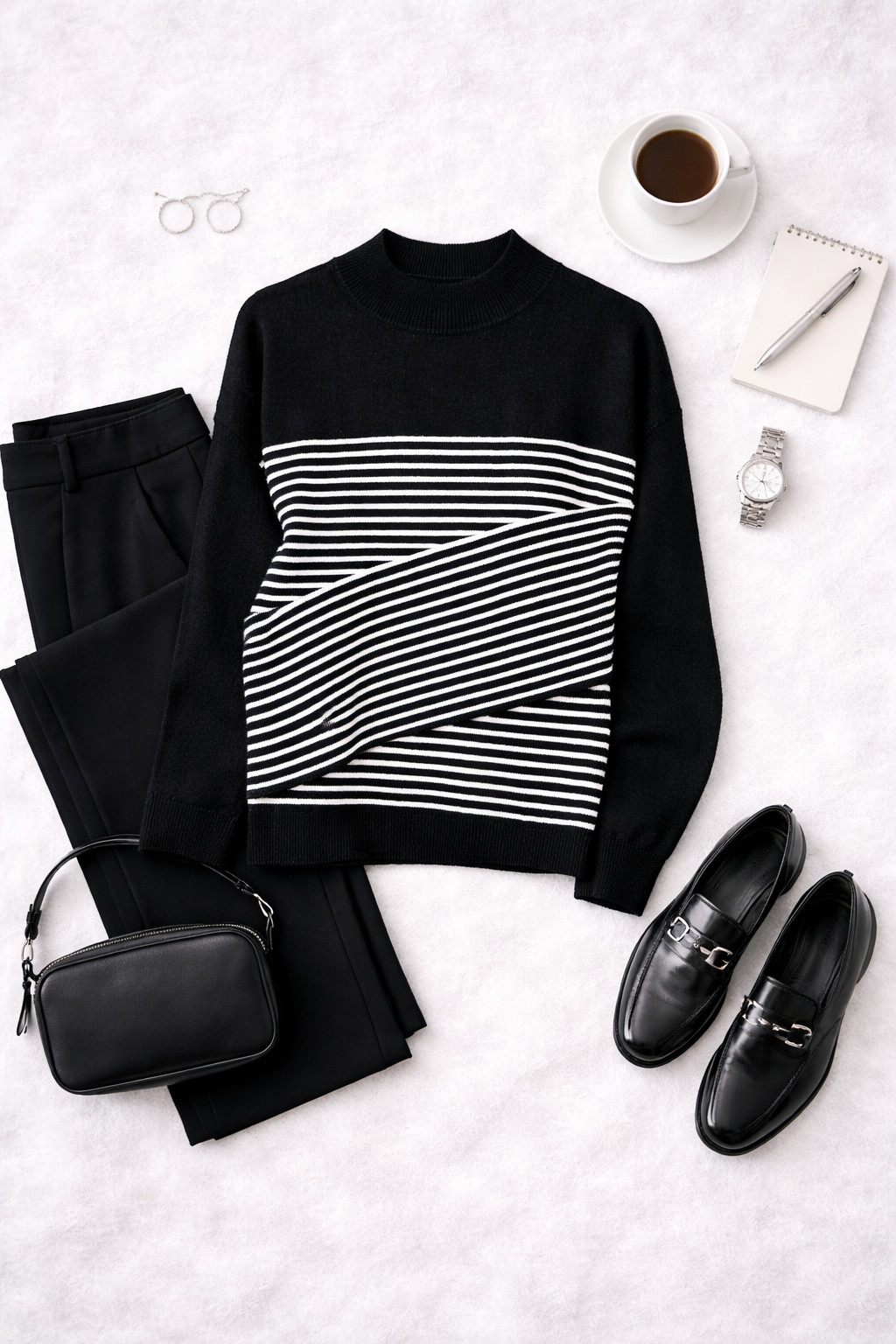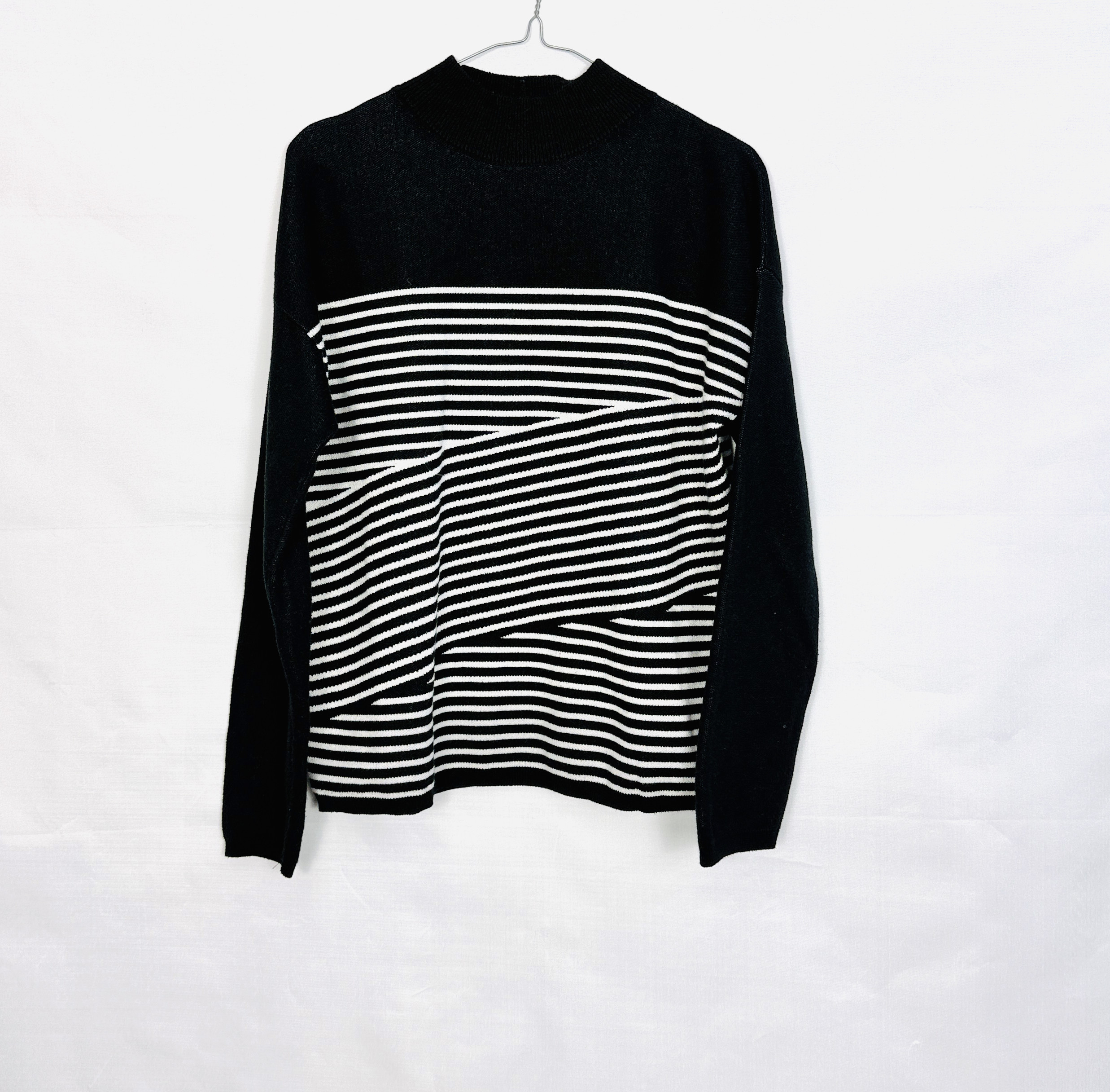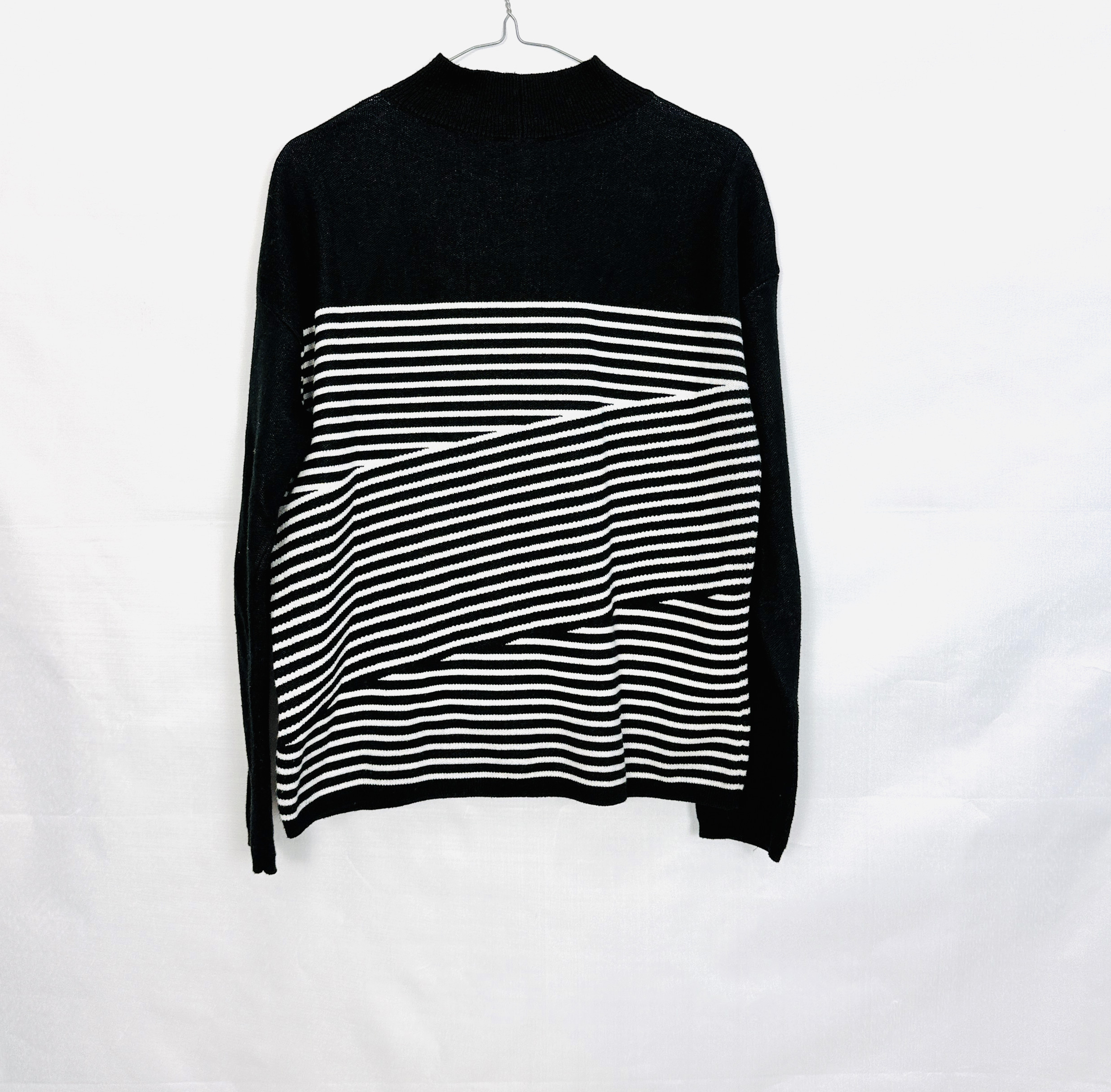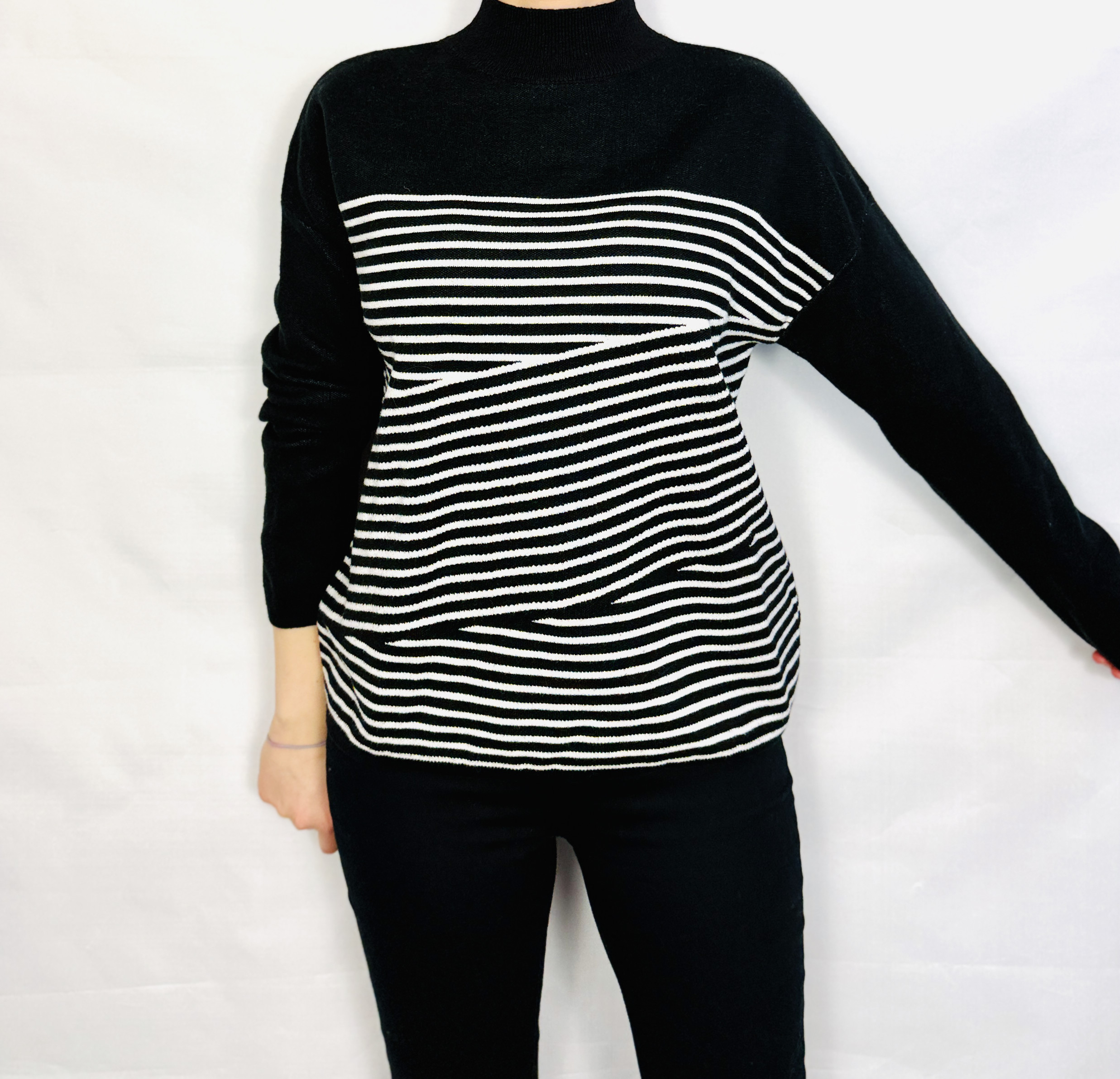 Ten sweterek łączy klasyczną elegancję z nowoczesną prostotą — kontrastujące, poziome paski na tle głębokiej czerni nadają mu szykownego, a zarazem świeżego charakteru. Wysoka linia szyi i uporządkowana grafika pasków tworzą wyważony, harmonijny wyraz, który pasuje zarówno do stonowanych, jak i bardziej zdecydowanych stylizacji. To propozycja dla osób ceniących ponadczasowy wzór w subtelnym, miejskim wydaniu.