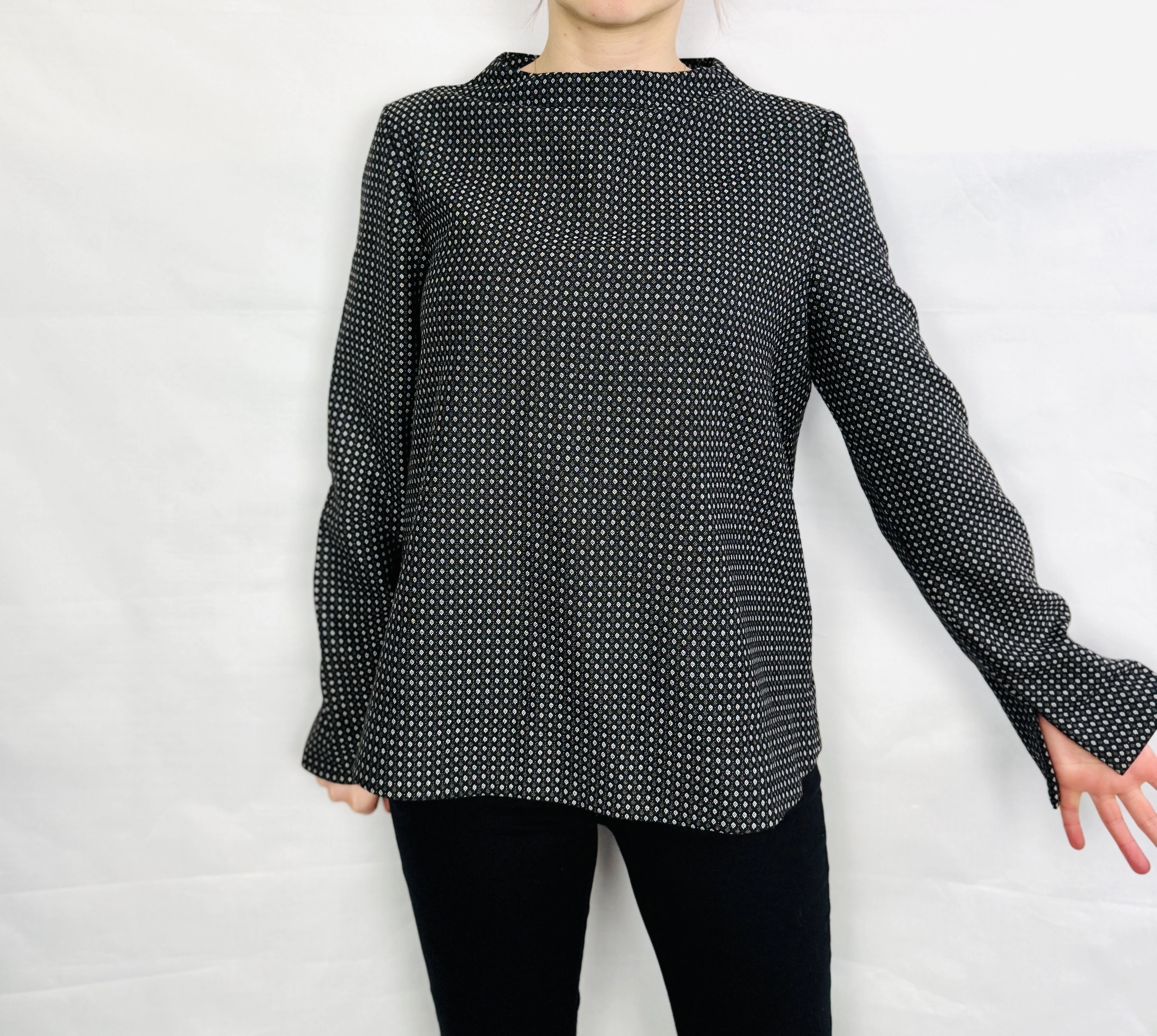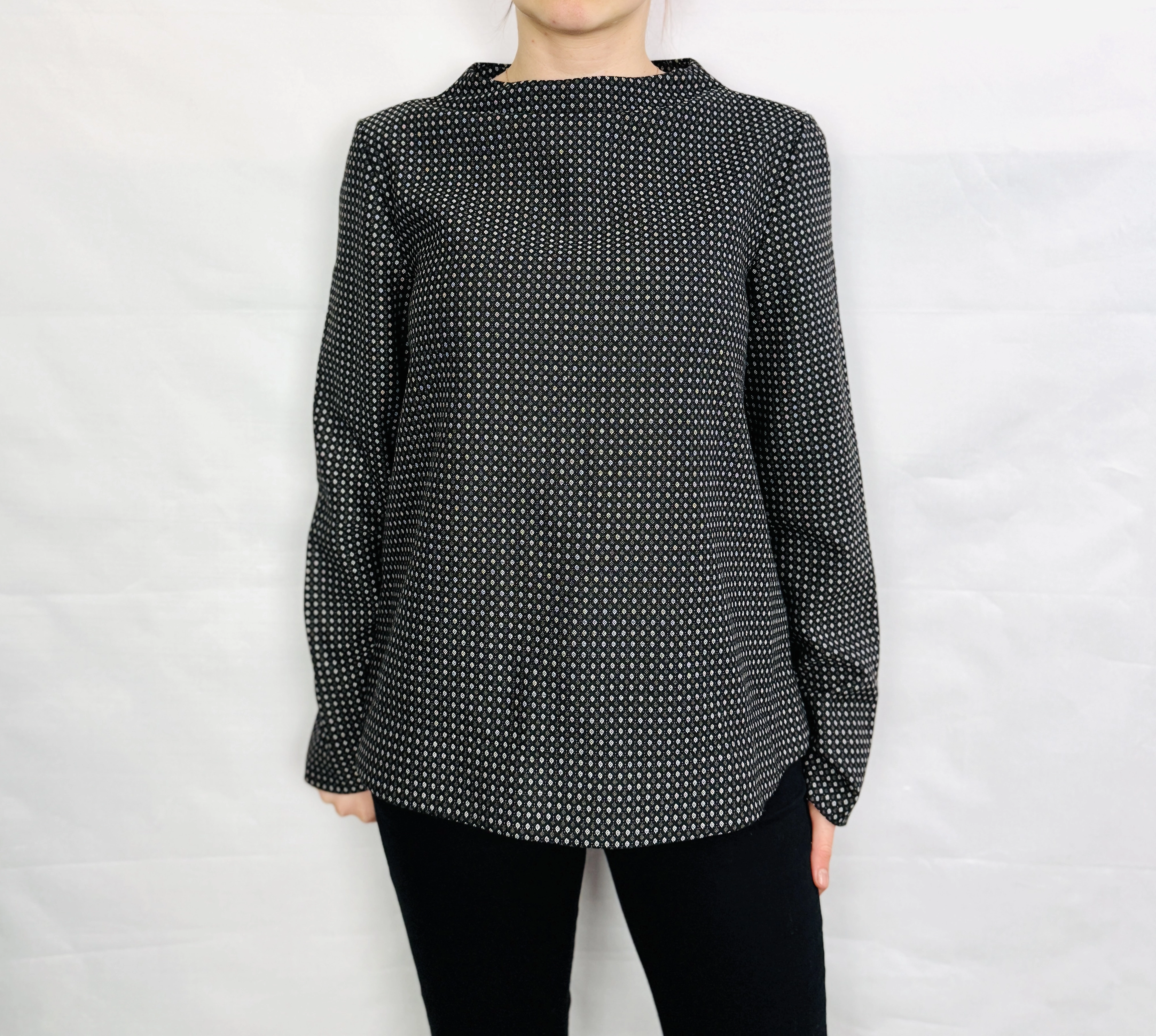 To elegancka i zarazem subtelnie nowoczesna propozycja, która łączy stonowaną paletę z wyrafinowanym rytmem drobnego deseniu. Dominująca czerń przełamana jest regularnym, drobnym wzorem w odcieniu szarości, co nadaje bluzce dyskretnego, lecz intrygującego charakteru — to model, który emanuje spokojną klasą i pasuje do wielu okazji, oferując jednocześnie wyrafinowaną, kobiecą estetykę.