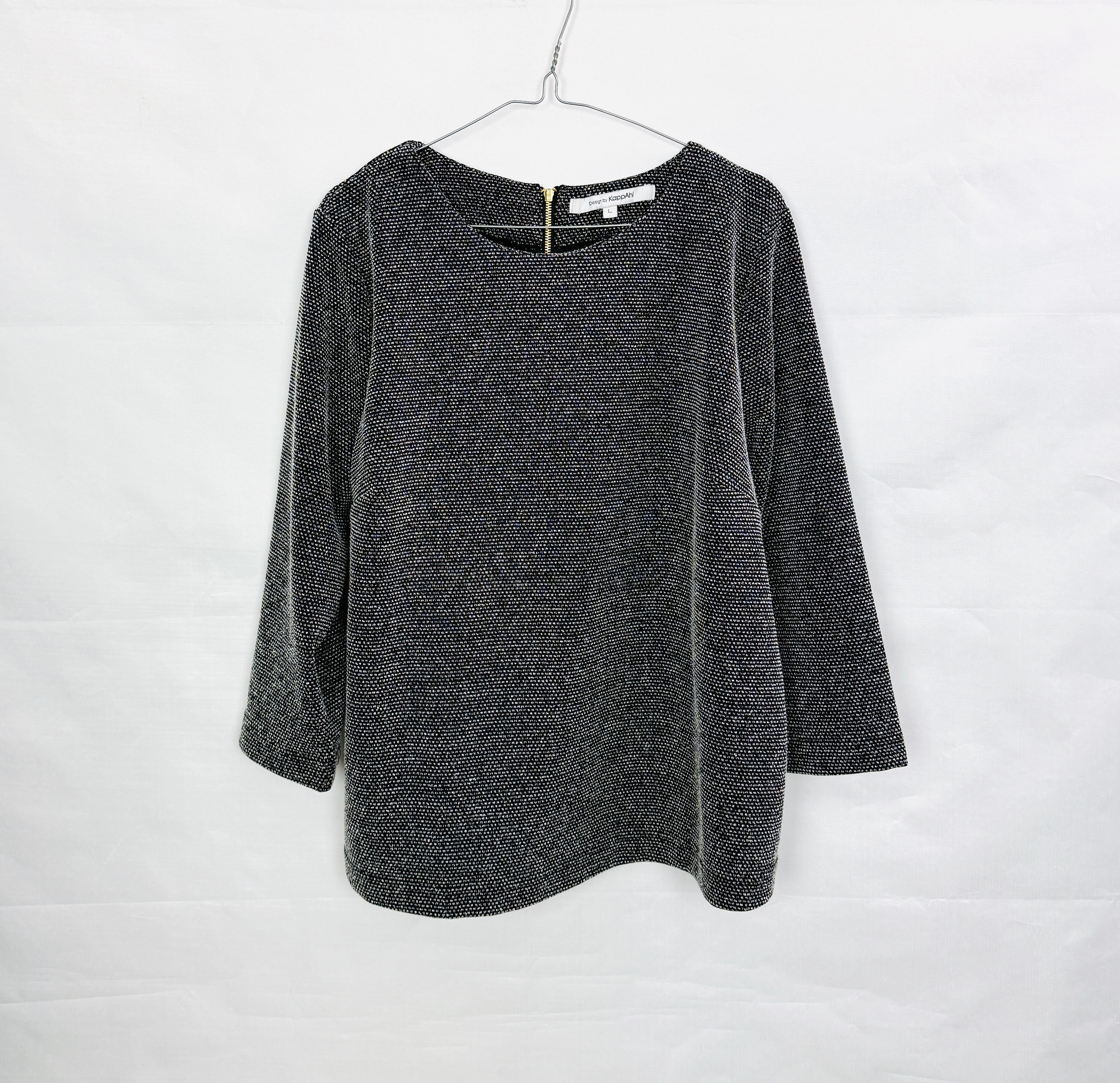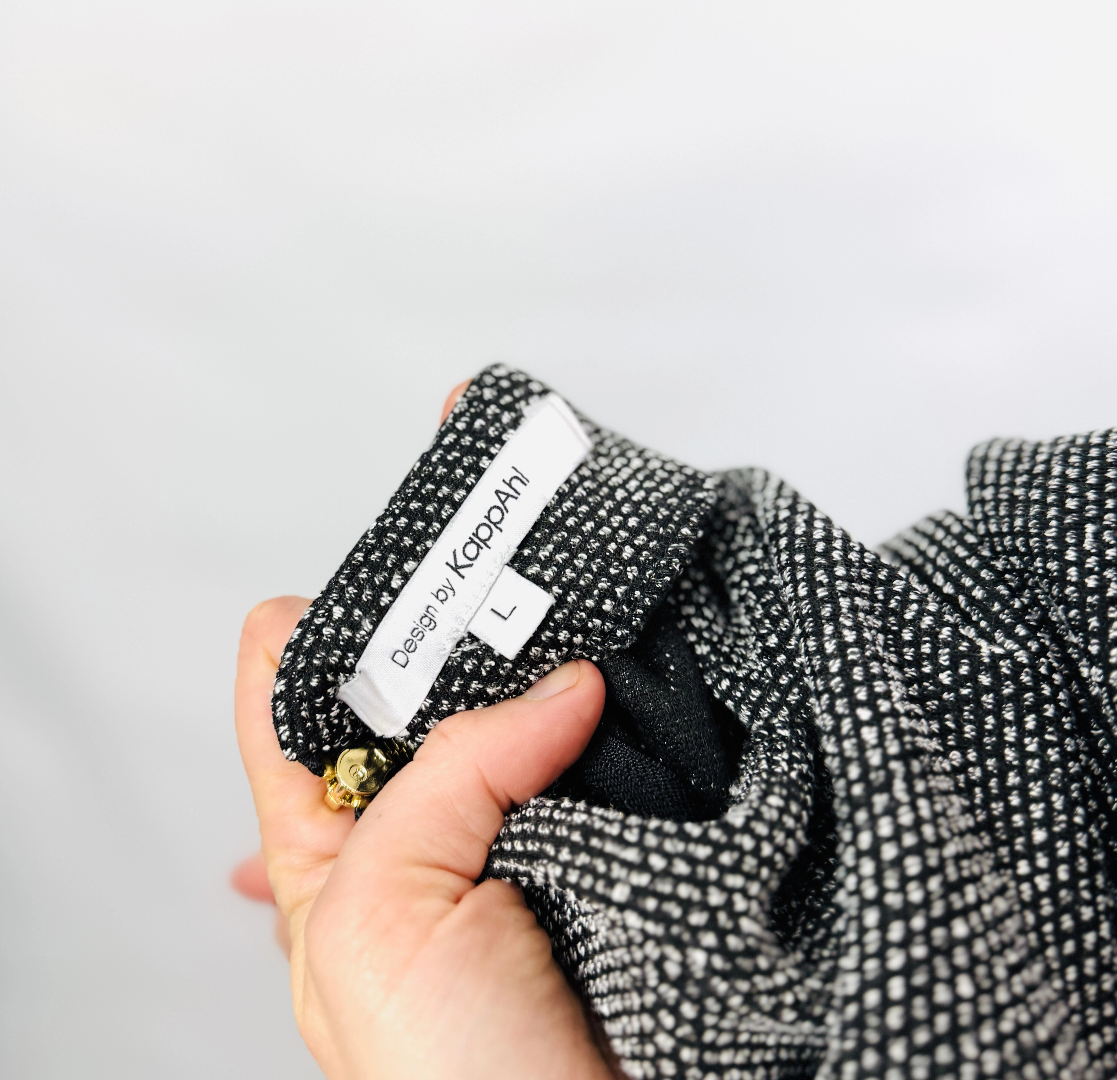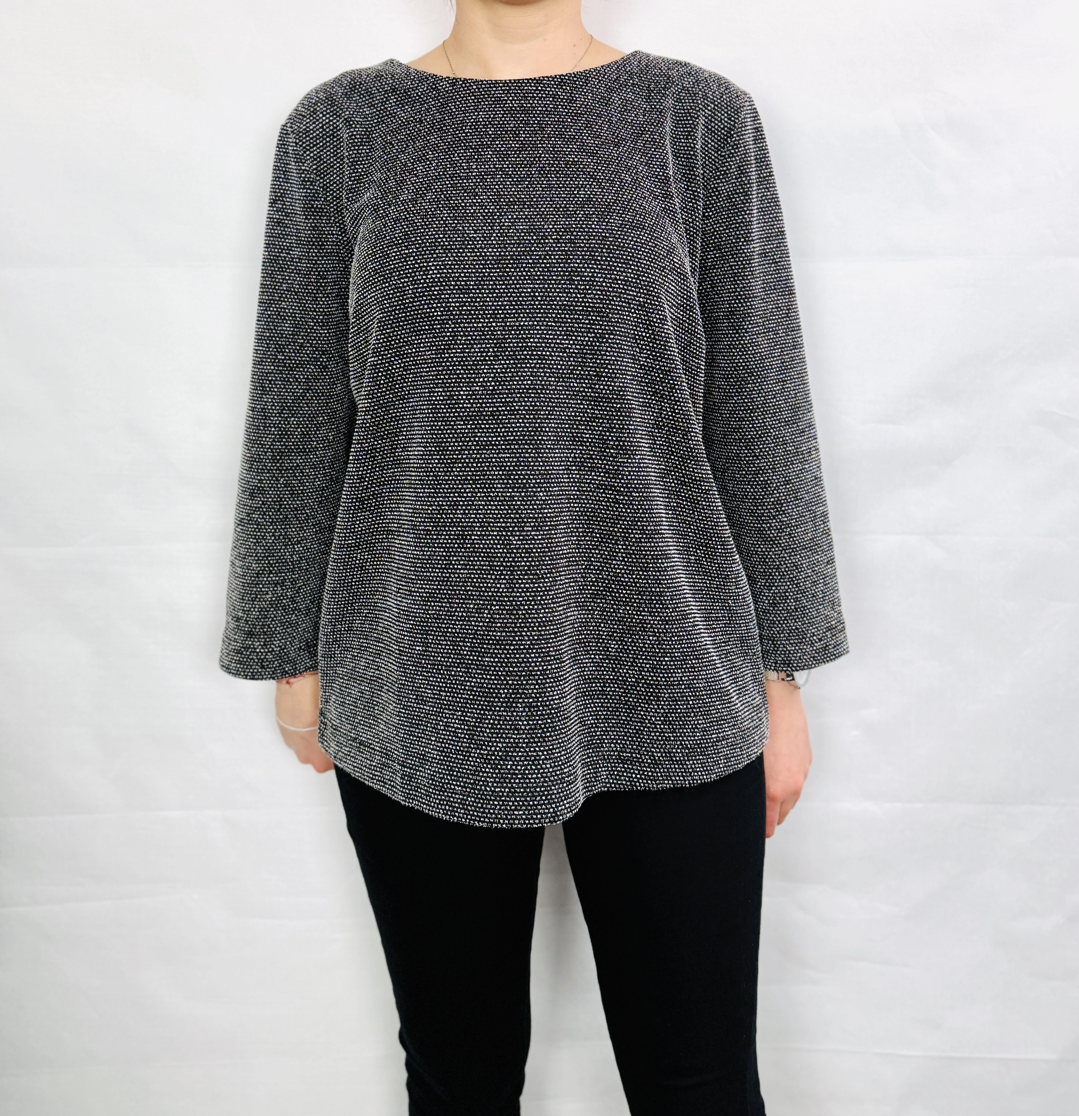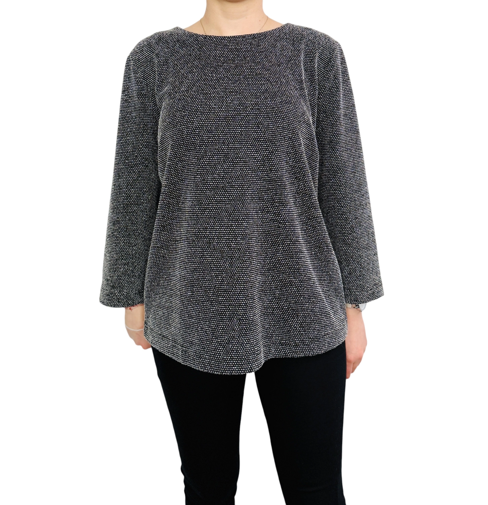Ta czarno szara bluzka zachwyca swoją subtelną, ponadczasową estetyką, która łączy w sobie wygodę i spokojną elegancję. Drobny, równomierny wzór nadaje jej głębi i sprawia, że całość prezentuje się ciekawie, ale wciąż bardzo uniwersalnie. To model, który z łatwością wpisuje się zarówno w codzienne stylizacje, jak i te bardziej dopracowane, oferując lekkość i swobodę w kobiecym wydaniu.