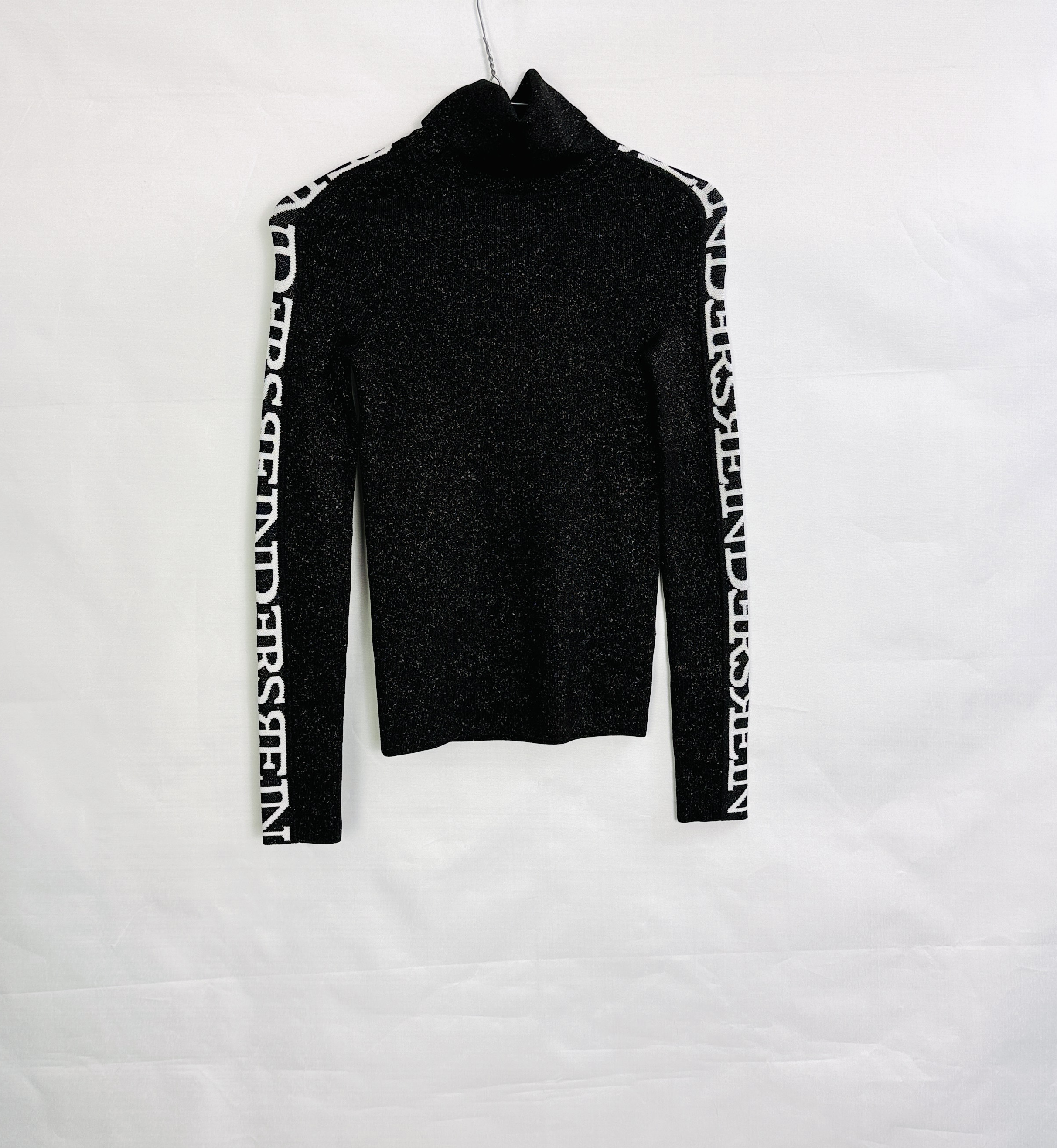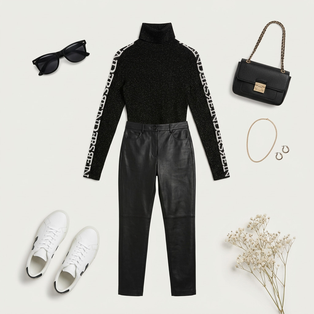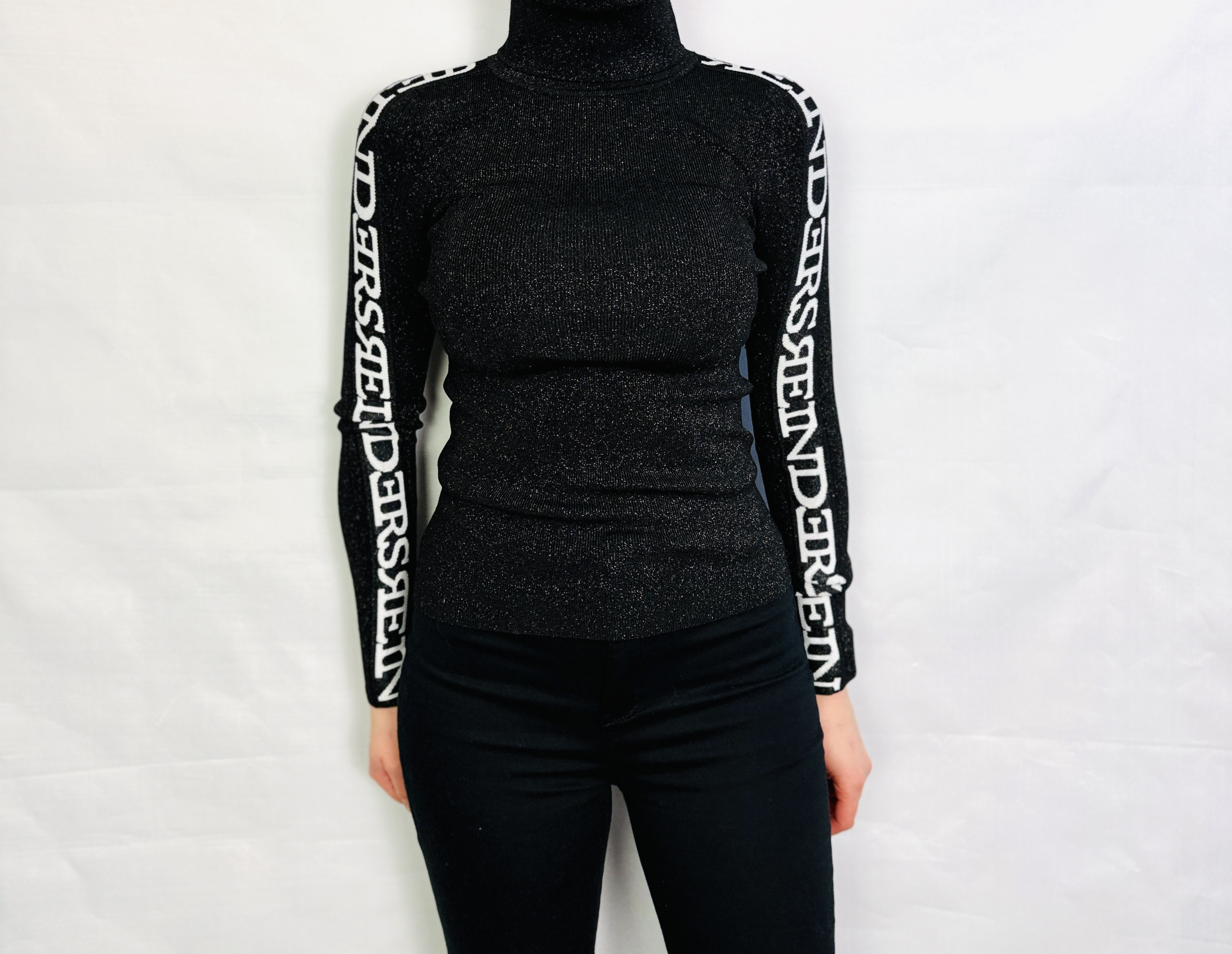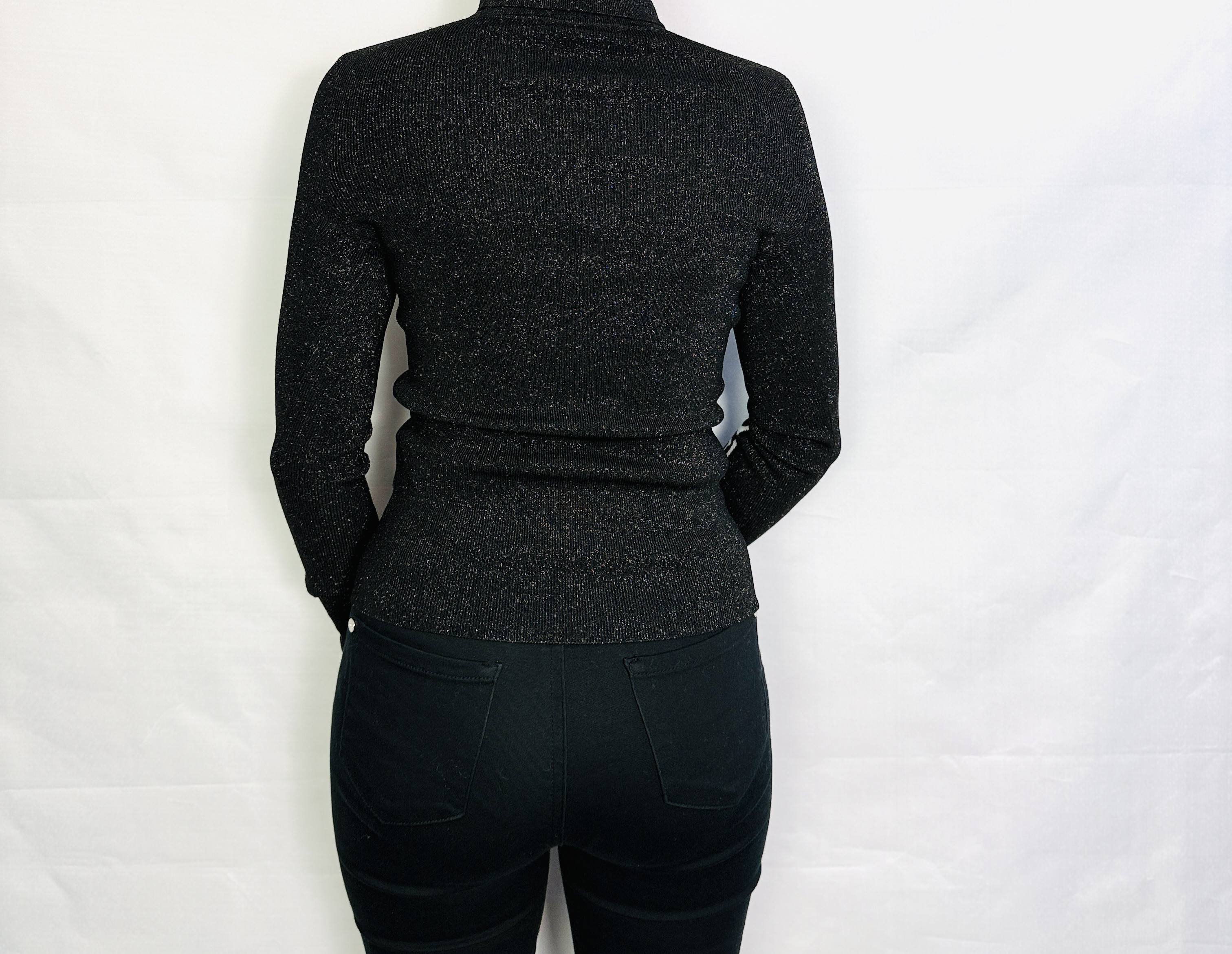 To wieczorowo sportowy akcent, który łączy w sobie zmysłowy połysk z nowoczesną, lekko sportową estetyką. Głęboka czerń przeplatana drobnym, metalicznym połyskiem nadaje swetrowi eleganckiego blasku, ale dopasowany fason i kontrastowe aplikacje wprowadzają do całości świeży, młodzieńczy charakter. Ten model sprawia wrażenie przemyślanego i kobiecego — ma w sobie zarówno szyk, jak i dynamikę, dzięki czemu łatwo wpasowuje się w stylizacje na wieczór i w bardziej miejskie zestawy.