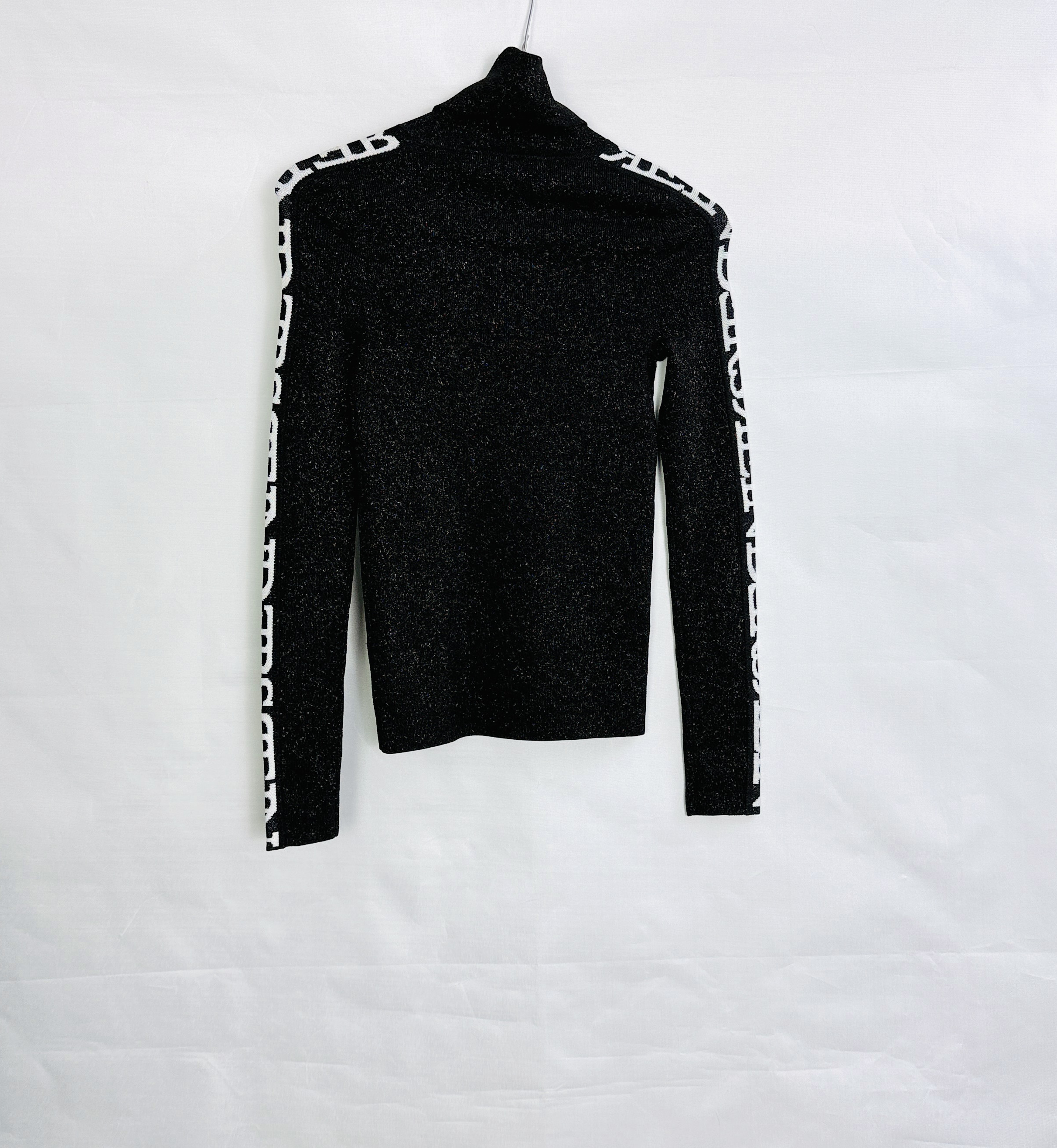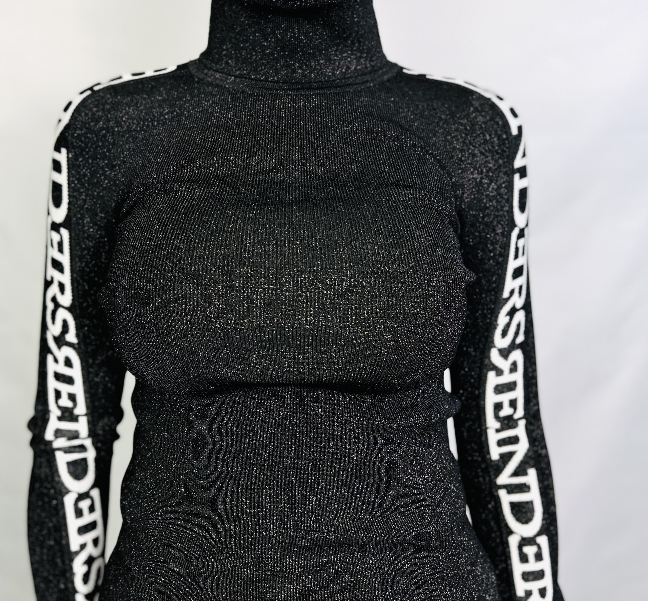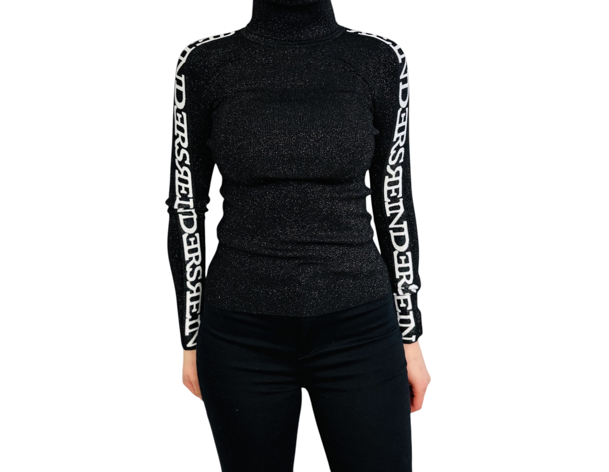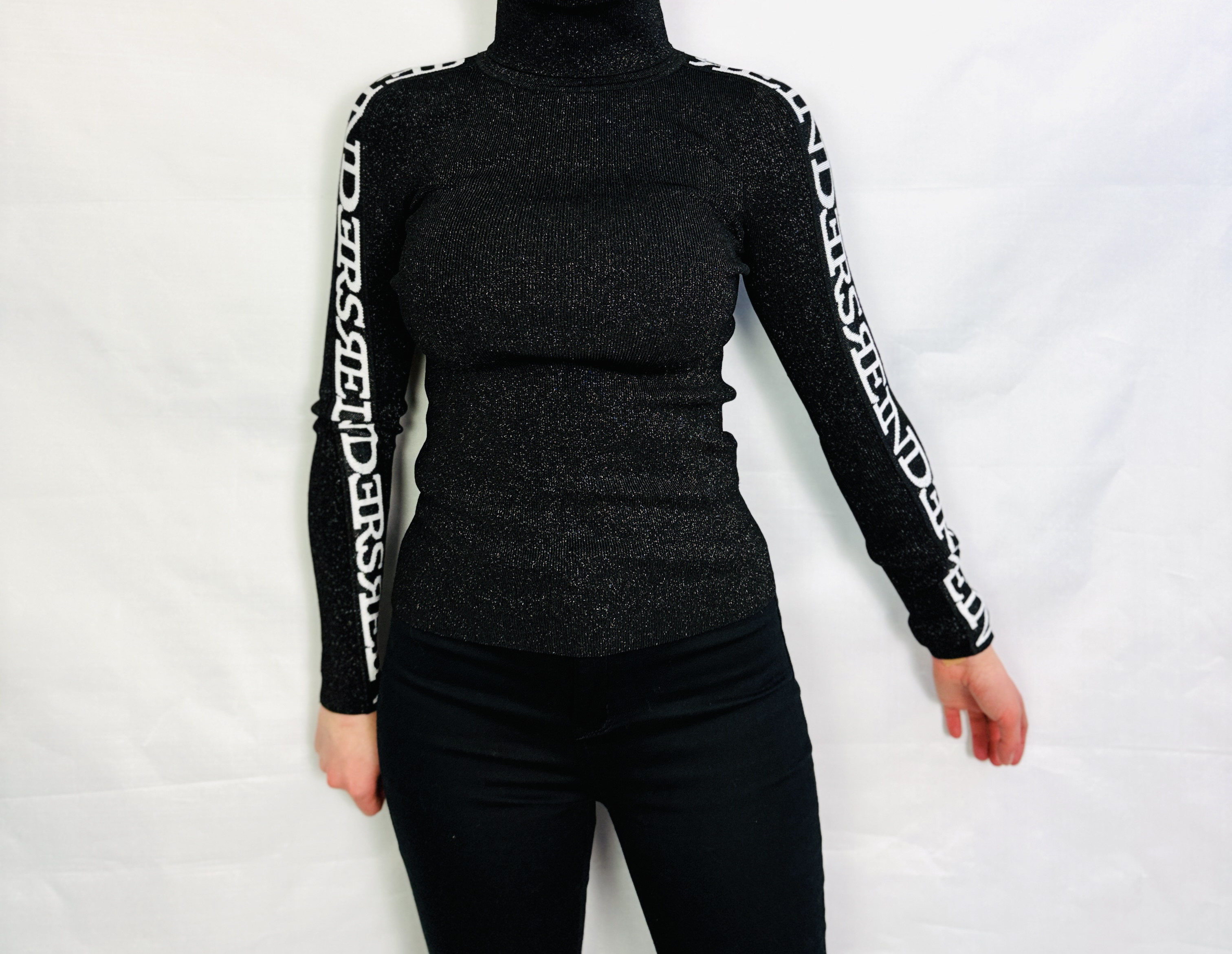 Dekolt to wyraźny półgolf, który delikatnie otula szyję i porządkuje sylwetkę, dodając stylizacji klasycznego sznytu. Rękawy są długie i dopasowane, a ich linia biegnie gładko od ramienia do nadgarstka, co podkreśla smukłość ramion i przedramion. Najbardziej charakterystycznym detalem są kontrastowe białe pasy z nadrukiem biegnące wzdłuż ramion i rękawów — wprowadzają one dynamiczny akcent i sportowy rytm bez zaburzania eleganckiego wyrazu połyskującej dzianiny. Całość ma mocno dopasowany krój w talii i na biodrach, dzięki czemu sweter ładnie modeluje sylwetkę, a długość kończy się na linii bioder, co ułatwia łączenie z różnymi fasonami spodni i spódnic.