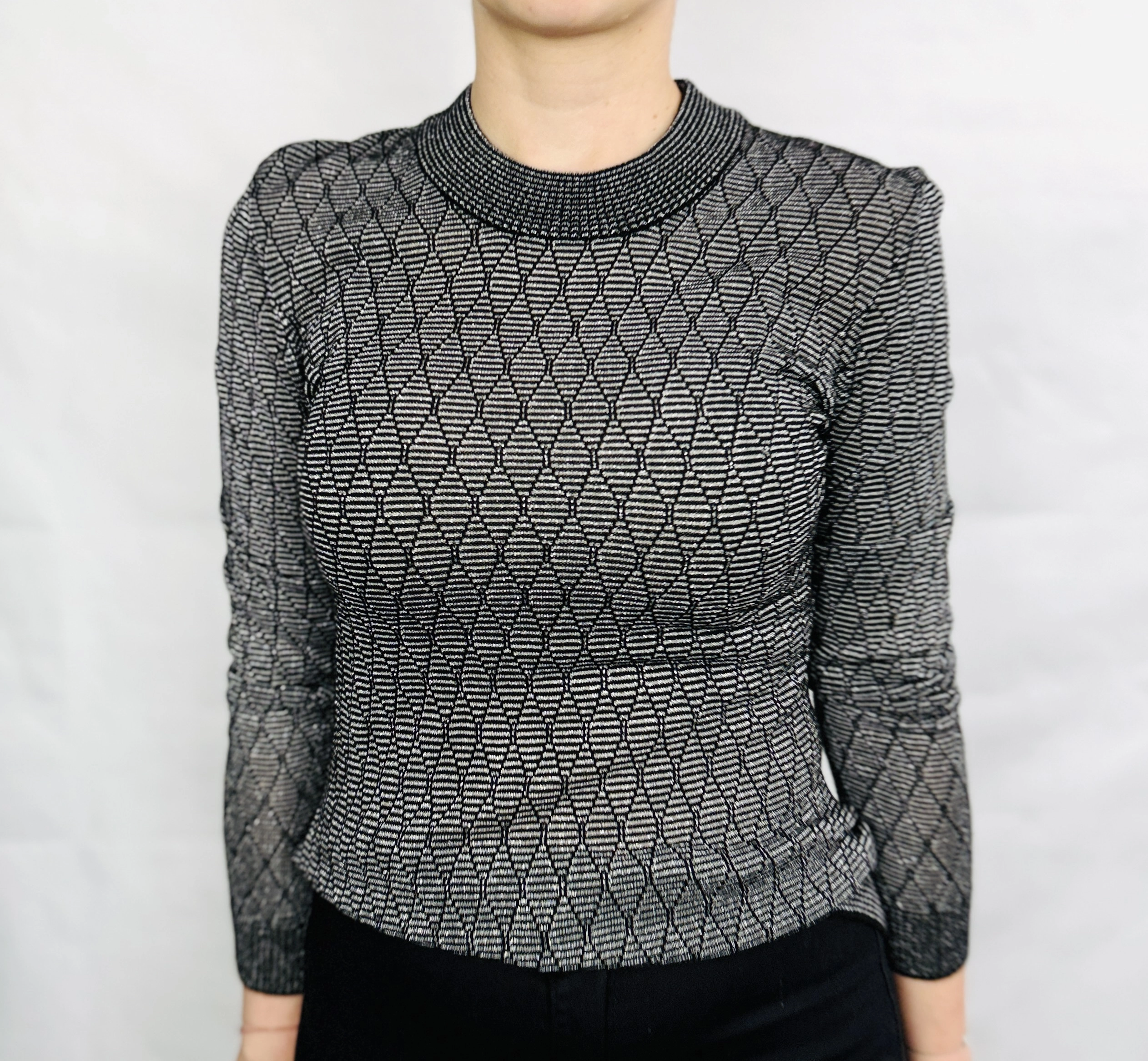 Fason sweterka jest dopasowany, co pozwala podkreślić sylwetkę, eksponując naturalne linie ciała i dodając stylizacji lekkości. Materiał jest cienki i lekko prześwitujący, co sprawia, że sweterek jest niezwykle lekki i przewiewny, a jednocześnie miękko układa się na ciele, zapewniając komfort noszenia. Wysoka, ściągana stójka subtelnie otula szyję, dodając całości elegancji i wyrafinowania. Długie rękawy o dopasowanym kroju podkreślają smukłość ramion i rąk, a srebrny wzór delikatnie mieni się przy każdym ruchu, tworząc efekt subtelnego połysku.