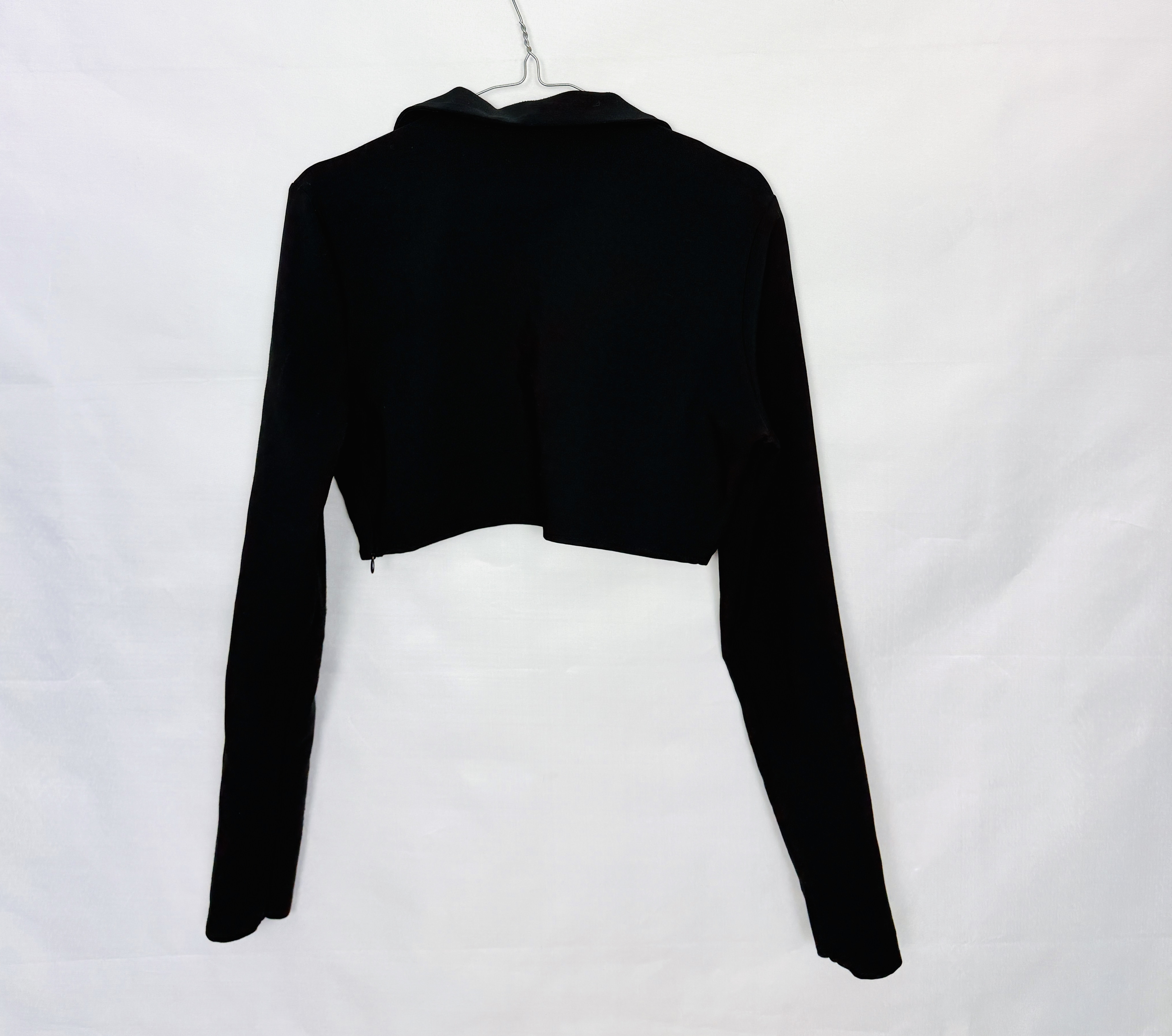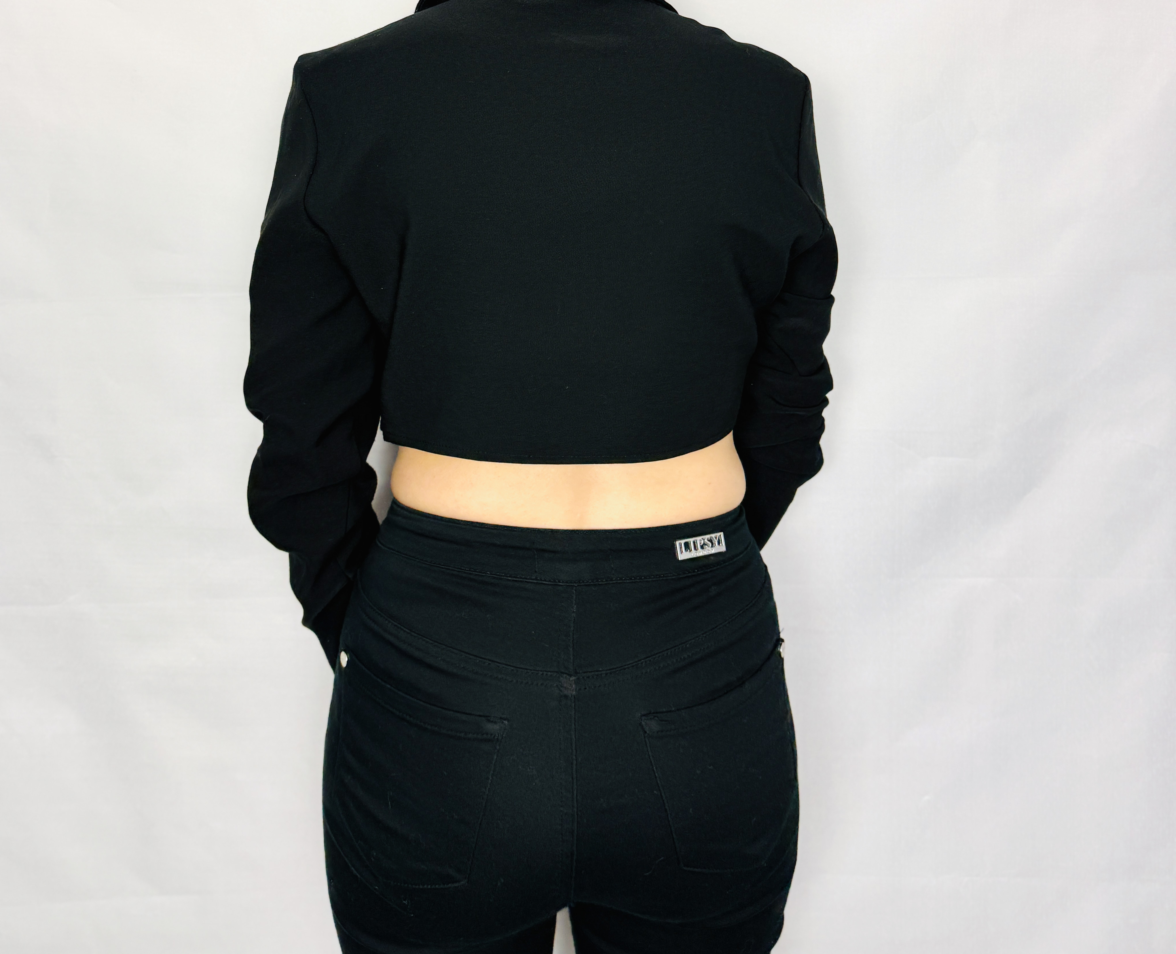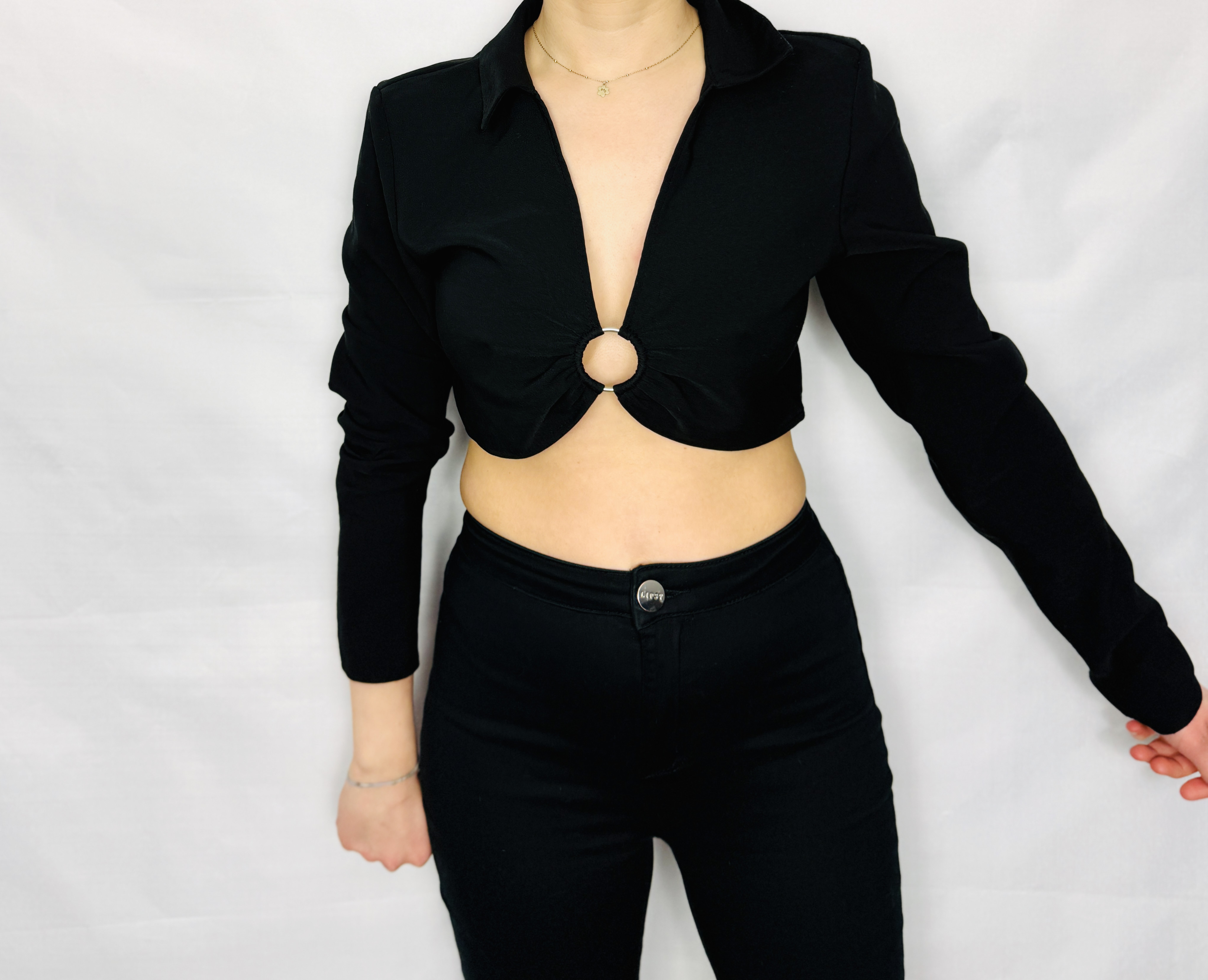 Dekolt tworzy głębokie V, które pięknie eksponuje linię szyi i dekoltu, a klasyczny kołnierzyk dodaje całości nieco struktury i elegancji. Przód łączy się w centralnym punkcie metalowym lub plastikowym kółkiem, które zbiera materiał i tworzy delikatne marszczenia rozchodzące się ku bokom — to rozwiązanie modeluje górę tułowia i w naturalny sposób kieruje uwagę ku środkowi sylwetki. Dolna linia topu jest krótka i odsłania talię oraz fragment brzucha, co nadaje mu śmiałego, współczesnego charakteru.