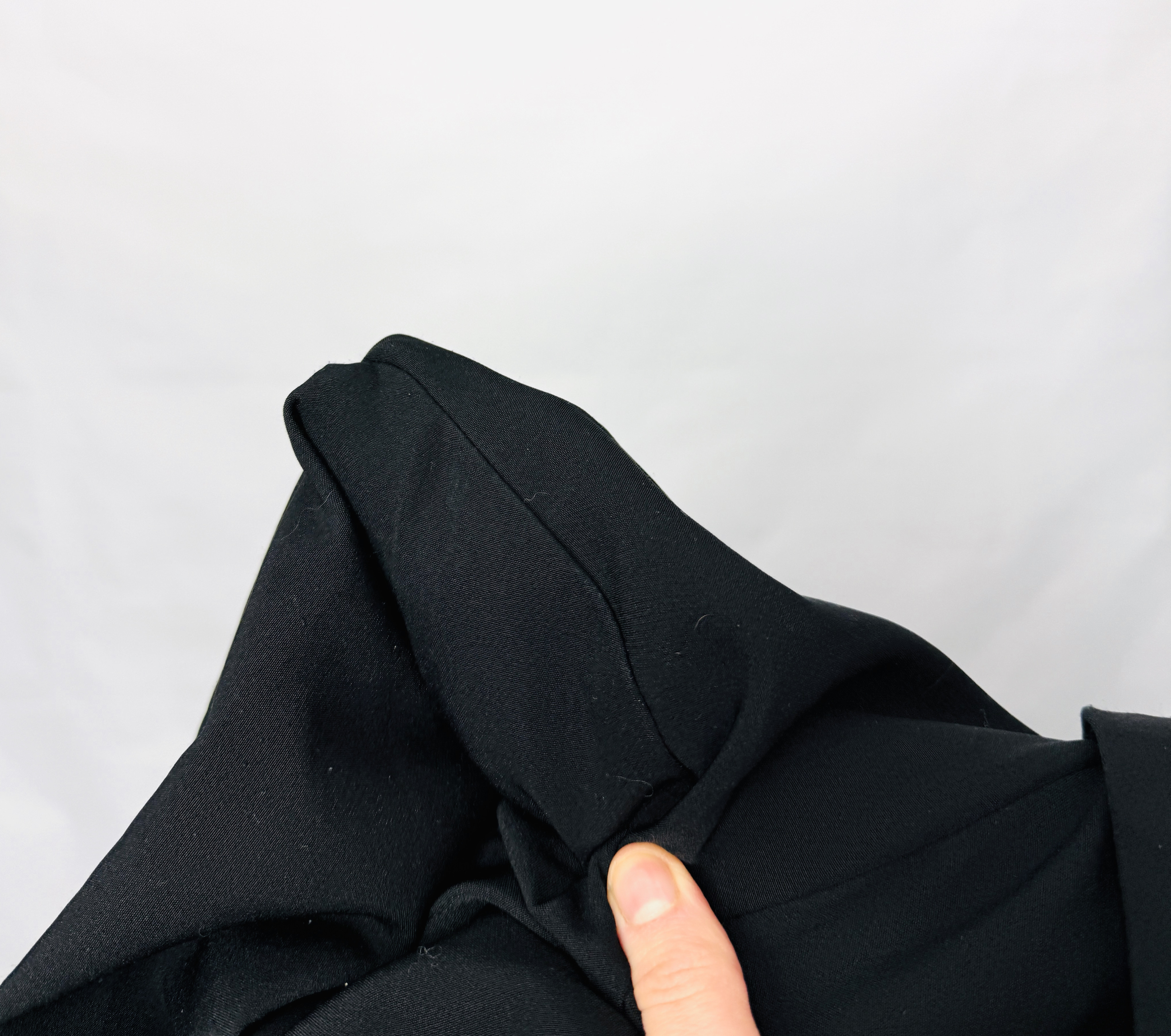 Rękawy są długie i przylegające, ich gładka linia kontrastuje z subtelnym drapowaniem przy kółku, przez co całość wydaje się dopracowana i harmonijna. Ramiona mają skromne, ale wyraźne zarysowanie, co dodaje formie lekko krawieckiego wyrazu, a jednocześnie zachowuje noszalną wygodę. Materiał prezentuje się jako gładki, delikatnie lejący i nieco elastyczny — ładnie układa się przy ciele, podkreślając sylwetkę bez nadmiernego opinania.