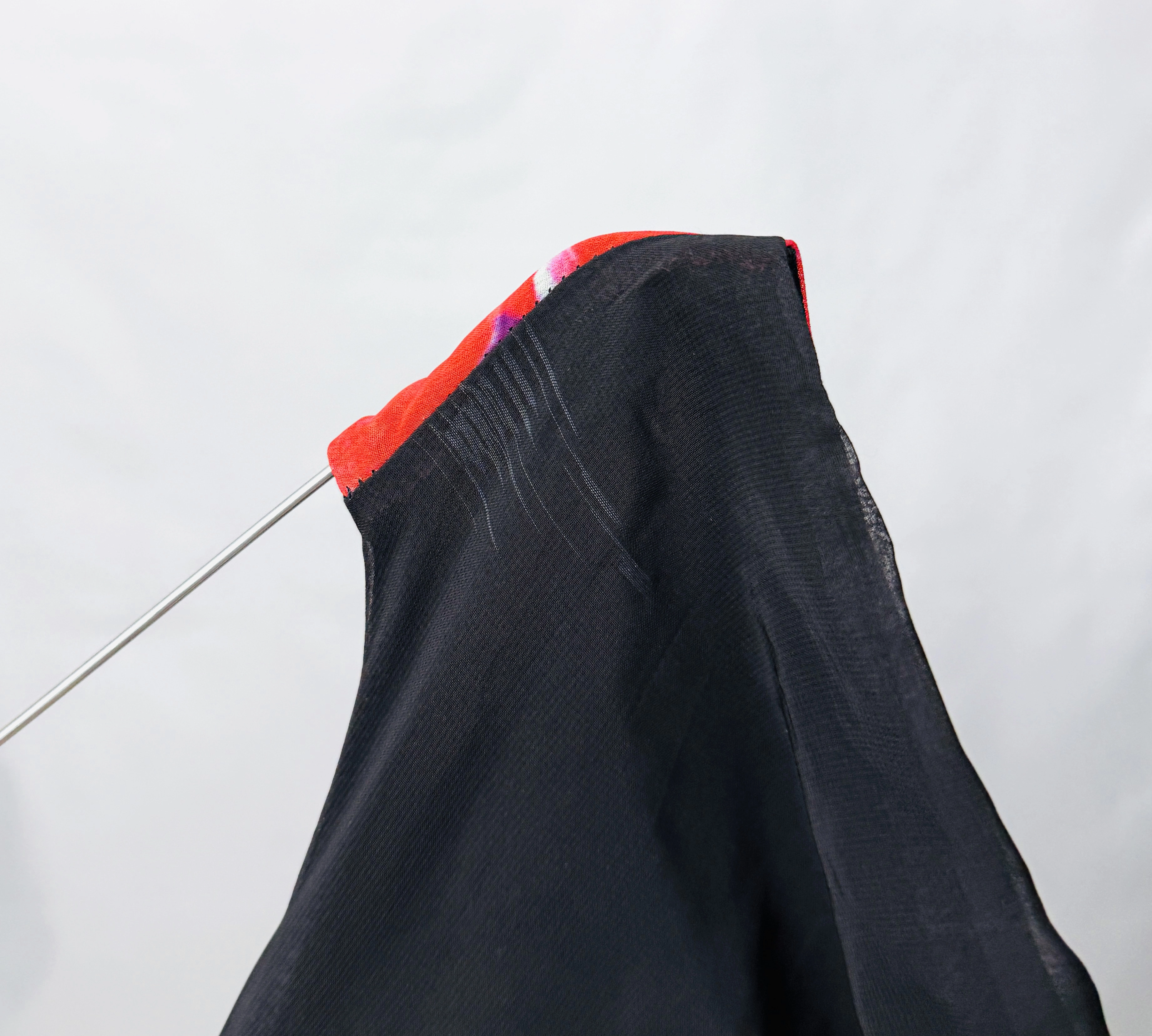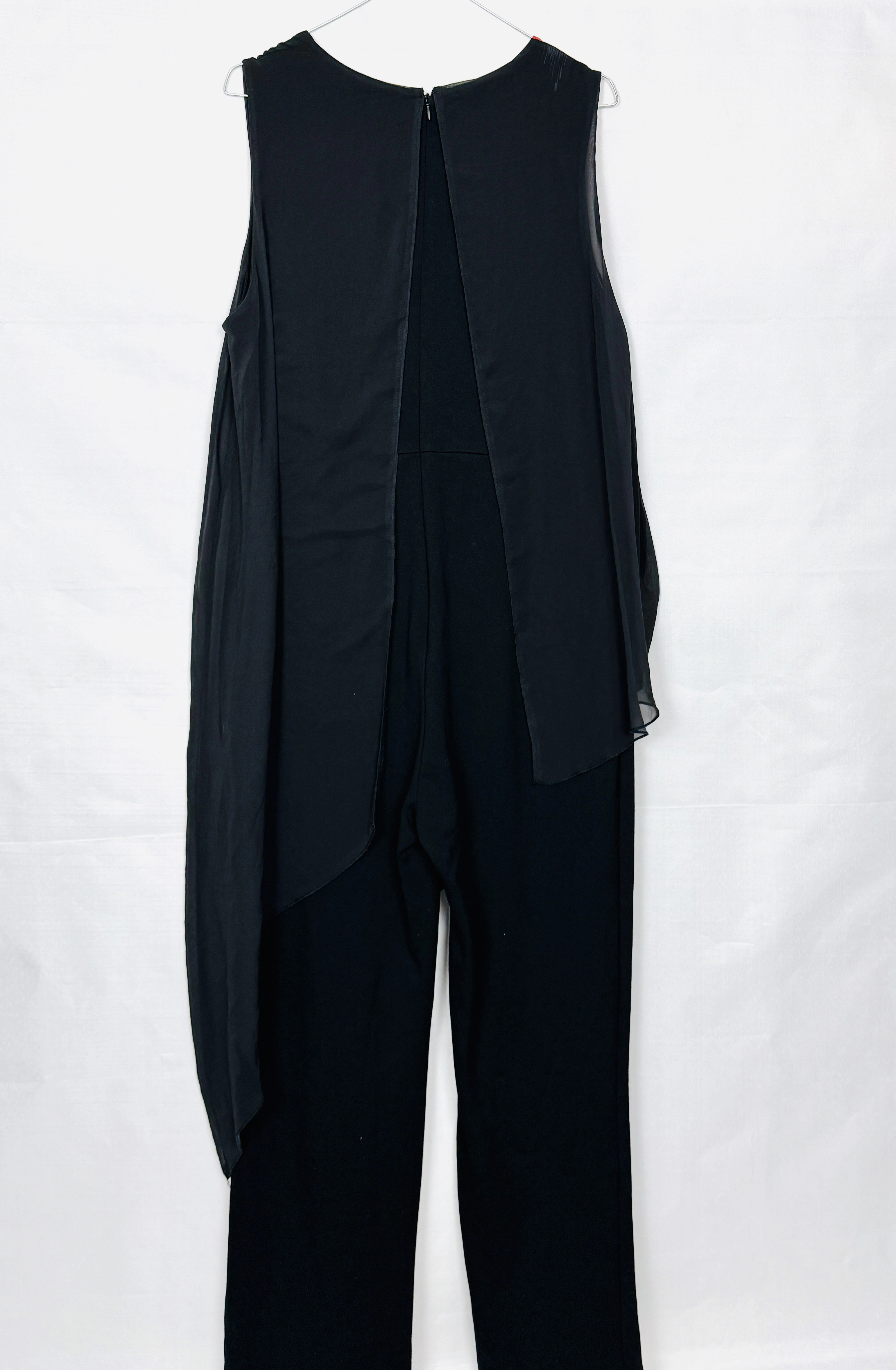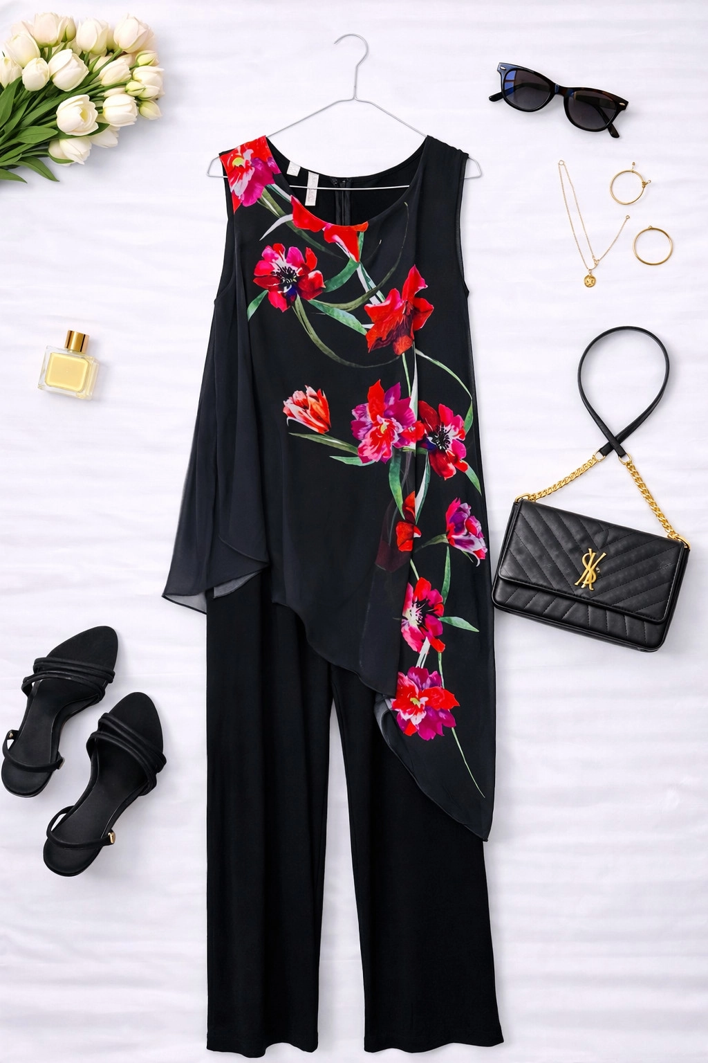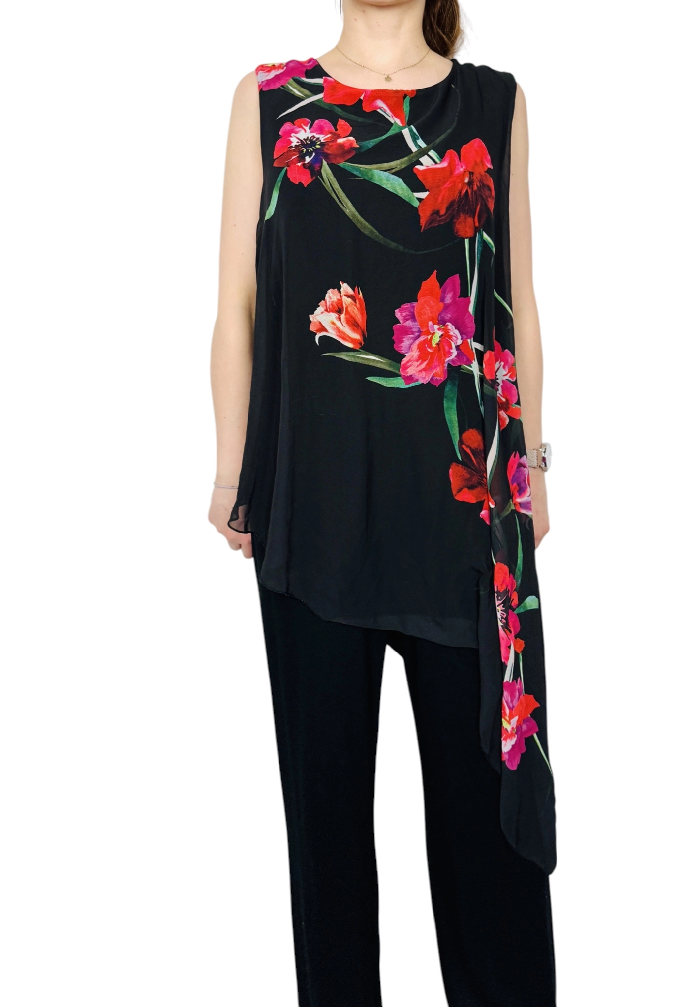 Dekolt ma łagodnie zaokrągloną linię, która delikatnie otwiera górę i pozwala skupić uwagę na szyi oraz dekolcie bez nadmiernej formy. Brak rękawów nadaje kompozycji lekkości i pozwala wyeksponować ramiona w elegancki sposób. Najbardziej charakterystycznym elementem jest asymetryczny, długi panel z żywym motywem kwiatowym — intensywne czerwone i różowe kwiatuszki z zielonymi listkami rozciągają się na czarny tle i układają się w miękki, zwiewny pas, który opada aż ku nogawce. Panel ma subtelne, lejące właściwości i tworzy efekt płynnego ruchu przy każdym kroku, wprowadzając do projektu nutę romantycznej dynamiki.