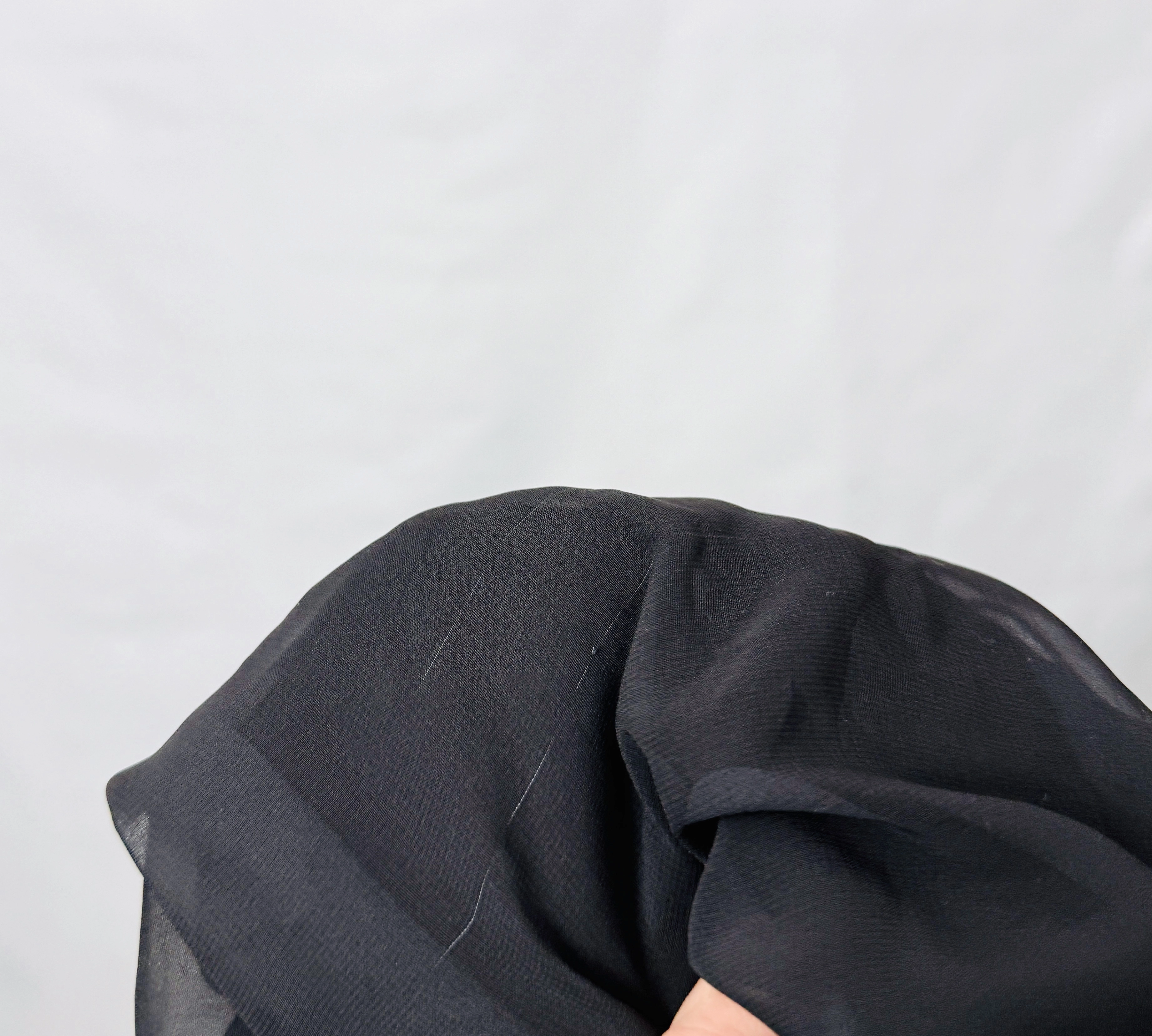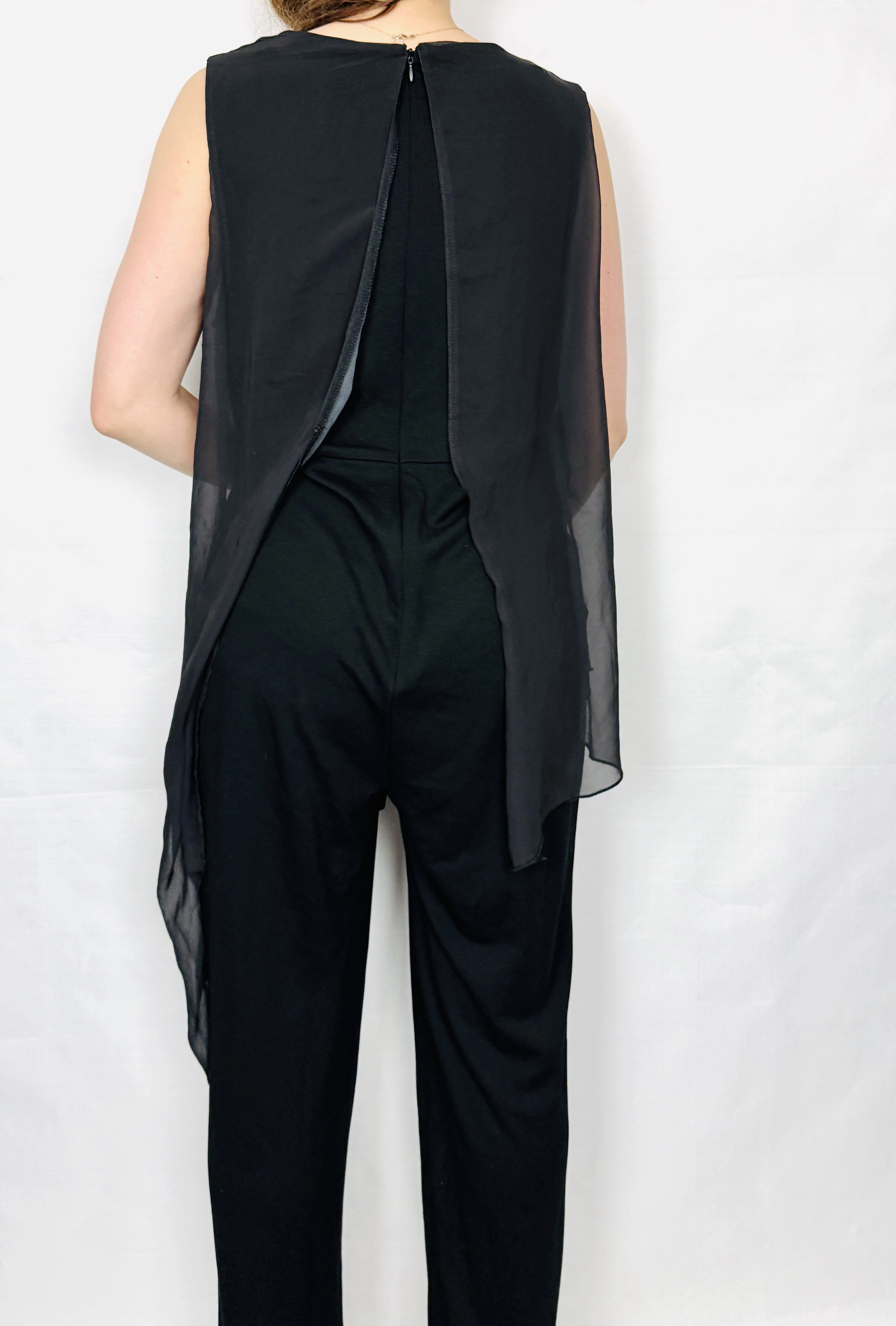 Górna część sylwetki ma luźniejszą, tunikową formę, która przechodzi w prostą, długą nogawkę o klasycznym kroju. Dolna część jest stonowana i utrzymana w gładki, czarny konturze, co równoważy dekoracyjność panelu i daje spójny, uporządkowany wyraz. Materiały różnią się fakturą: panel sprawia wrażenie delikatnie zwiewnego i półtransparentnego, podczas gdy spodnia część wydaje się bardziej gładka i nieco bardziej strukturalna — takie zestawienie podkreśla kontrast pomiędzy dekoracją a minimalistyczną bazą.