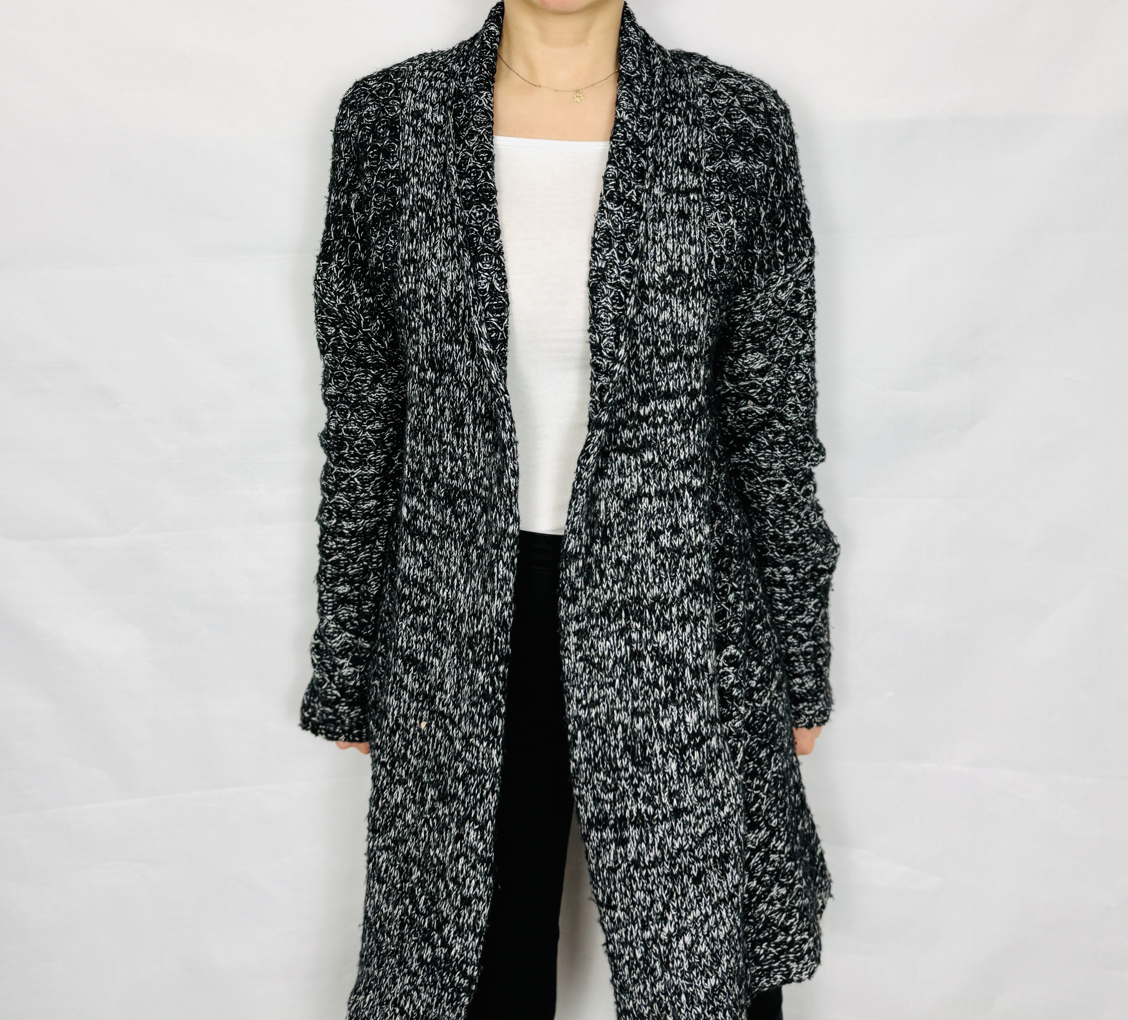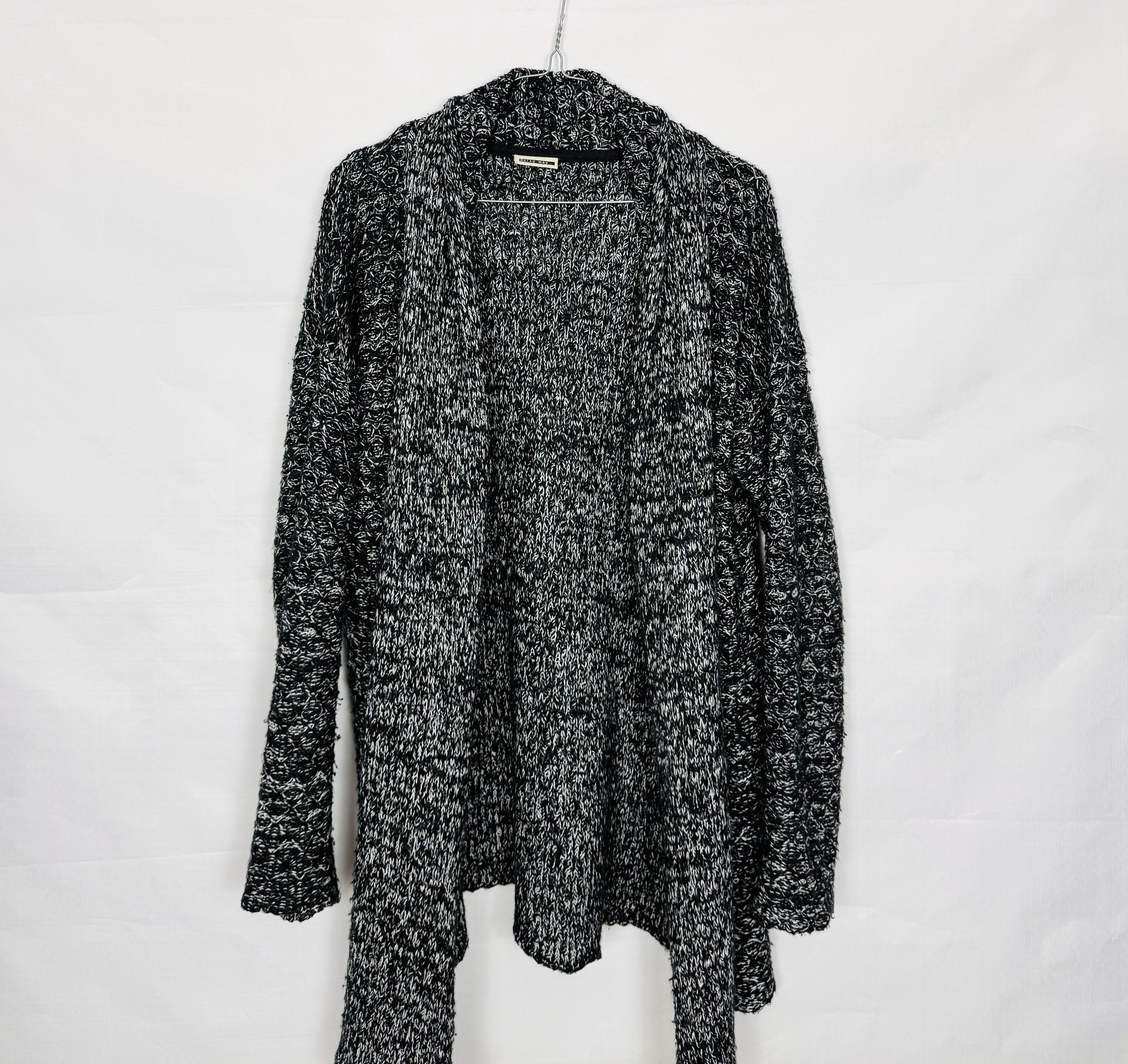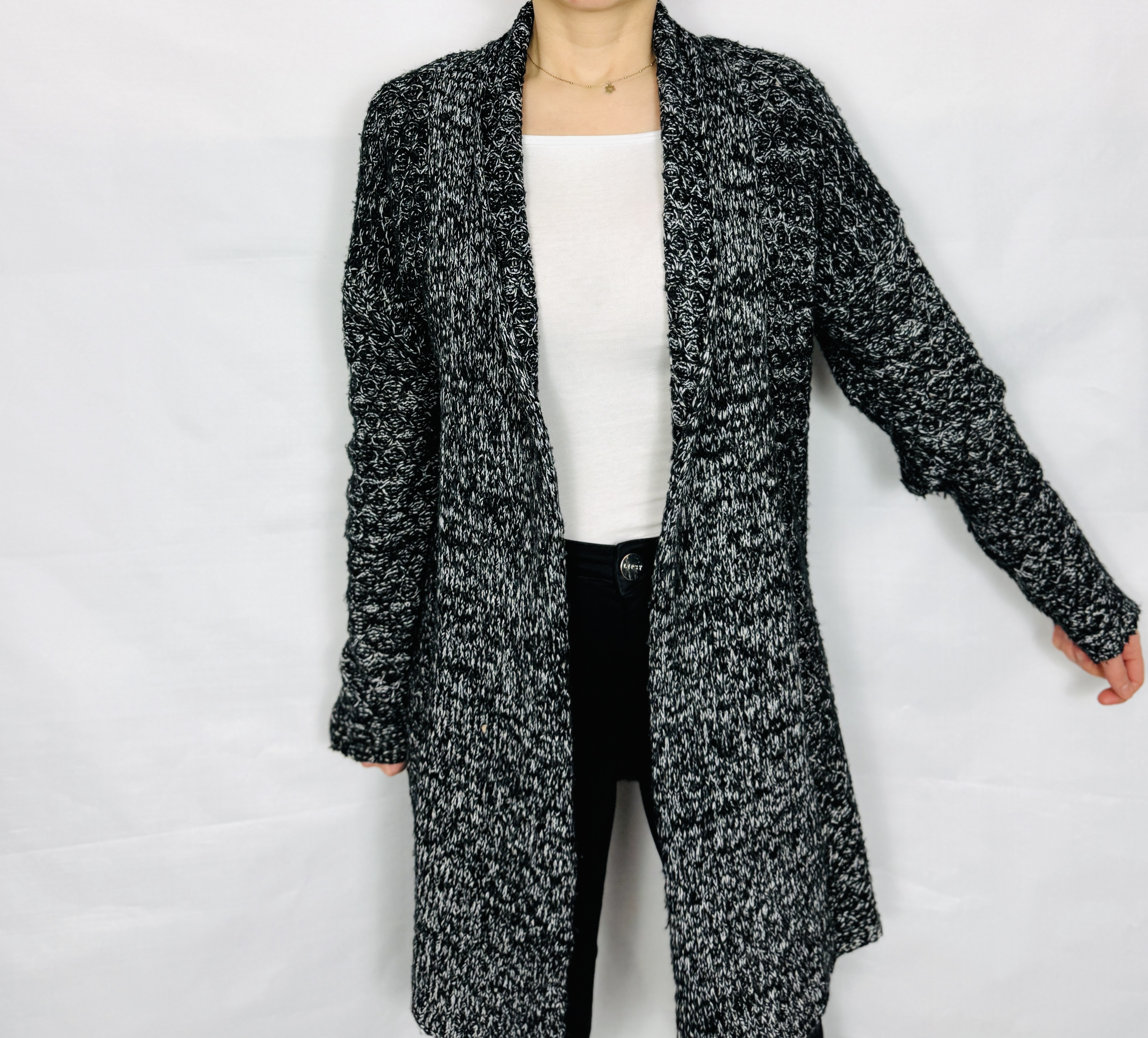 To kardigan o przytulnym, niemal rzemieślniczym charakterze — głęboki czarno‑biały melanż nadaje mu subtelnej głębi, a masywny, teksturalny splot tworzy efekt ciepłej, otulającej warstwy. Forma jest spokojna i noszalna: prosty, przedłużony fason łączy w sobie wygodę oversize’u z estetyką uporządkowanej dzianiny, dzięki czemu kardigan sprawdza się zarówno jako codzienna warstwa, jak i element bardziej wyrafinowanych, warstwowych stylizacji.