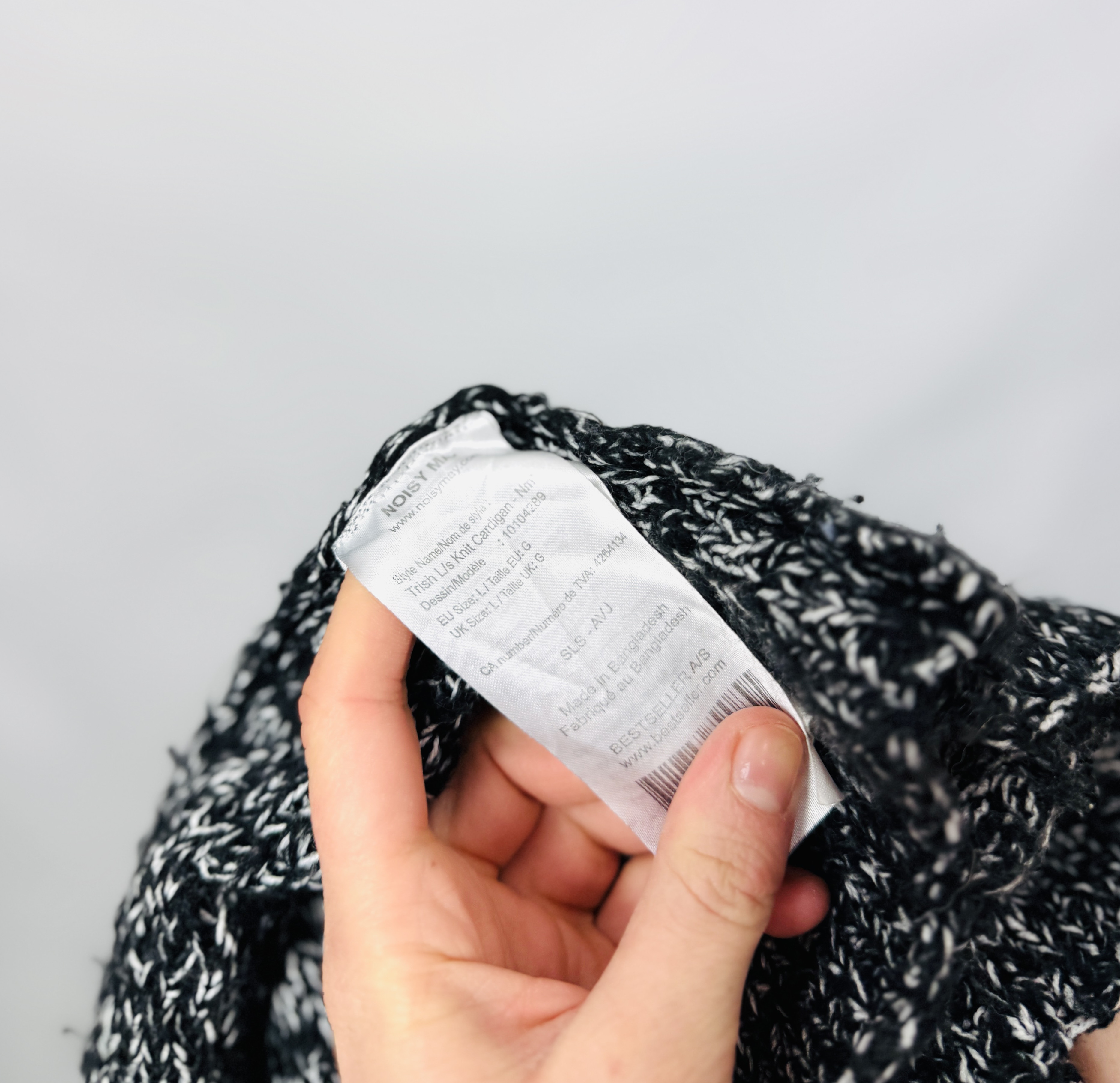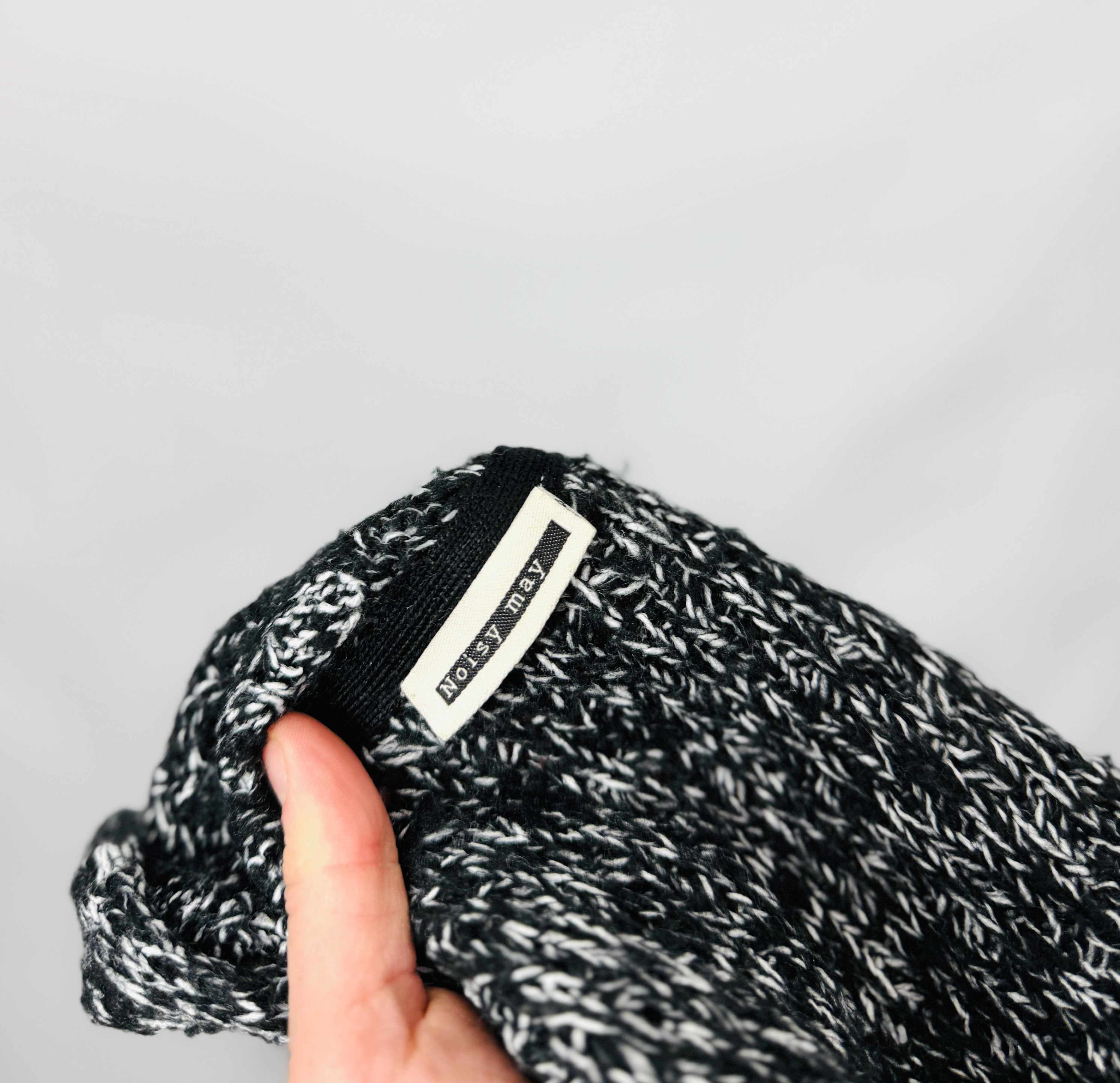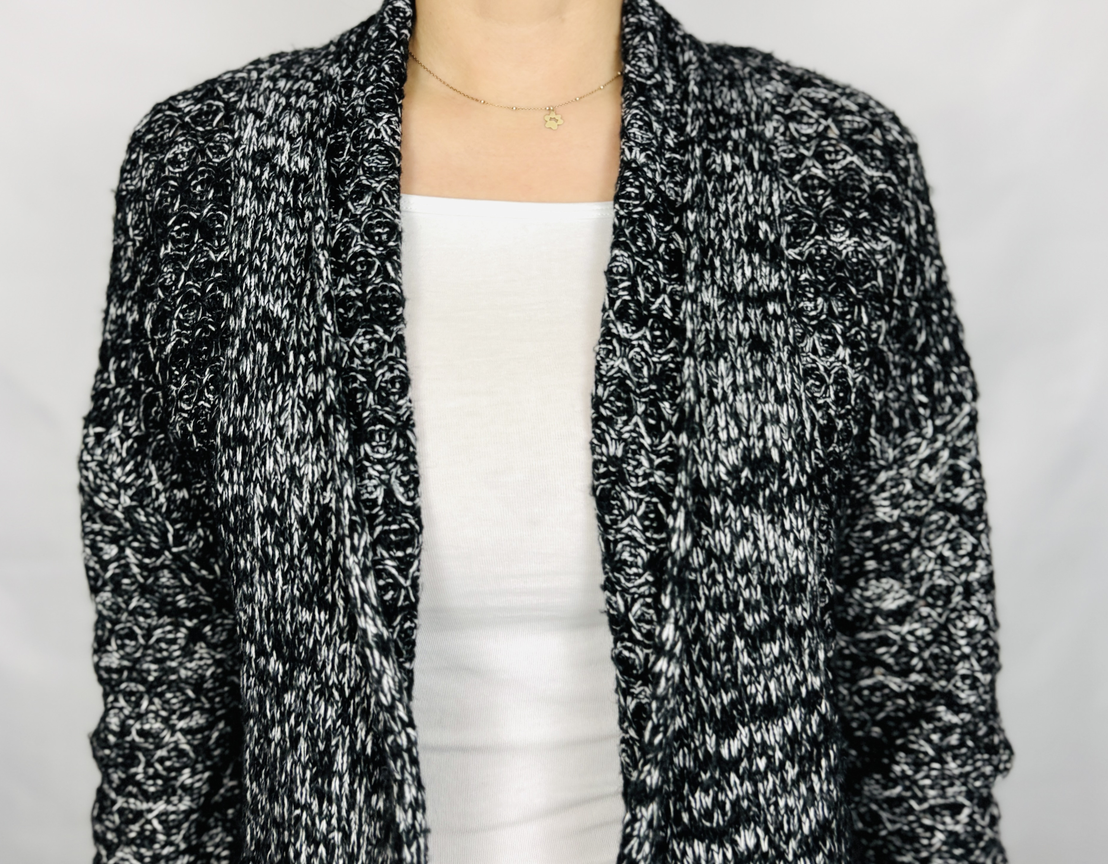 Dzianina prezentuje się jako dość gruby, wyraźnie fakturowany splot o lekko nierównomiernym, rękodzielniczym charakterze; materiał wygląda na nieco grubszy i otulający, miękko układający się przy ciele, co zapewnia poczucie ciepła i przyjemną teksturę. Melanżowe przeplatanie czerni i bieli nadaje powierzchni graficznej głębi, jednocześnie maskując ewentualne nierówności i podkreślając naturalny, „domowy” urok dzianiny.
