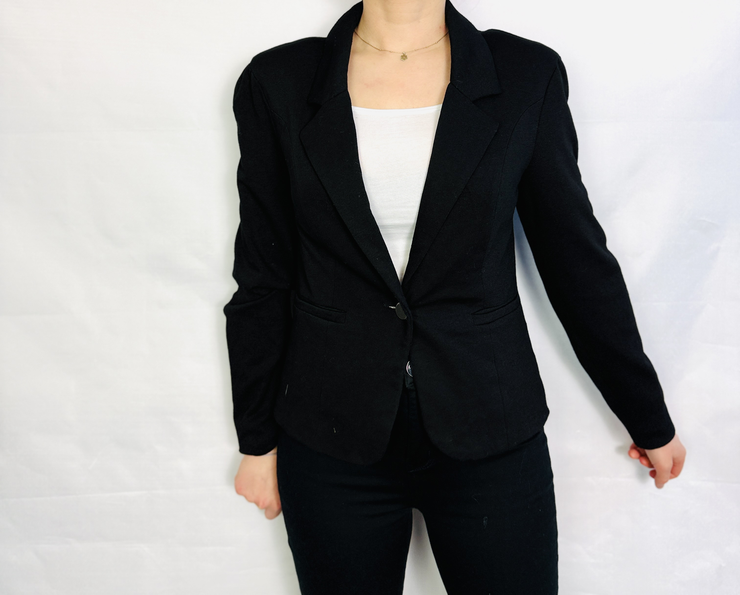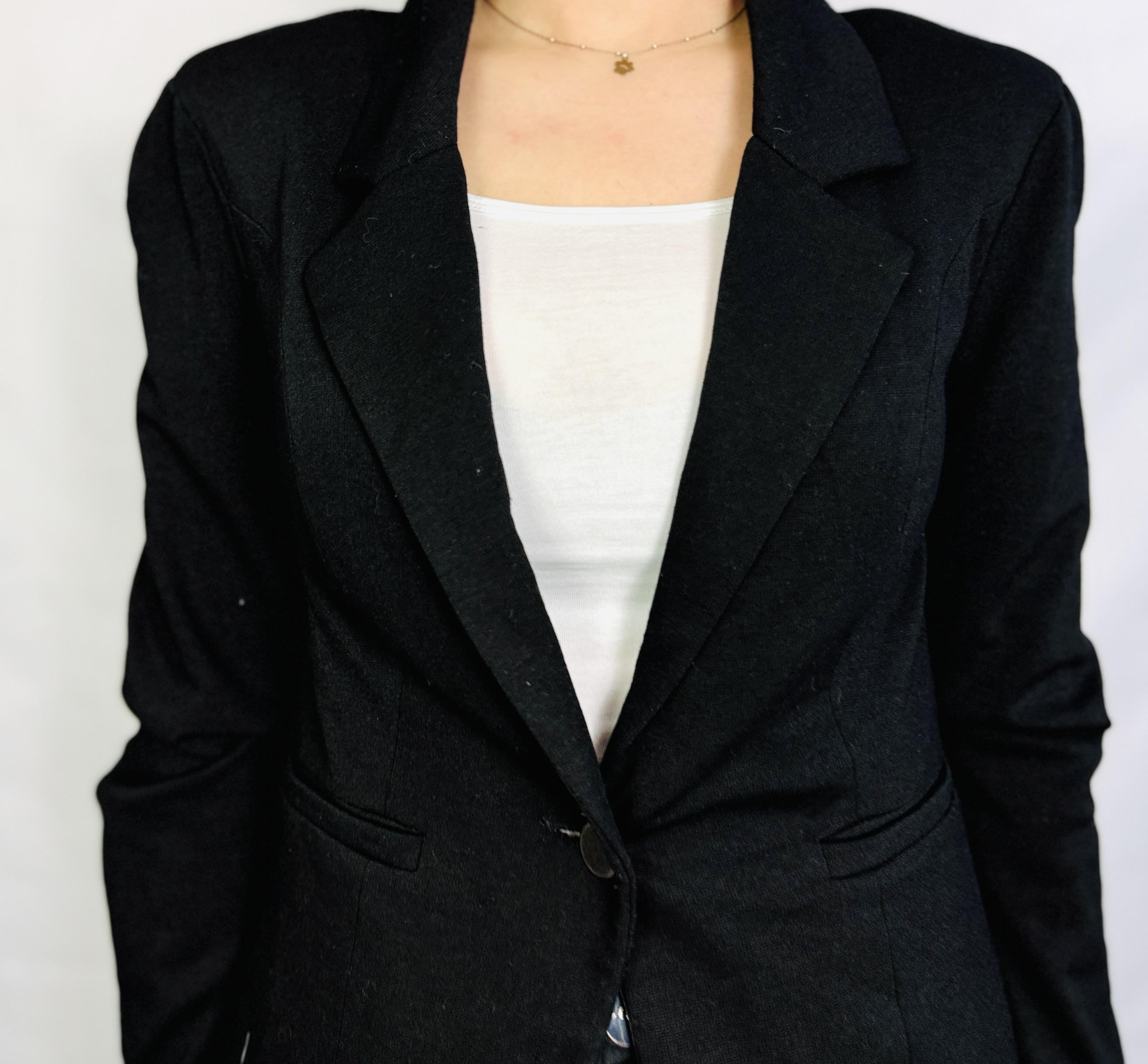 To klasyczny, kobiecy żakiet o wyrafinowanej prostocie, który łączy uporządkowaną formę z subtelną, elegancką nutą. Głęboka czerń nadaje mu ponadczasowego charakteru, a przede wszystkim uniwersalności — to element garderoby, który buduje dopracowany, spokojny wizerunek i sprawia, że stylizacja wygląda natychmiast bardziej skomponowanie. Model emanuje spokojną pewnością siebie i delikatną kobiecością, idealny gdy zależy nam na schludnym, a jednocześnie eleganckim efekcie.