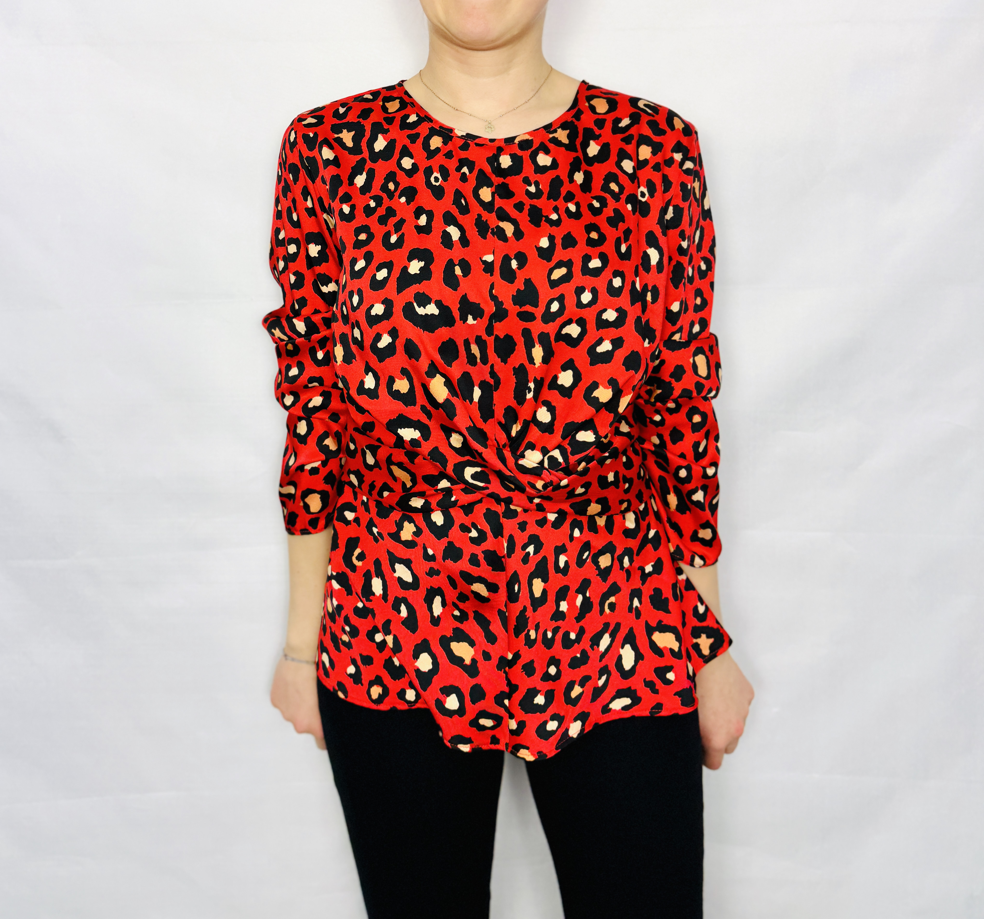 Materiał ma wyraźnie gładkie, delikatnie połyskujące wykończenie i wygląda na lekko lejący, co daje ładny, płynny ruch i miękko otula ciało bez efektu sztywności. Dzięki tej płynności wzór cętki układa się naturalnie, a marszczenie w pasie tworzy atrakcyjne przejścia światła i cienia, podkreślając dekoracyjny charakter zabiegu taliującego. Bluzka subtelnie modeluje sylwetkę: skoncentrowane wiązanie przy pasie przyciąga wzrok do środka, optycznie podkreślając talię i tworząc wrażenie bardziej proporcjonalnej figury — to rozwiązanie korzystne dla osób pragnących zaakcentować kobiece kształty lub zrównoważyć proporcje sylwetki.