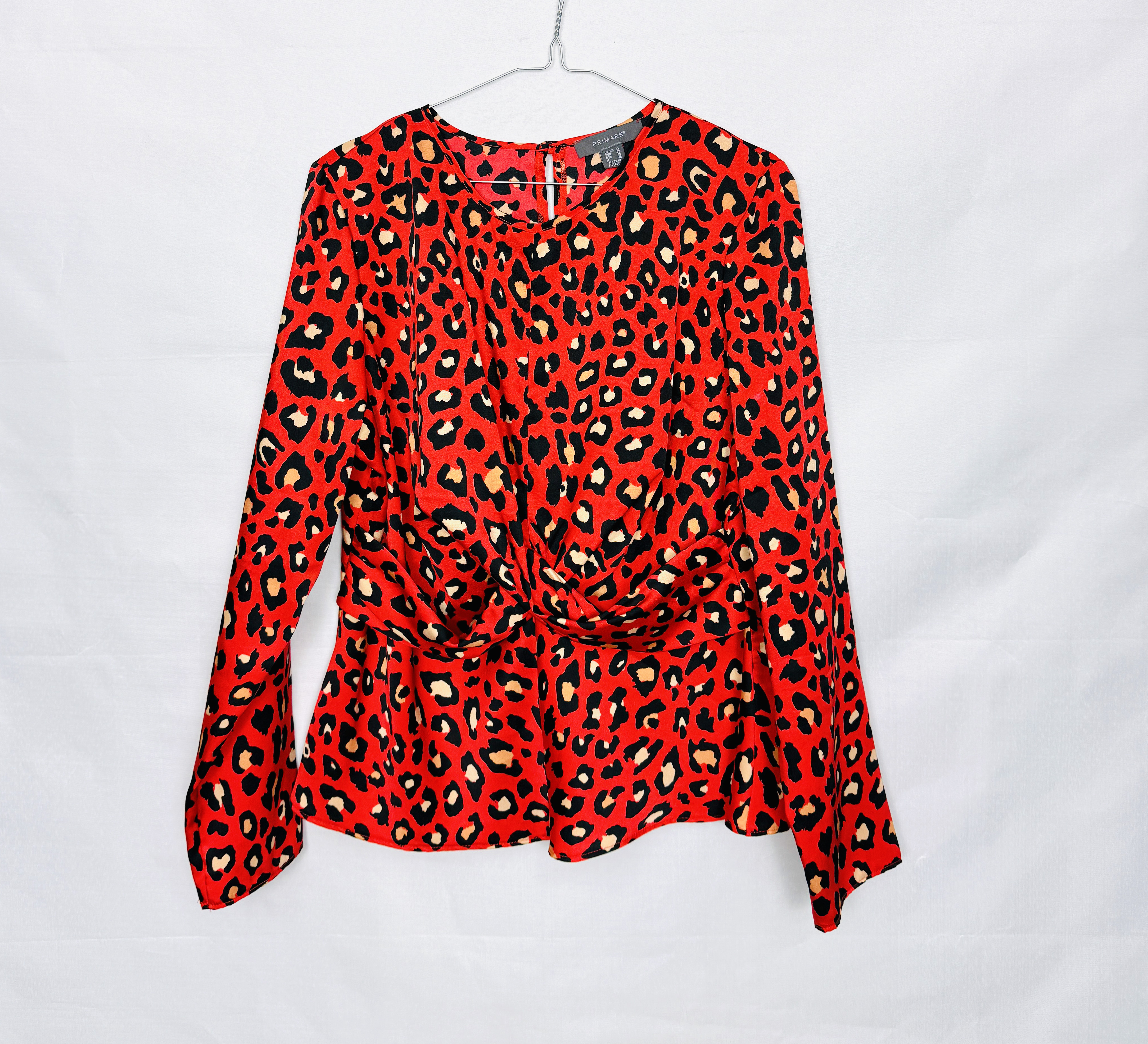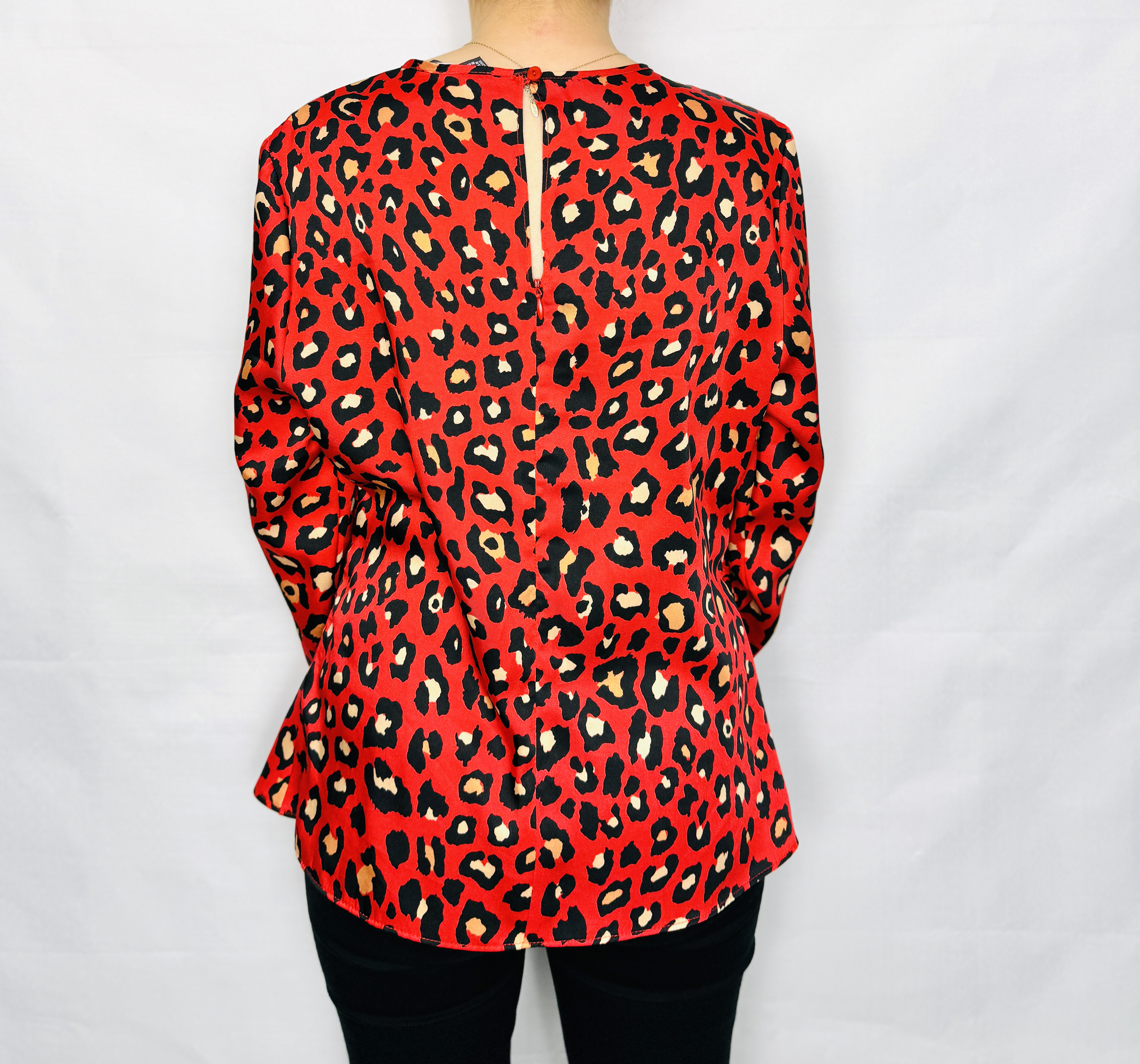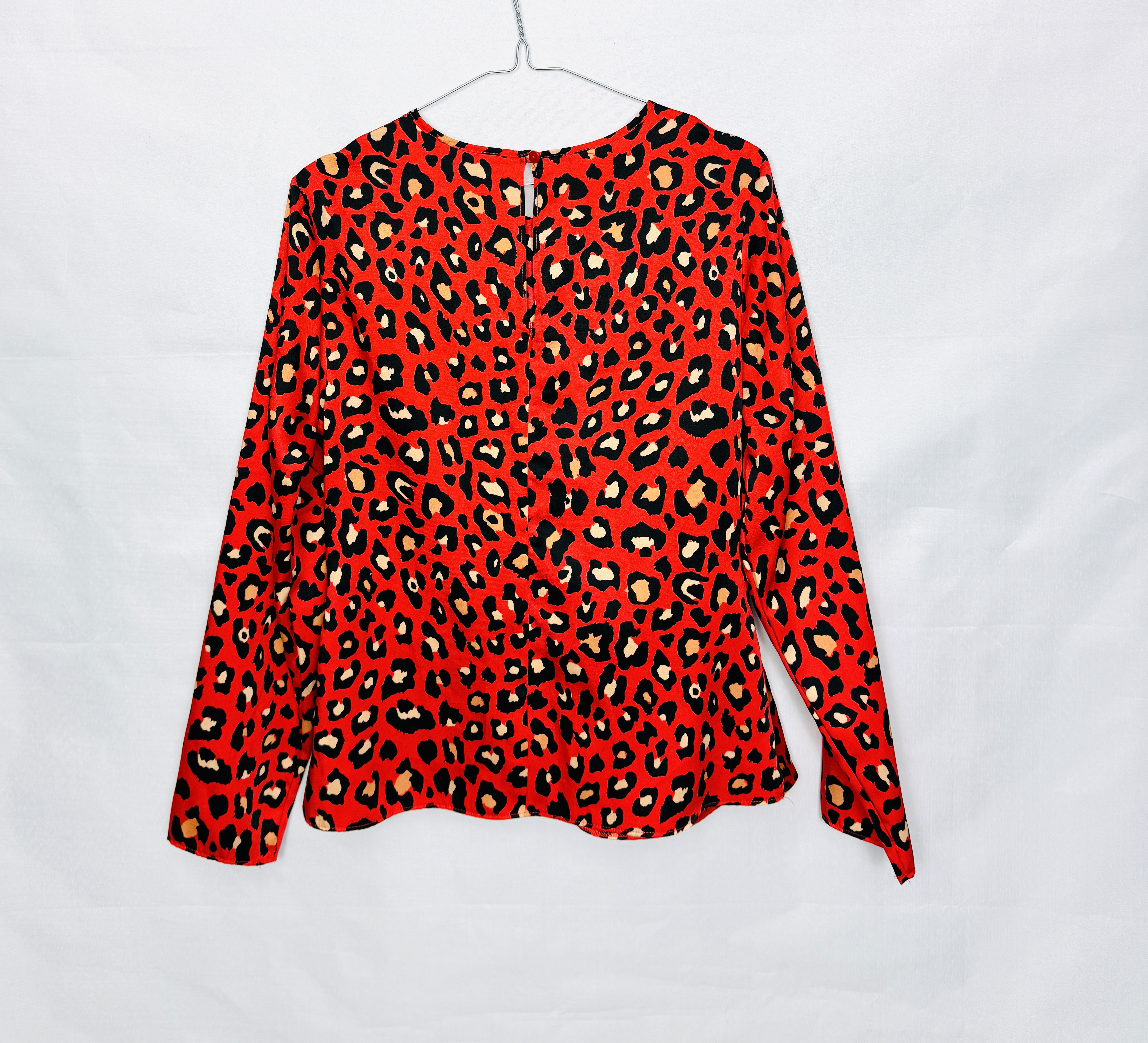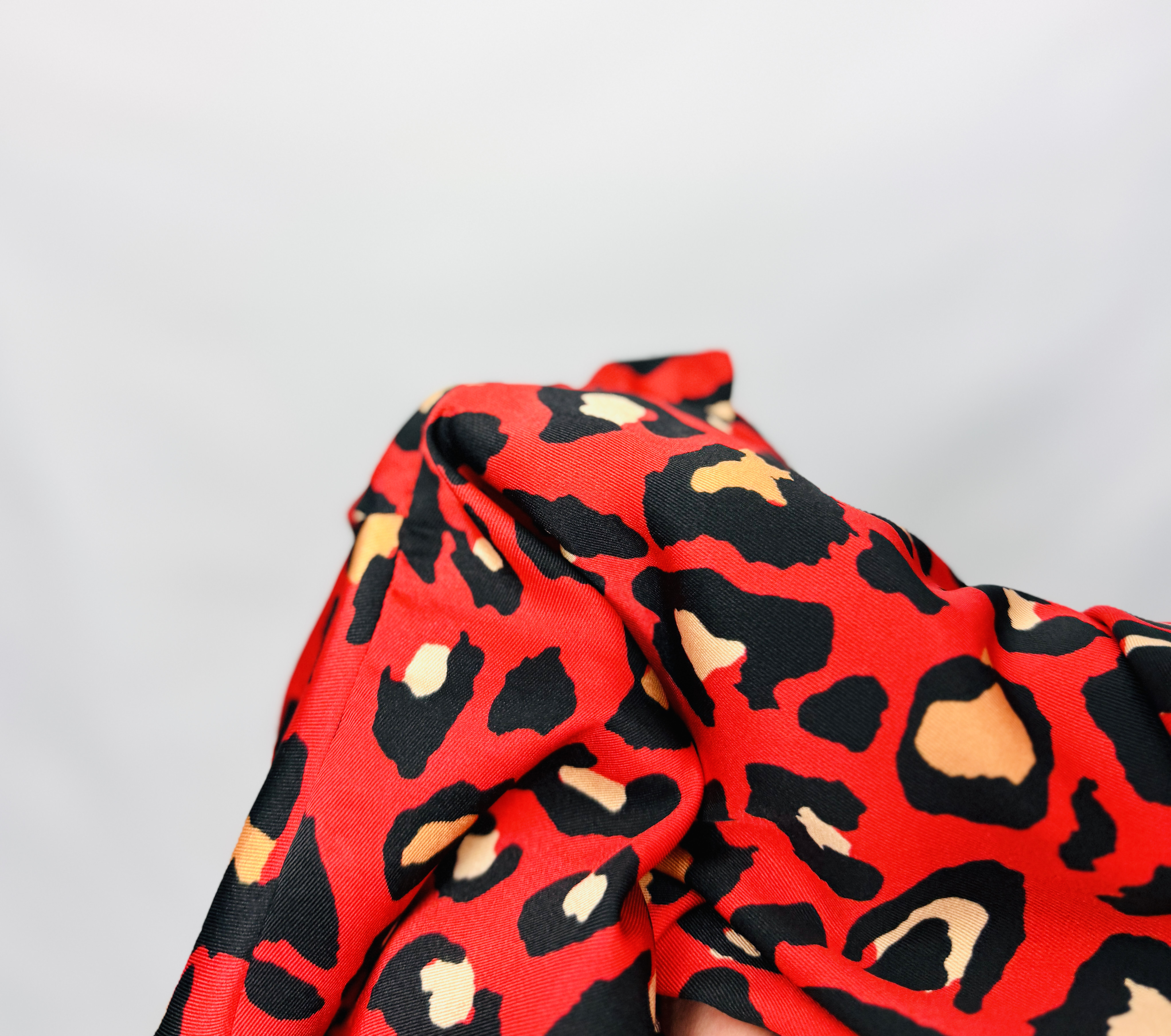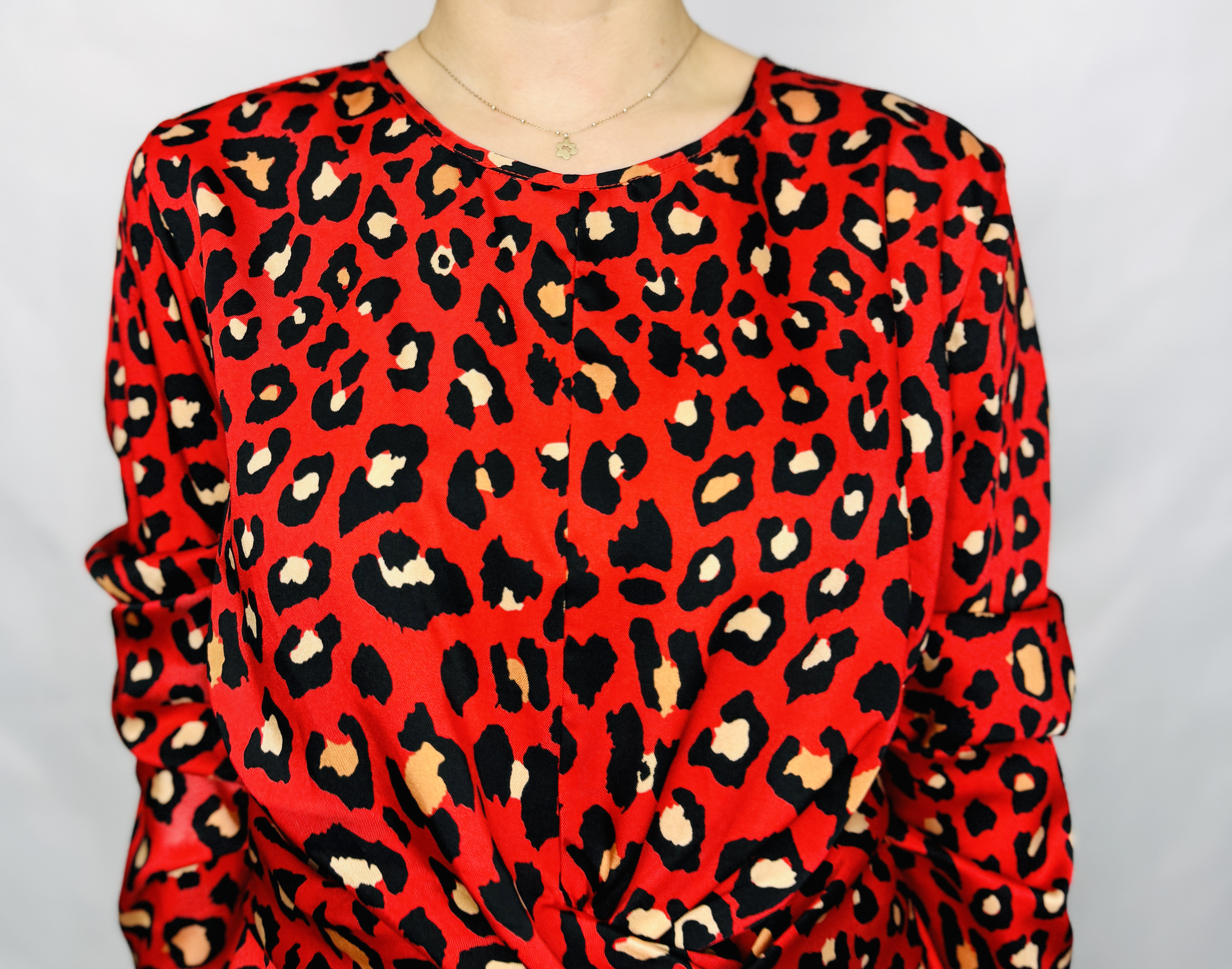 Ta bluzka to odważne i kobiece połączenie wyrazistego wzoru i płynnej elegancji. Intensywna, ciepła czerwień przełamana jest dynamicznym, czarno‑beżowym motywem cętek, który dodaje całości zmysłowego, lekko drapieżnego charakteru, nie tracąc przy tym szykownej lekkości. Projekt ma w sobie teatralny akcent, ale jednocześnie pozostaje niezwykle noszalny — to propozycja dla osób ceniących wyraziste elementy garderoby, które potrafią podkreślić osobowość i dodać pewności siebie w codziennych, jak i wieczorowych stylizacjach.