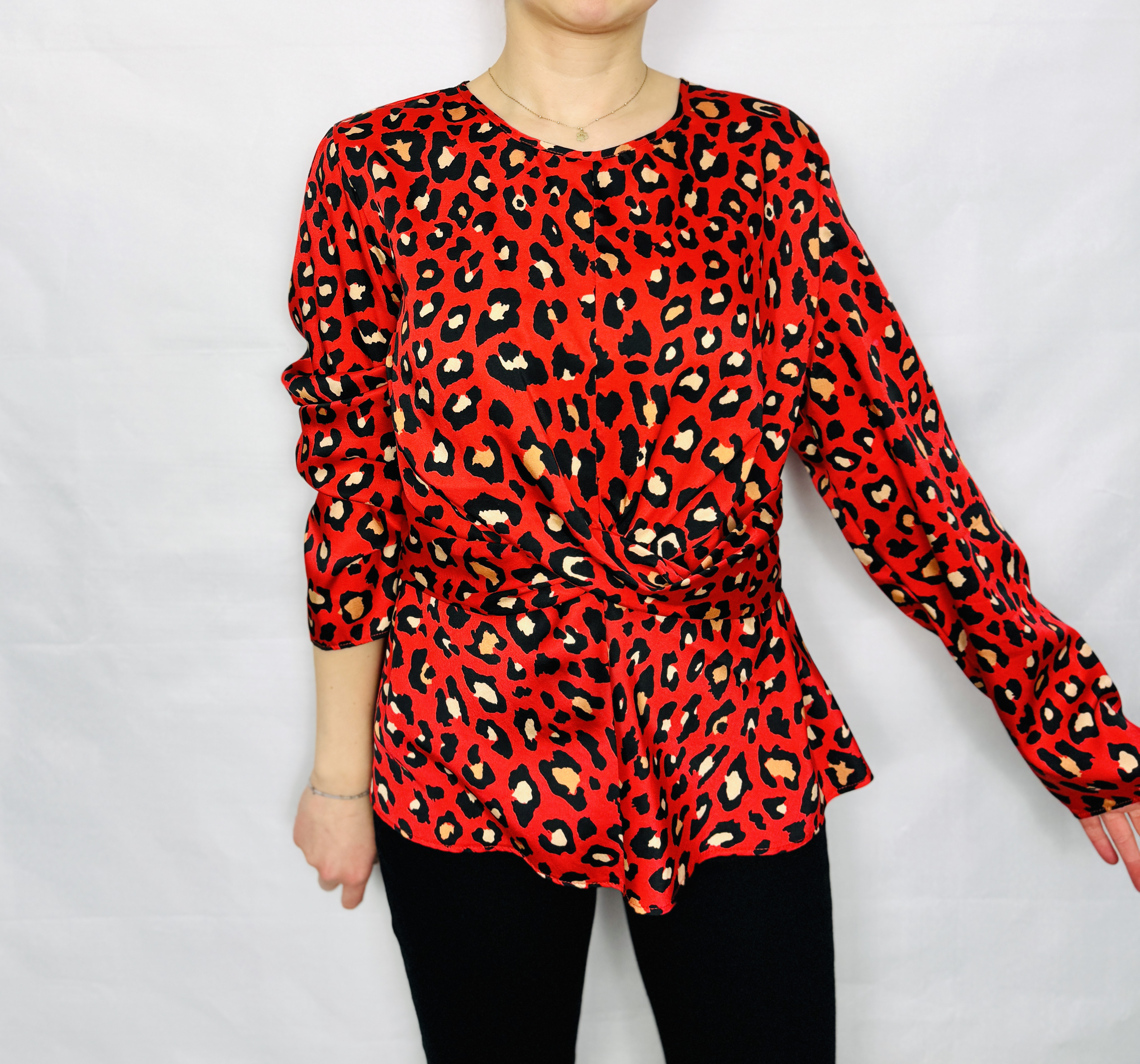 To uniwersalny element garderoby, który sprawdzi się zarówno w wersjach codziennych, jak i bardziej dopracowanych. Na co dzień zestaw z dopasowanymi czarnymi jeansami i loafersami stworzy świeży, miejski look; do pracy bluzka zyska bardziej formalny charakter w połączeniu z czarnymi cygaretkami i eleganckimi mokasynami lub niskimi szpilkami; na wieczór warto łączyć ją ze skórzaną spódnicą lub wąskimi spodniami i wyrazistymi szpilkami, co podkreśli jej zmysłowy wydźwięk. Kolorystyka pięknie współgra z klasyczną czernią, beżami i camelami, a także z głębokim granatem czy butelkową zielenią; dodatki w tonacjach złota podkreślą ciepły akcent cętków i dodadzą stylizacji szykownego blasku.
