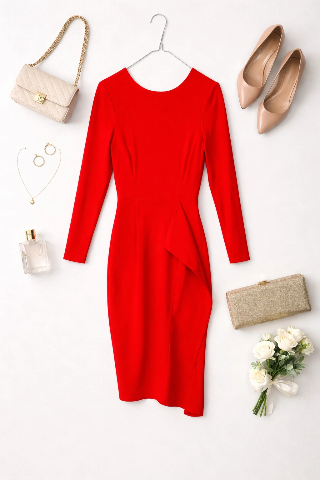 Czerwona sukienka dopasowana z falbaną świetnie odnajduje się w różnych stylizacjach. Na eleganckie wyjścia można zestawić ją z klasycznymi szpilkami i subtelną biżuterią w odcieniach złota lub srebra. Na bardziej stonowane okazje dobrze komponuje się z beżowymi lub czarnymi dodatkami. Czerwień pięknie łączy się z czernią, beżem, złotem i bielą, co pozwala tworzyć wyraziste, a jednocześnie eleganckie zestawy.