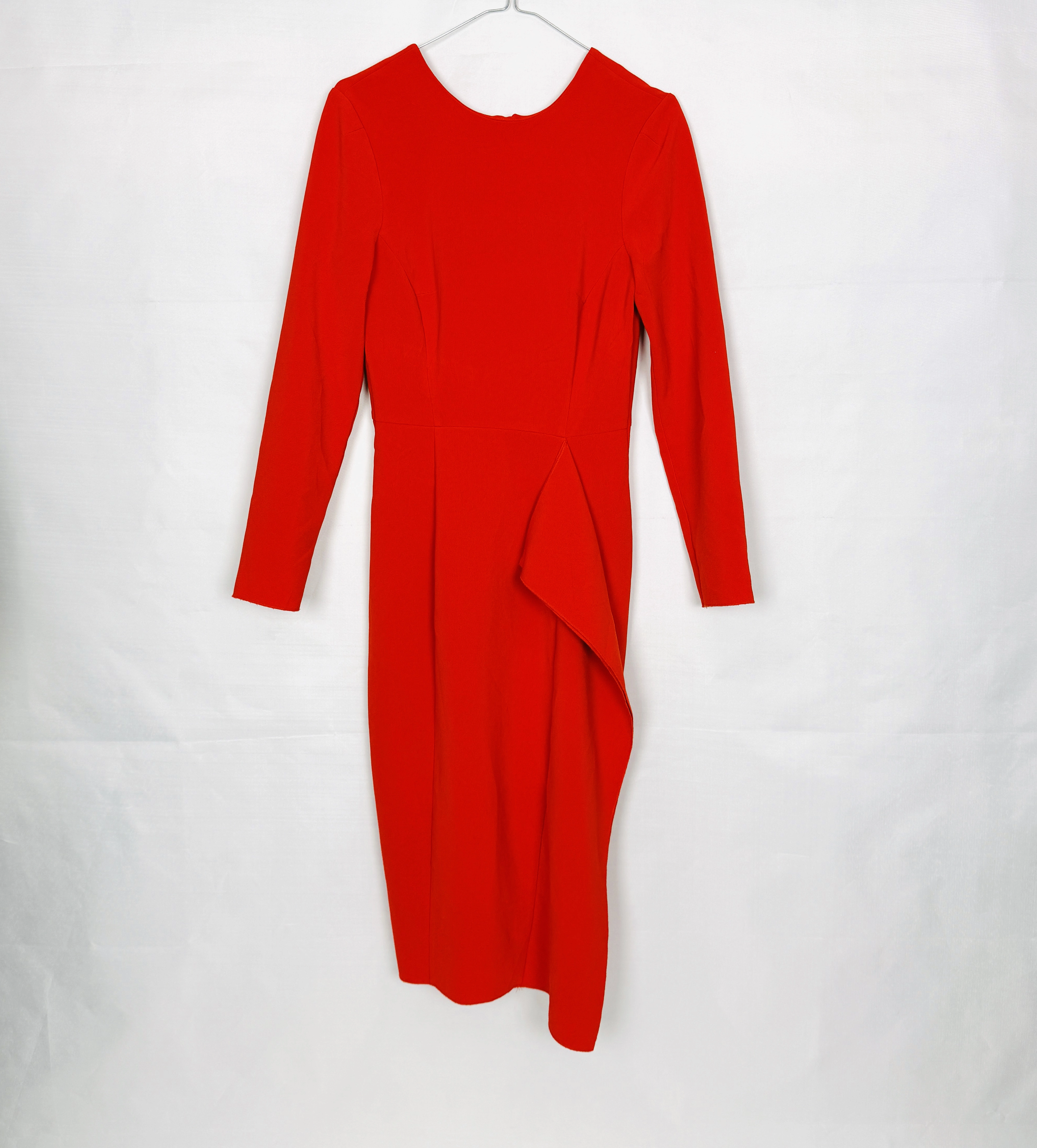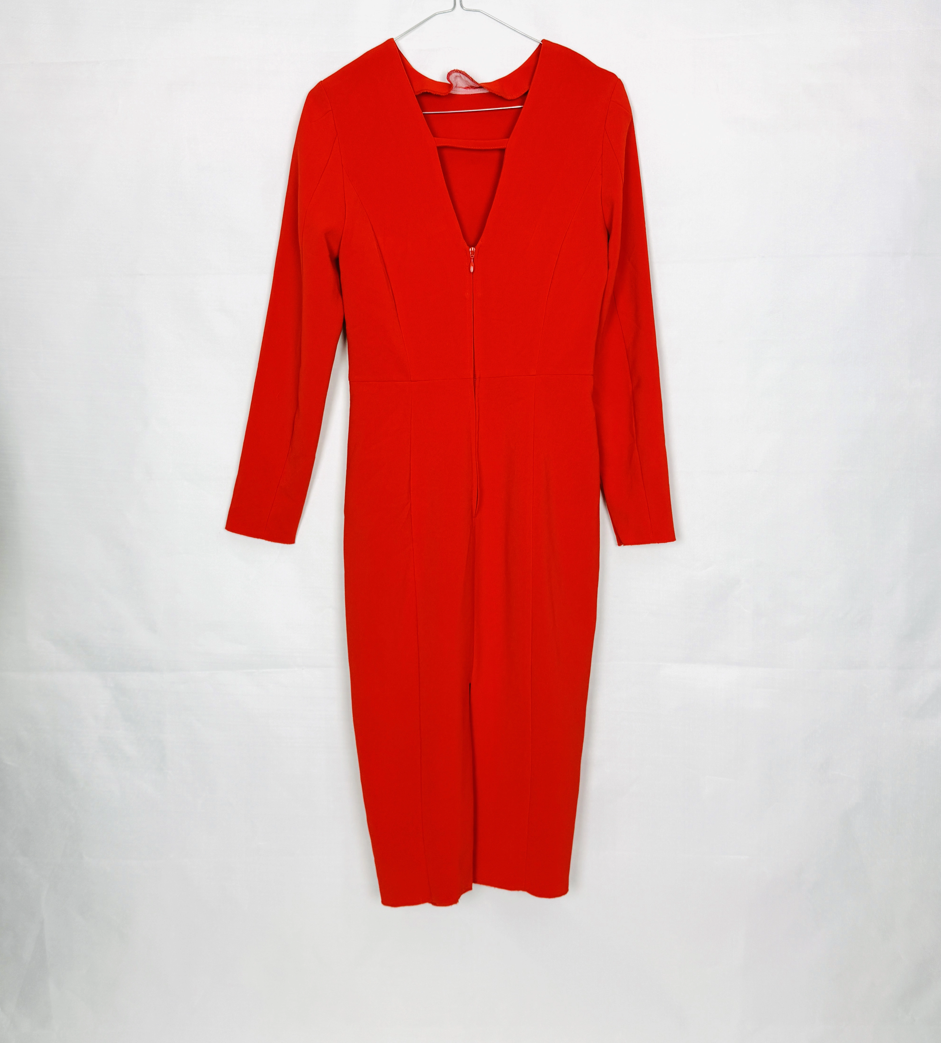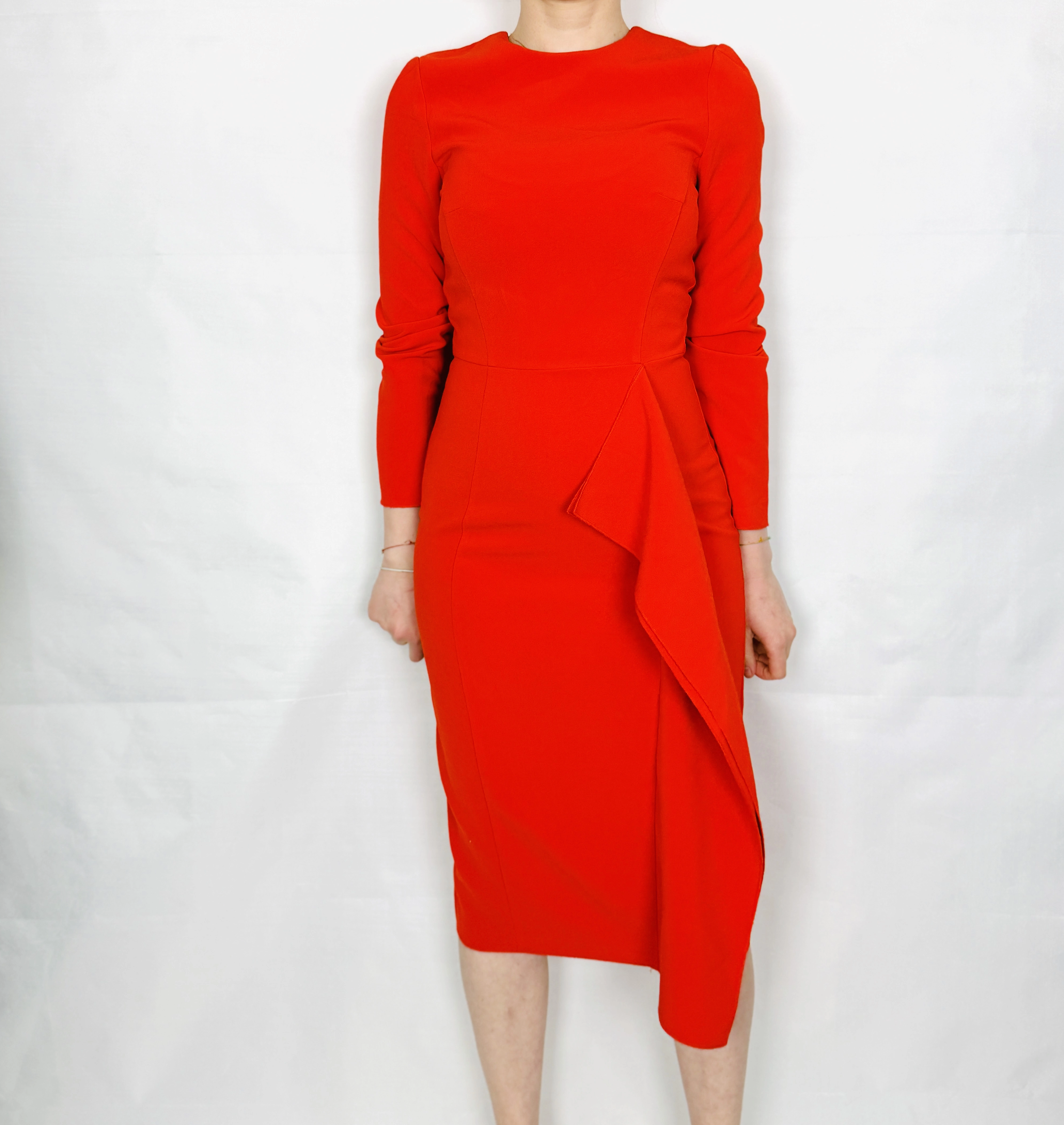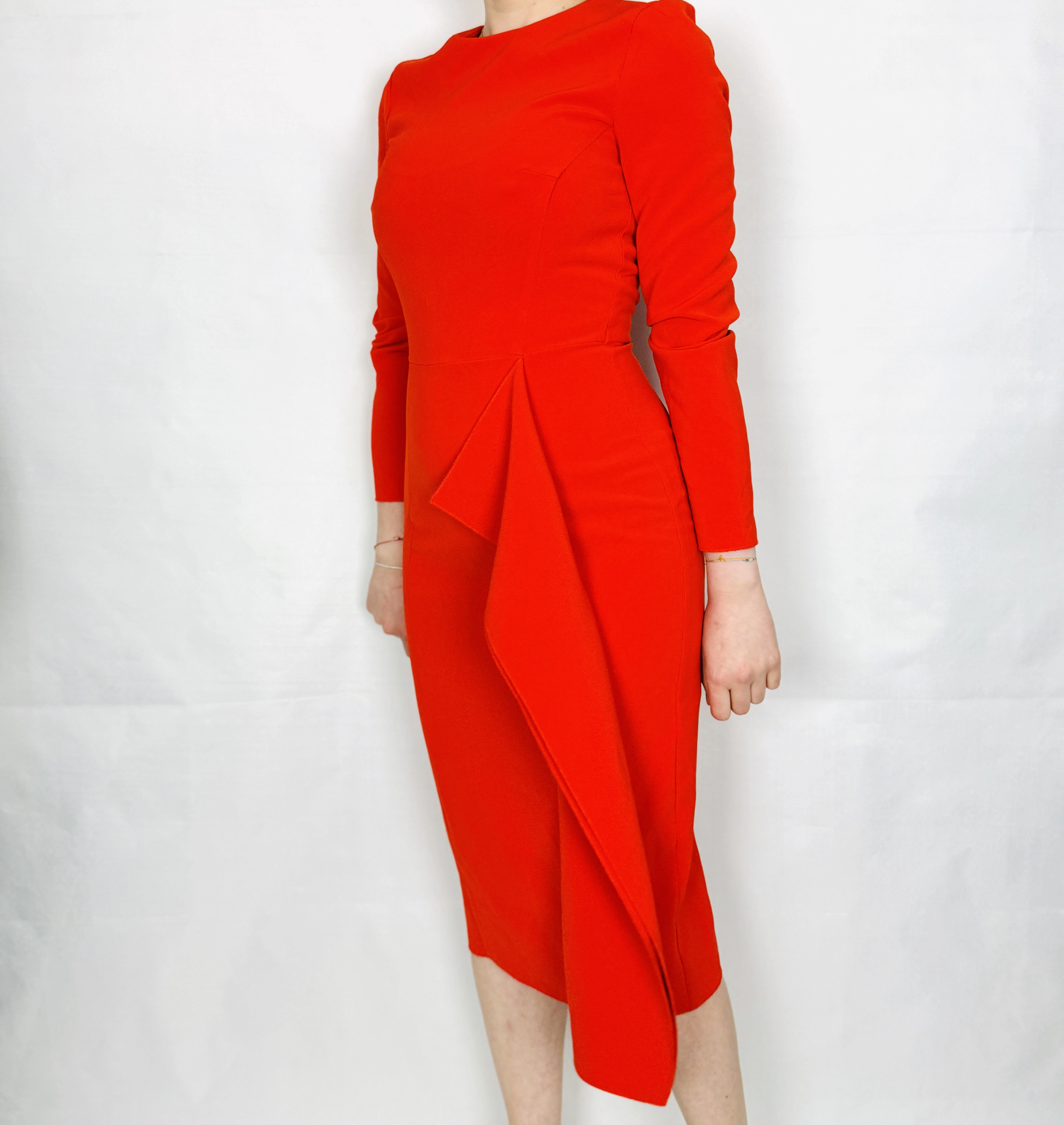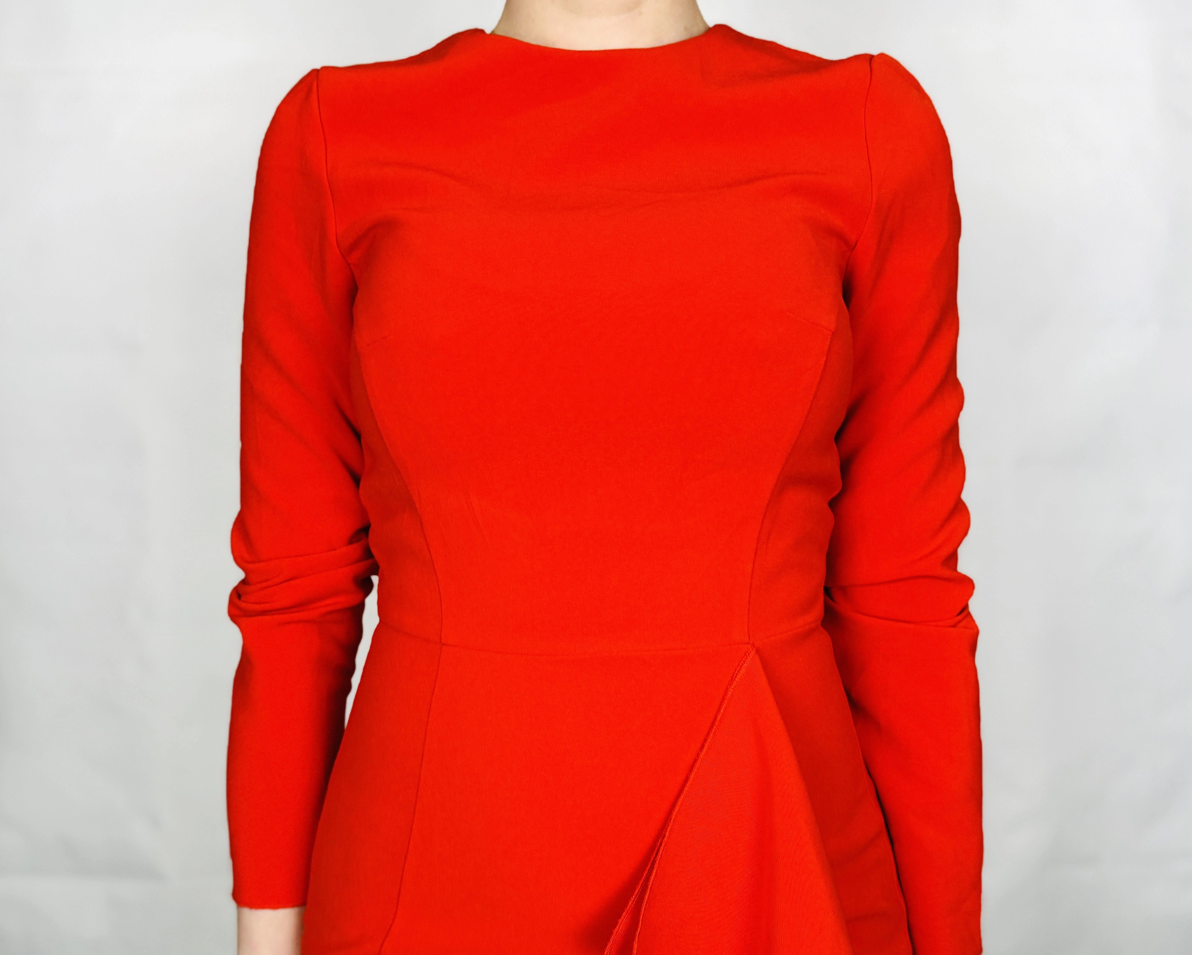Fason sukienki jest dopasowany, co pięknie eksponuje sylwetkę i podkreśla jej naturalne linie. Góra ma zabudowany, klasyczny dekolt o łagodnym wykończeniu, który równoważy intensywność koloru i nadaje całości eleganckiego charakteru. Długie rękawy wysmuklają ramiona i sprawiają, że model świetnie sprawdzi się również w bardziej formalnych stylizacjach.