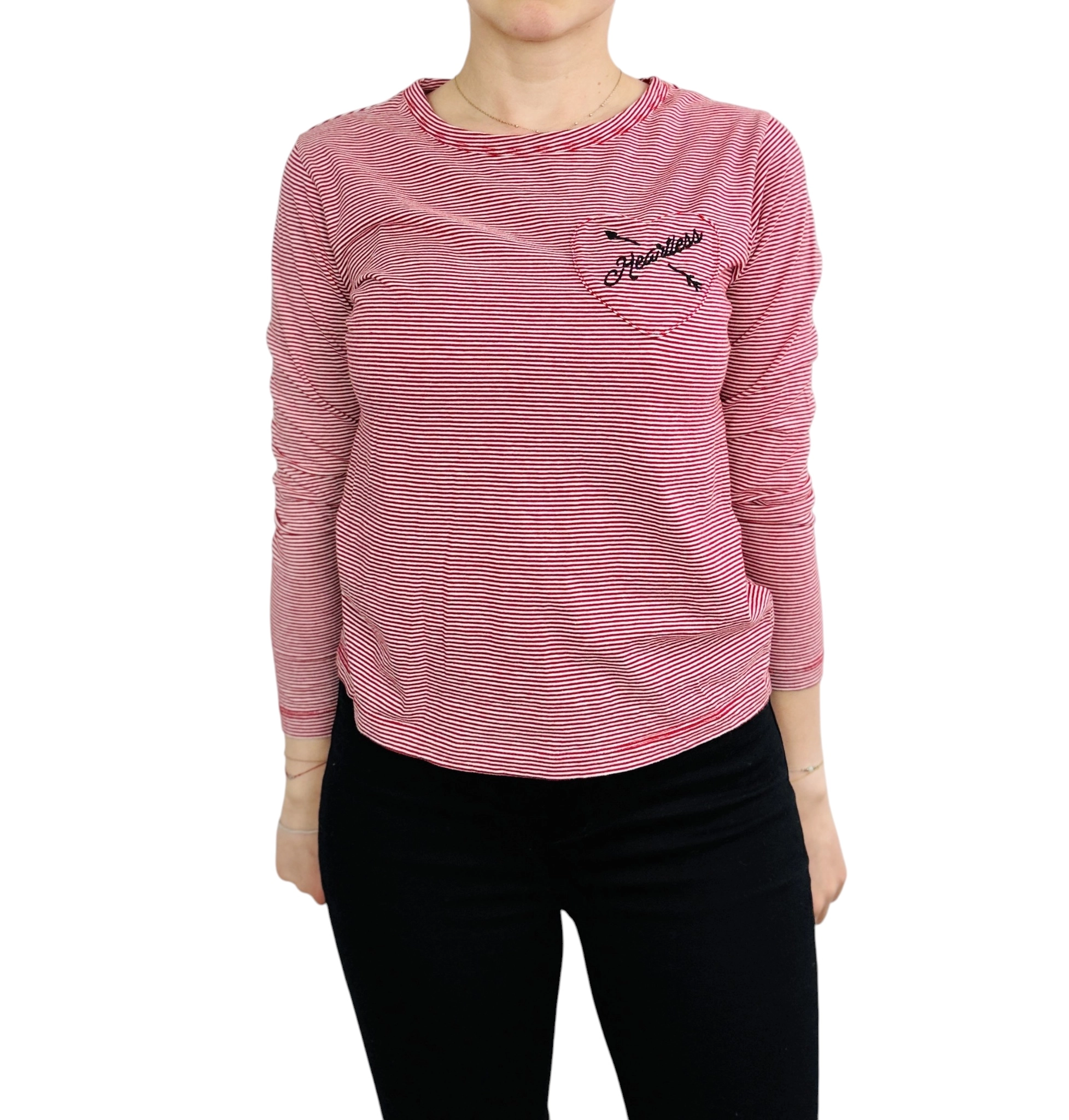 Ta czerwono biała bluzka w paski to połączenie klasycznej prostoty z subtelnym, kobiecym akcentem, które nadaje stylizacji świeżości i lekkości. Delikatne, cienkie paski w intensywnym odcieniu czerwieni na tle czystej bieli tworzą harmonijną i uniwersalną kompozycję, która doskonale wpisuje się w codzienne i casualowe stylizacje. Urok tej bluzki podkreśla niewielki haft w kształcie serca z napisem, który dodaje całości indywidualnego charakteru i subtelnej finezji.