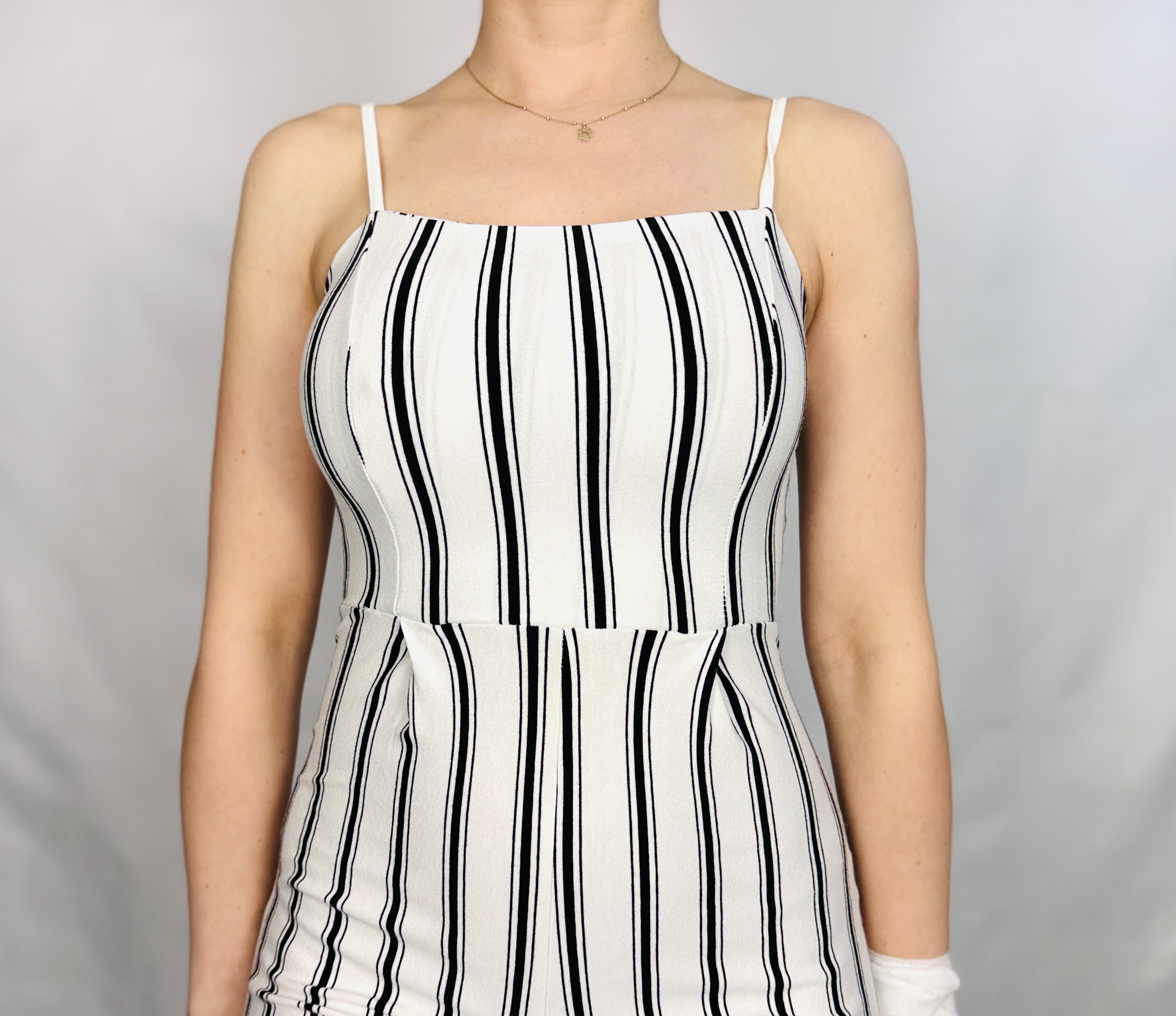 Ten kombinezon to świeża, kobieca opowieść o lekkości i uporządkowanej elegancji — ecru tło z wyraźnymi, pionowymi czarnymi paskami tworzy stylową, wysmuklającą kompozycję, która jednocześnie jest delikatna i nowoczesna. Forma łączy prostotę z subtelną figuratywnością: gładka góra o minimalistycznym kroju i cienkich ramiączkach nadaje projektowi zwiewnego, niemal romantycznego wyrazu, podczas gdy pionowe pasy podkreślają linię sylwetki, dodając jej lekkości i proporcji.