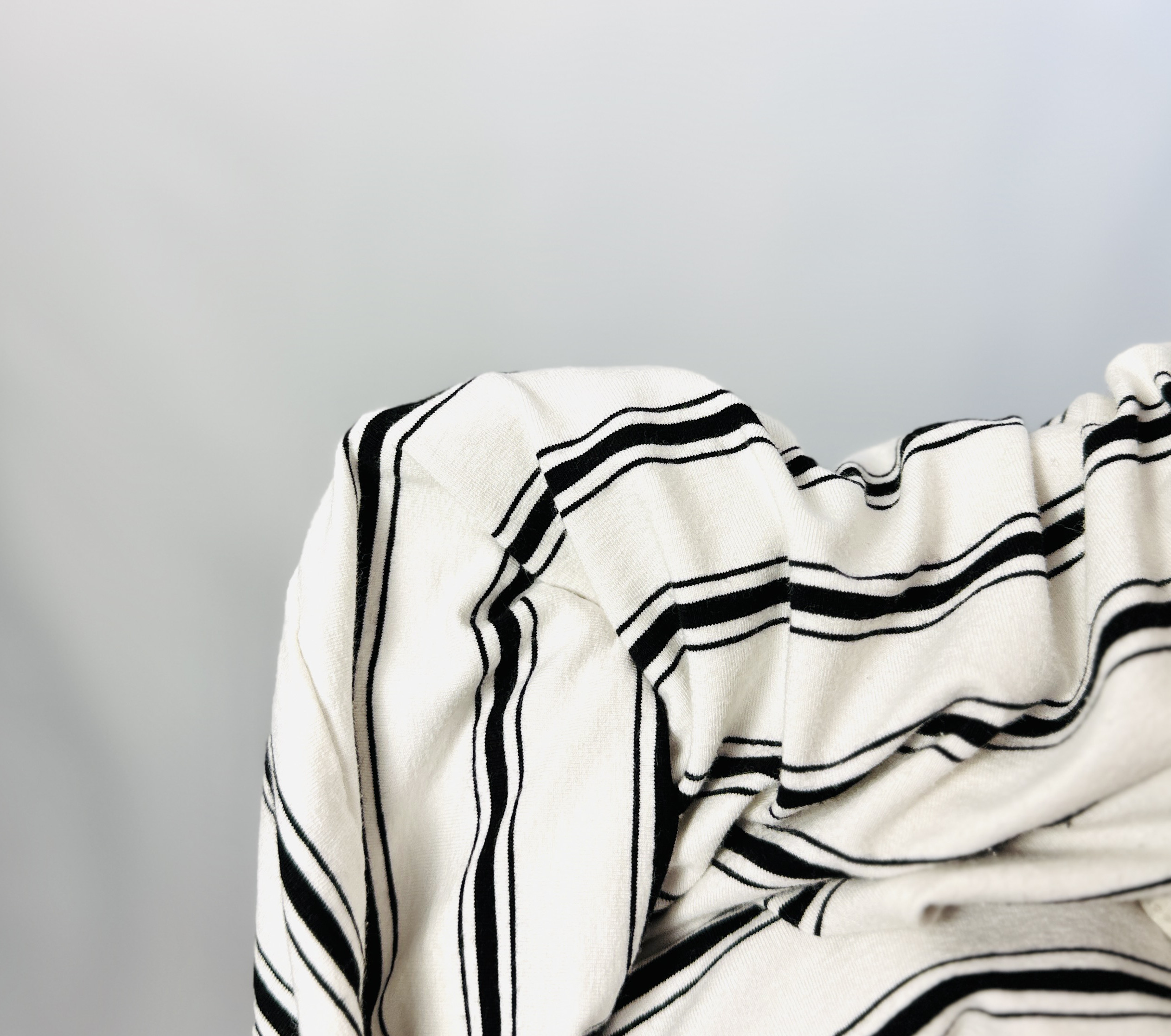 Tkanina prezentuje się jako gładka i lekko lejąca, z umiarkowaną elastycznością, co pozwala kombinezonowi podążać za kształtami ciała, nie krępując ruchów. Powierzchnia ma subtelne, matowe wykończenie, które uwydatnia kontrast pomiędzy ecru a czarnymi pasami, dzięki czemu wzór wygląda świeżo i estetycznie. Materiał wydaje się na tyle lekki, że model sprawdzi się w cieplejsze dni, a jednocześnie na tyle uporządkowany, by zachować czystą linię kroju.