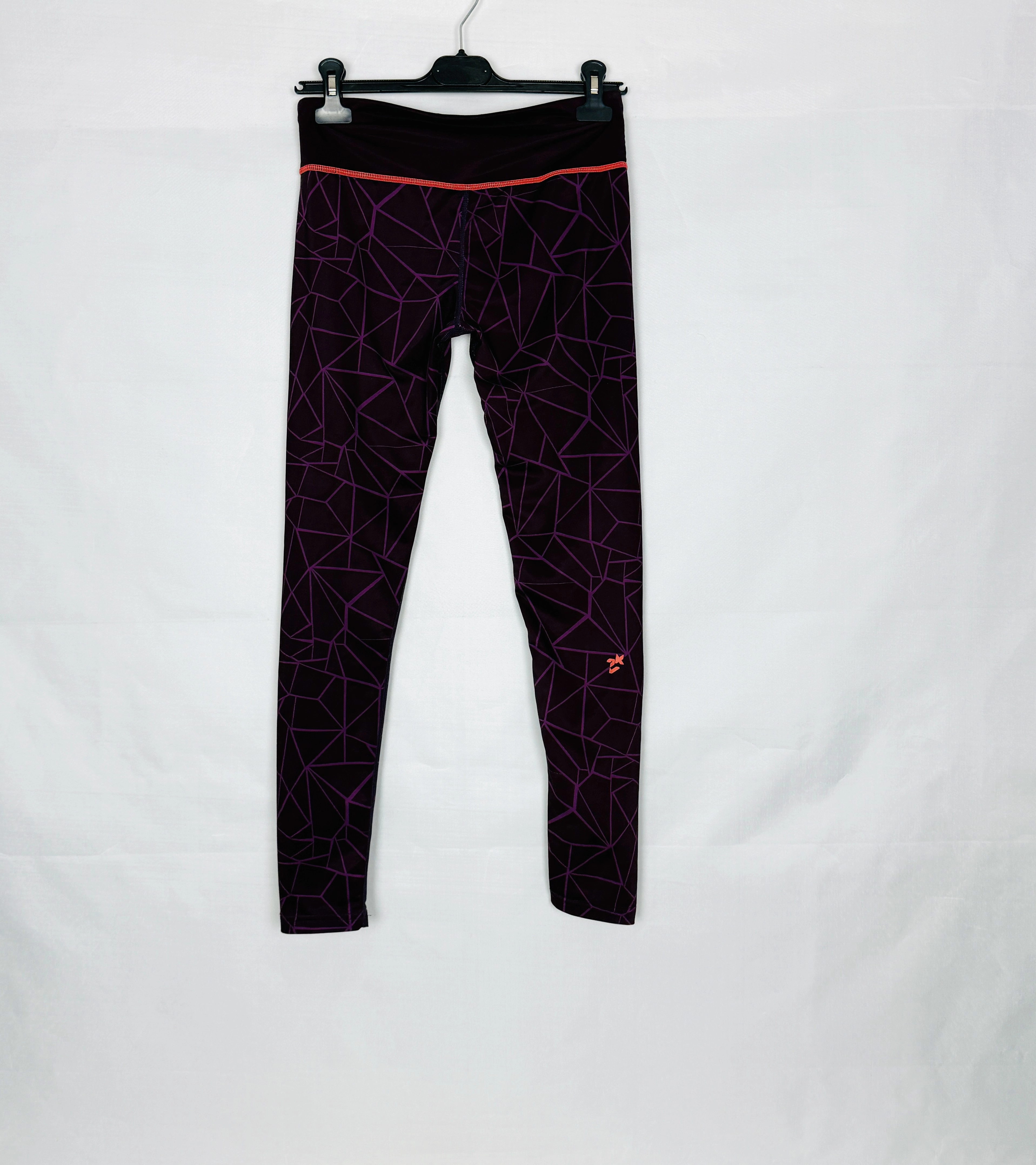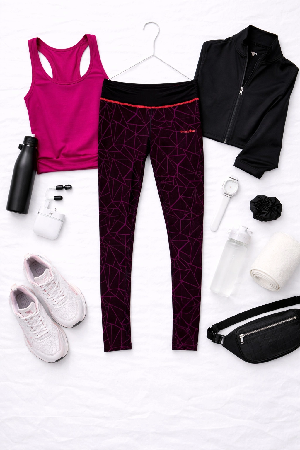 Fason spodni wyróżnia się komfortowym, szerokim stanem, który w nastrojowy sposób modeluje okolice talii, zapewniając stabilność i wygodę podczas ruchu. Pas został wykończony subtelnym, radosnym przeszyciem w kontrastowym, koralowym odcieniu, co stanowi elegancki akcent i dodaje projektowi nowoczesnego sznytu. Krój jest idealnie dopasowany do ciała na całej długości, nienagannie przylegając do sylwetki od bioder aż po same kostki. Geometryczny wzór składający się z nieregularnych linii przypominających nastrojową sieć lub kryształy optycznie wysmukla nogi, nadając im radosnego, sportowego blasku.