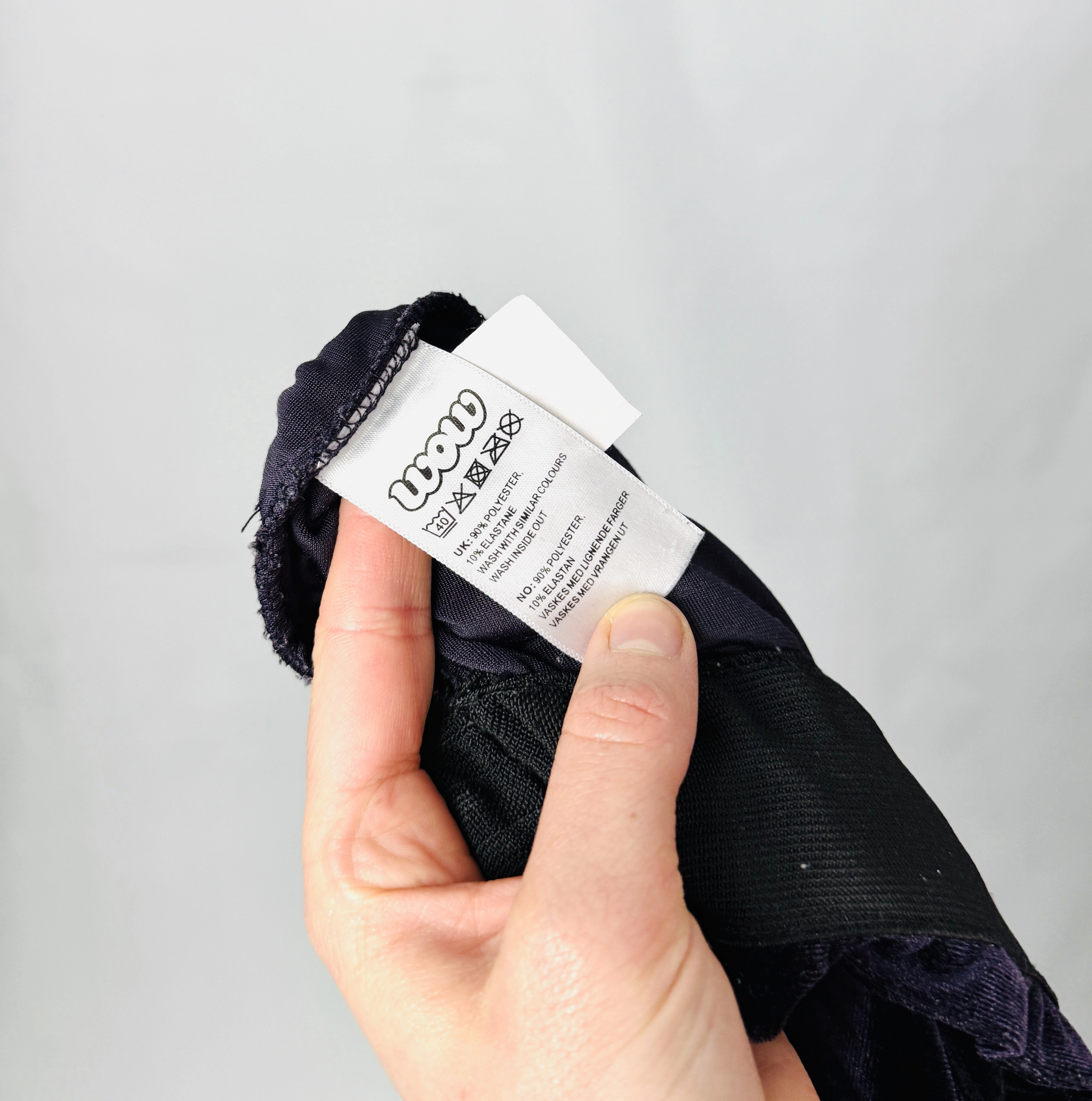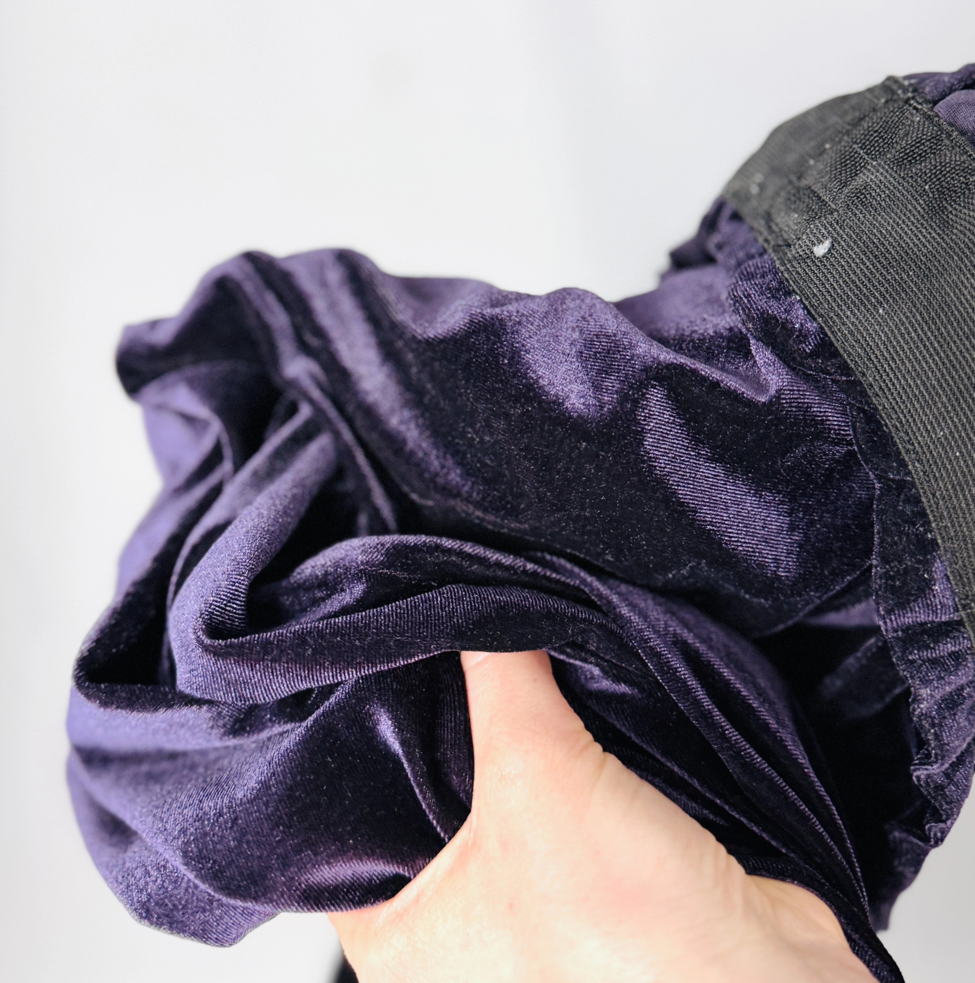 Materiał jest miękki, przyjemnie otulający i delikatnie połyskujący, co potęguje wrażenie elegancji. Aksamitna struktura pięknie odbija światło, tworząc subtelne refleksy i podkreślając głębię koloru. Tkanina układa się płynnie na sylwetce, dodając całości lekkości i zmysłowego charakteru.