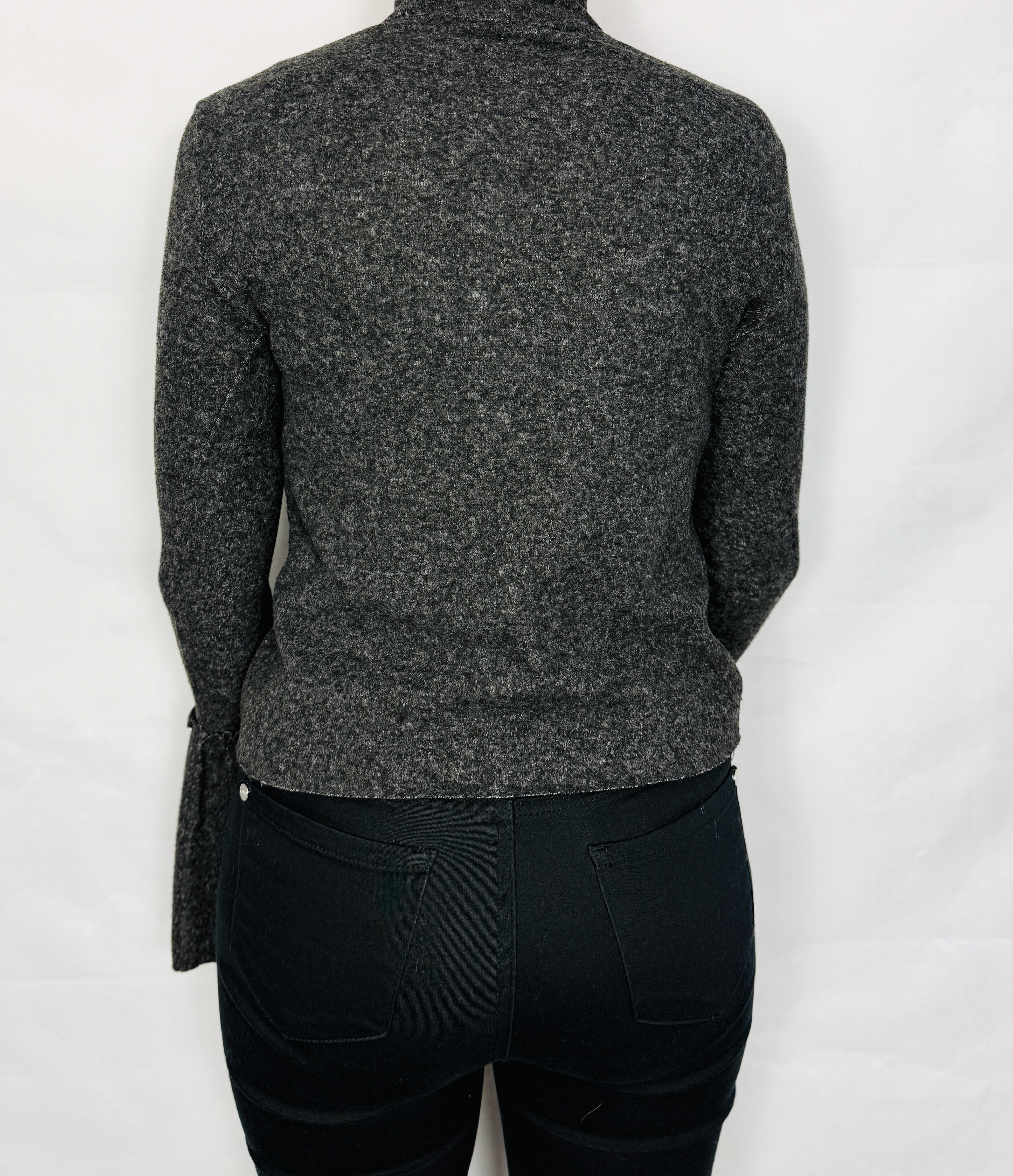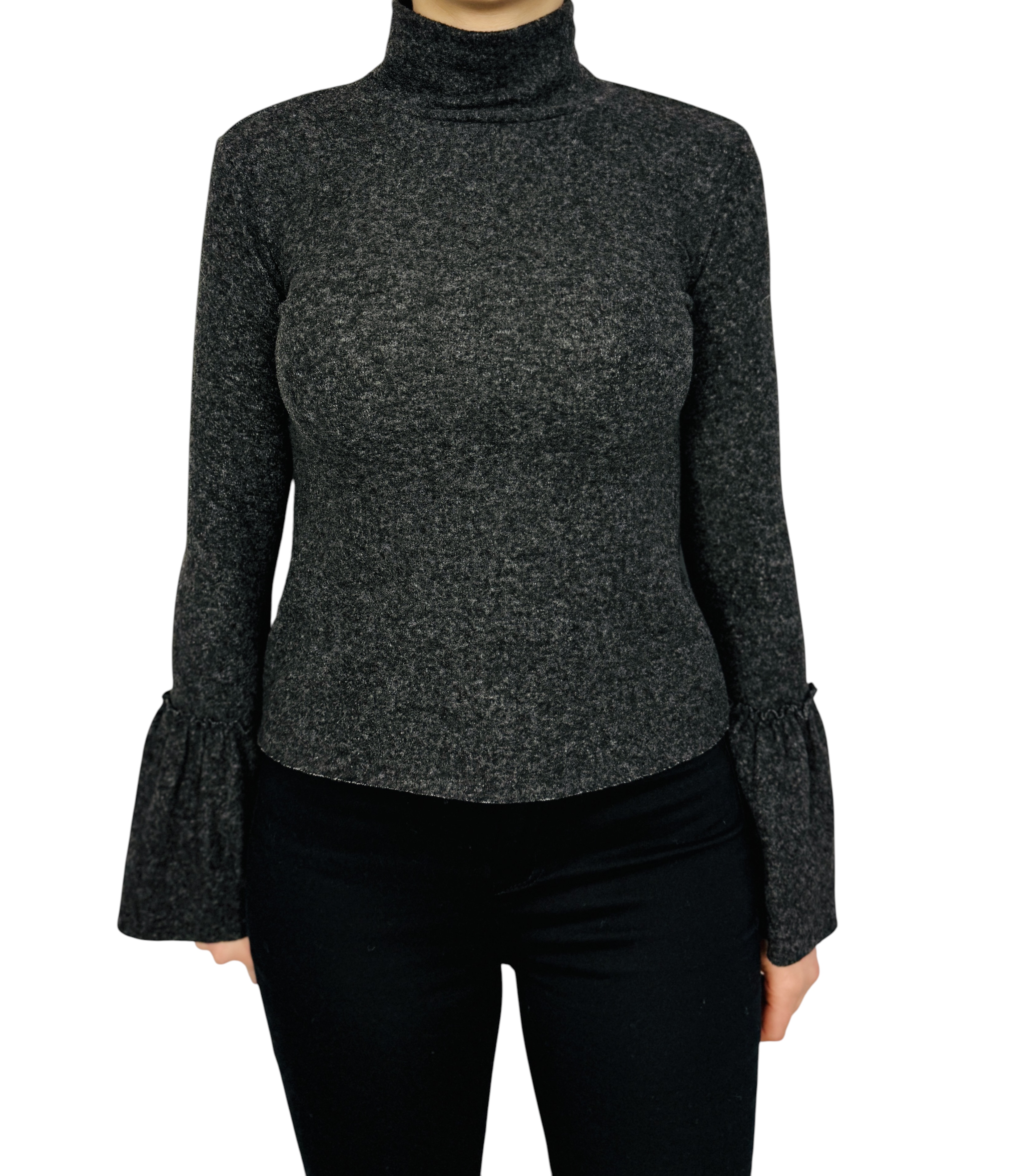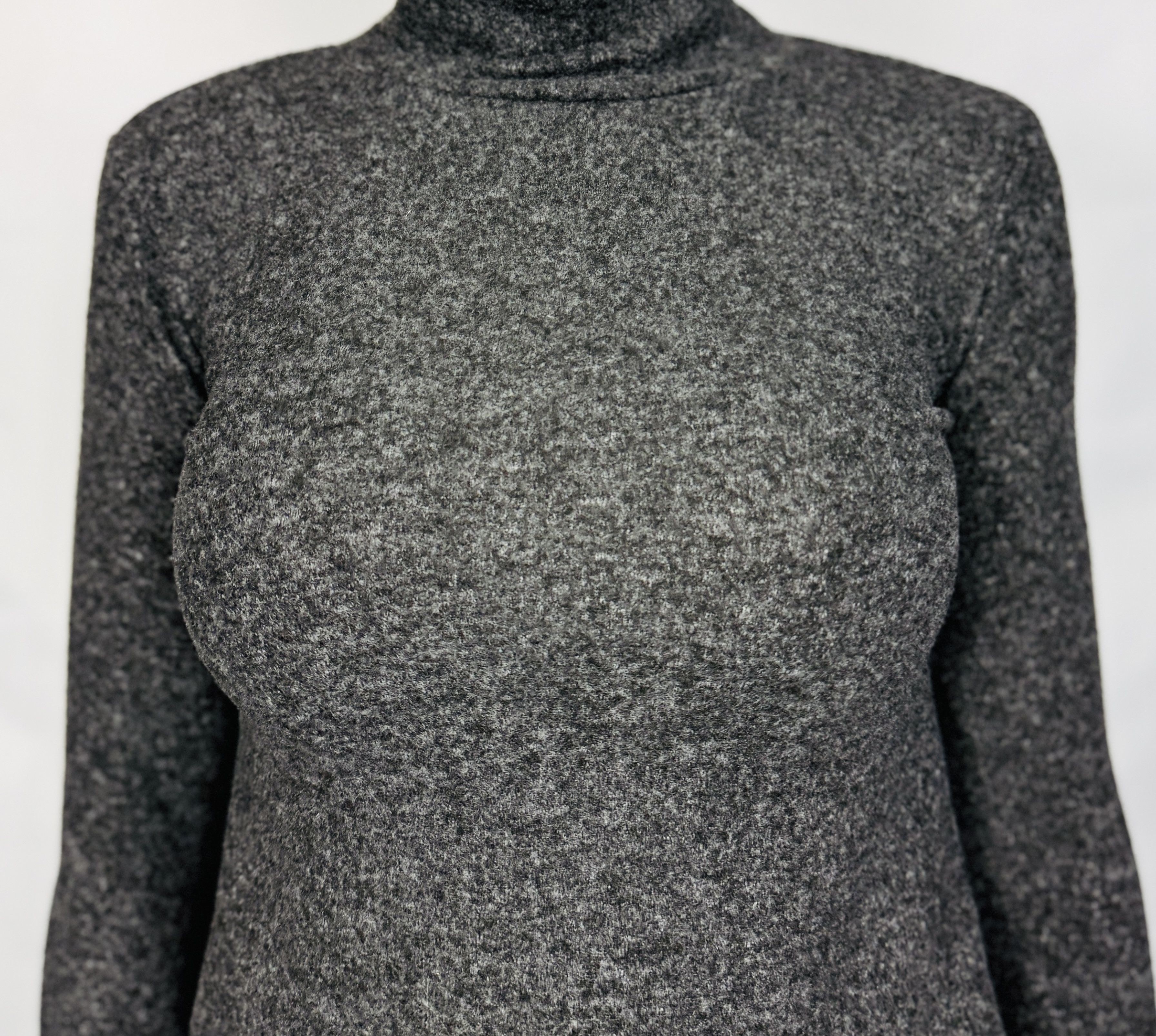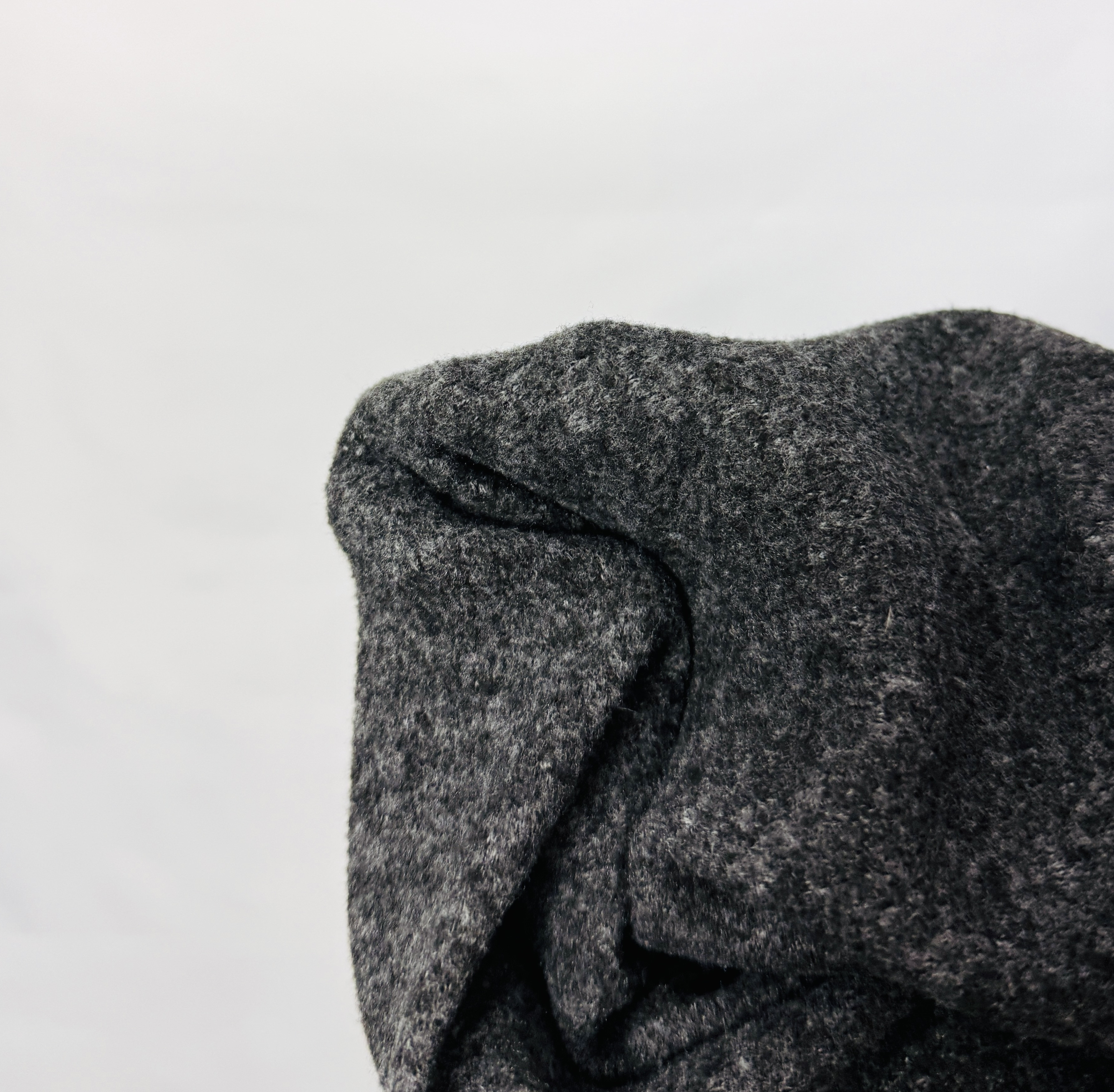 Materiał prezentuje się jako średniej grubości dzianina o delikatnej, niejednorodnej strukturze — wygląda na miękki, lekko włochaty i przyjemnie otulający, co podkreśla przytulny charakter modelu. Powierzchnia tkaniny ma dyskretną fakturę, która nadaje grafitowi subtelną głębię i sprawia, że kolor nie jest monotonną płaszczyzną, lecz eleganckim polem o ciekawym wykończeniu. Dzięki takiej fakturze bluzka ładnie trzyma formę w górnej części ciała, a rozkloszowane mankiety dodają wizualnego kontrastu i lekkości ruchu.