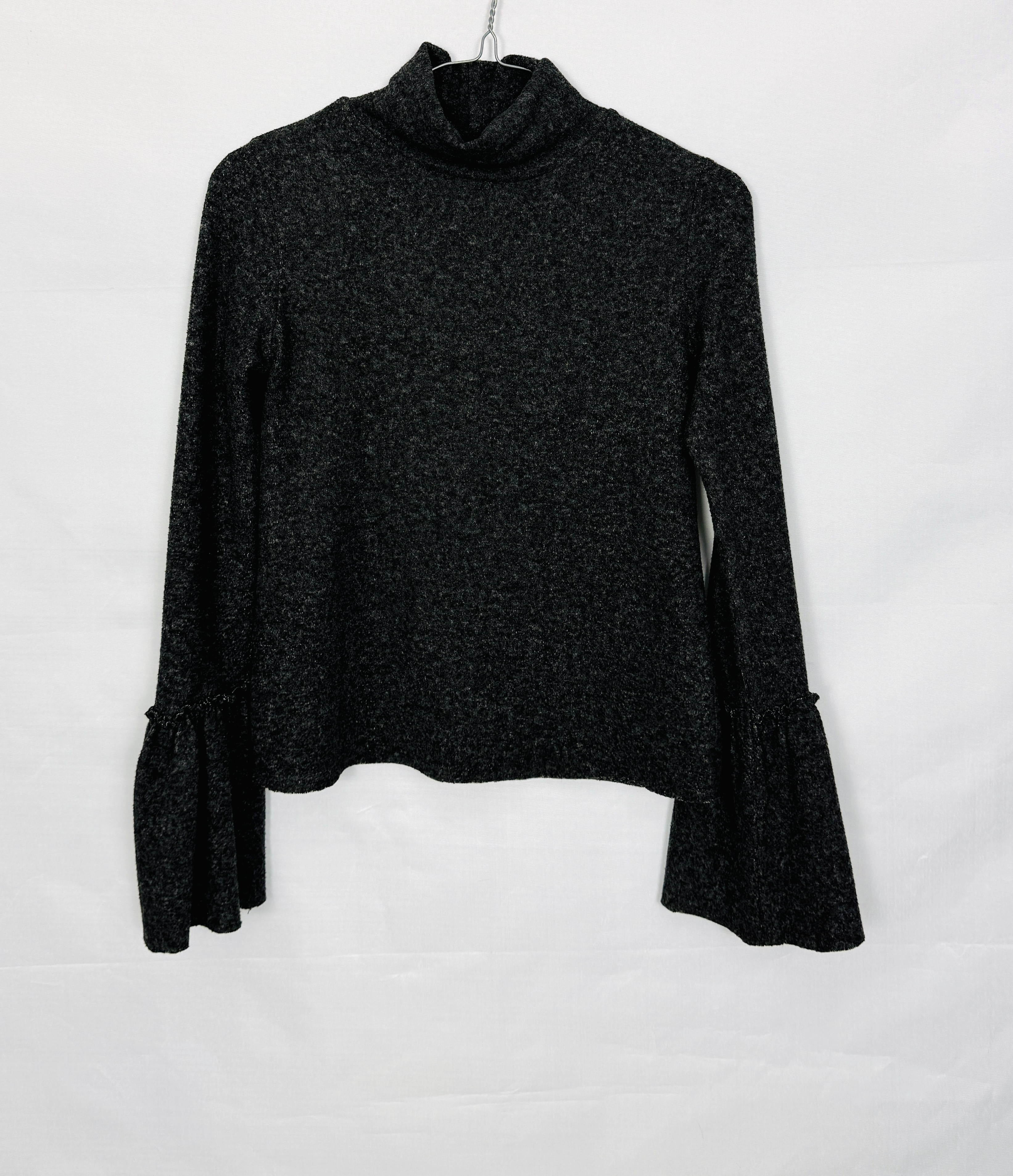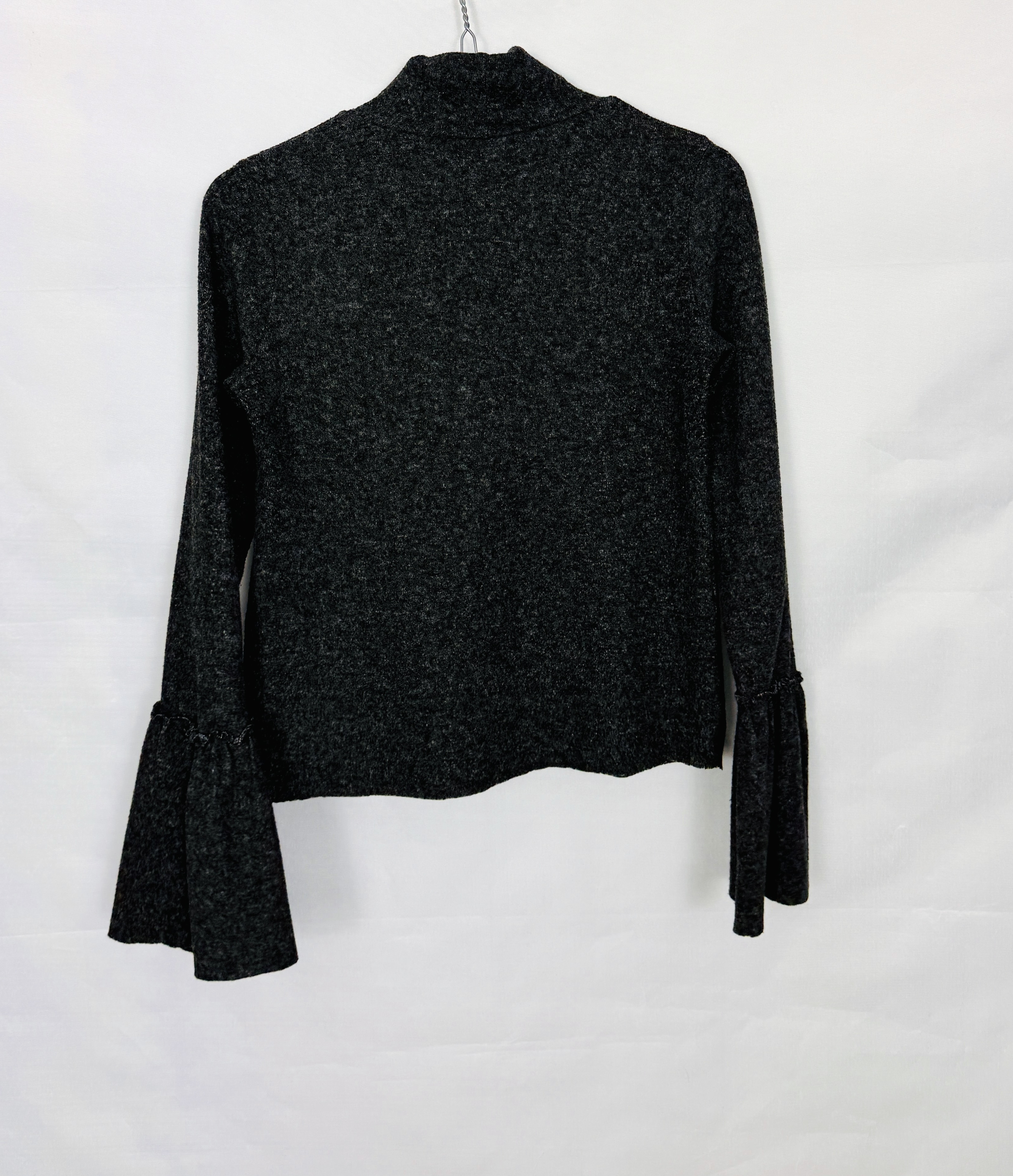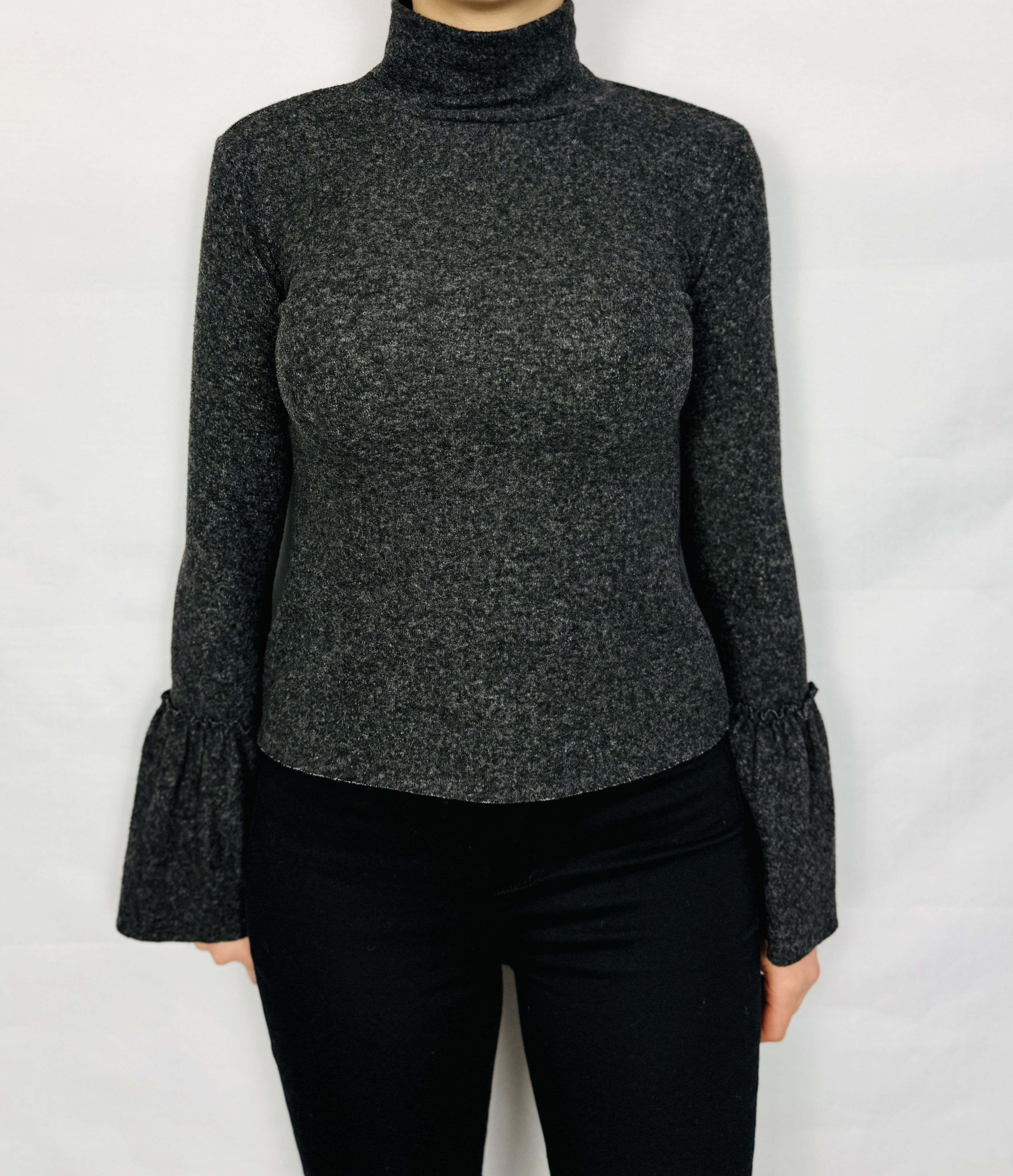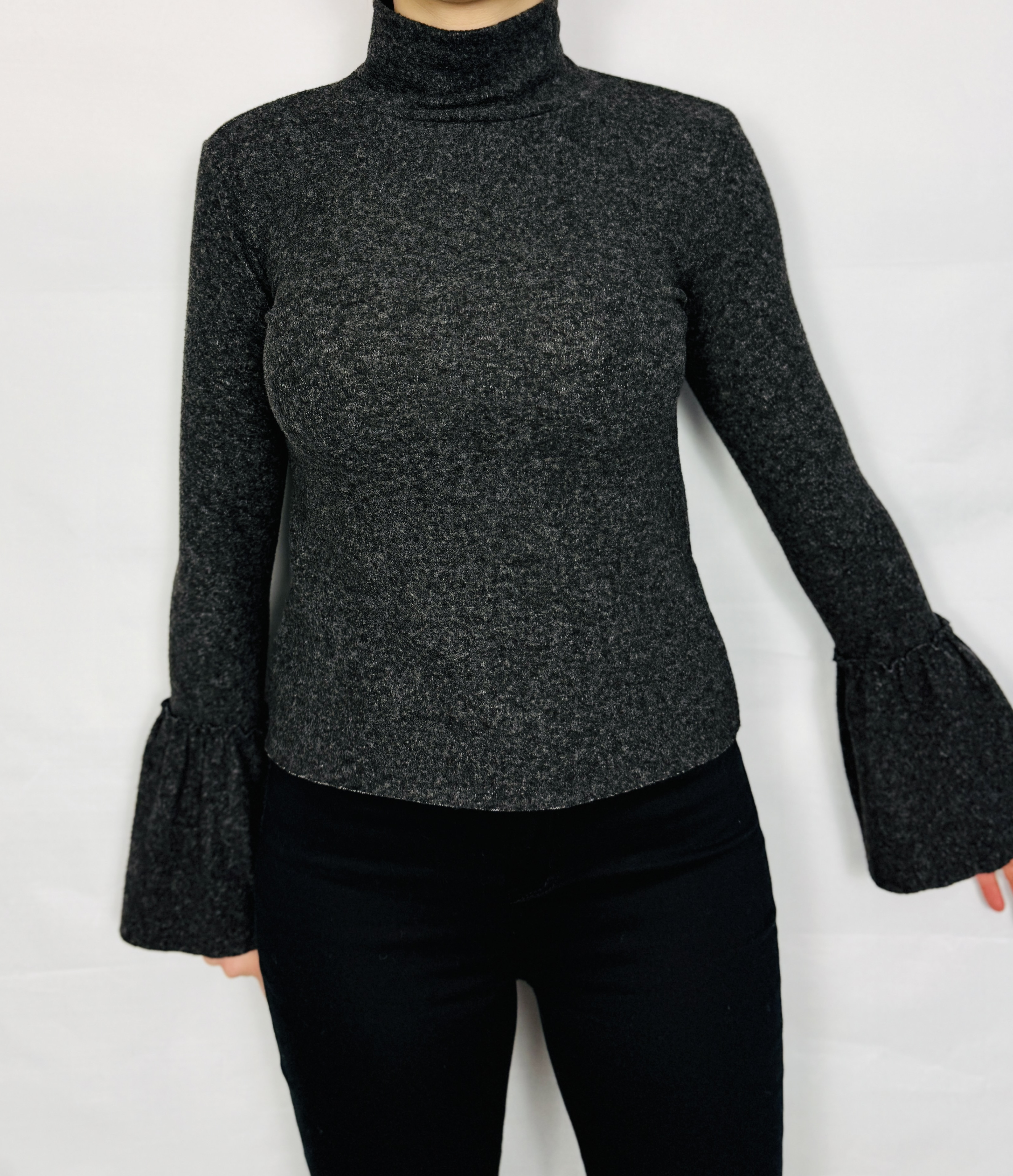 Materiał prezentuje się jako średniej grubości dzianina o delikatnej, niejednorodnej strukturze — wygląda na miękki, lekko włochaty i przyjemnie otulający, co podkreśla przytulny charakter modelu. Powierzchnia tkaniny ma dyskretną fakturę, która nadaje grafitowi subtelną głębię i sprawia, że kolor nie jest monotonną płaszczyzną, lecz eleganckim polem o ciekawym wykończeniu. Dzięki takiej fakturze bluzka ładnie trzyma formę w górnej części ciała, a rozkloszowane mankiety dodają wizualnego kontrastu i lekkości ruchu.