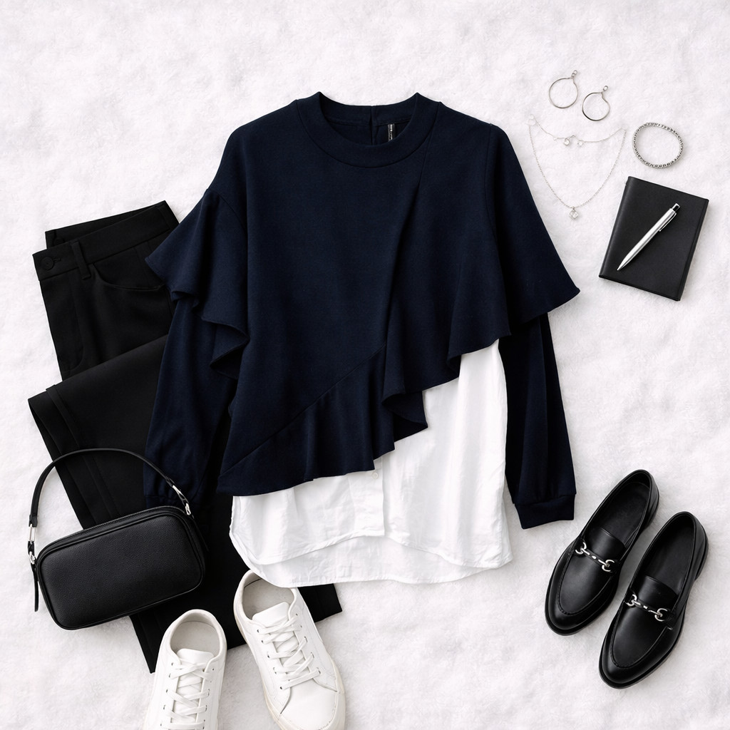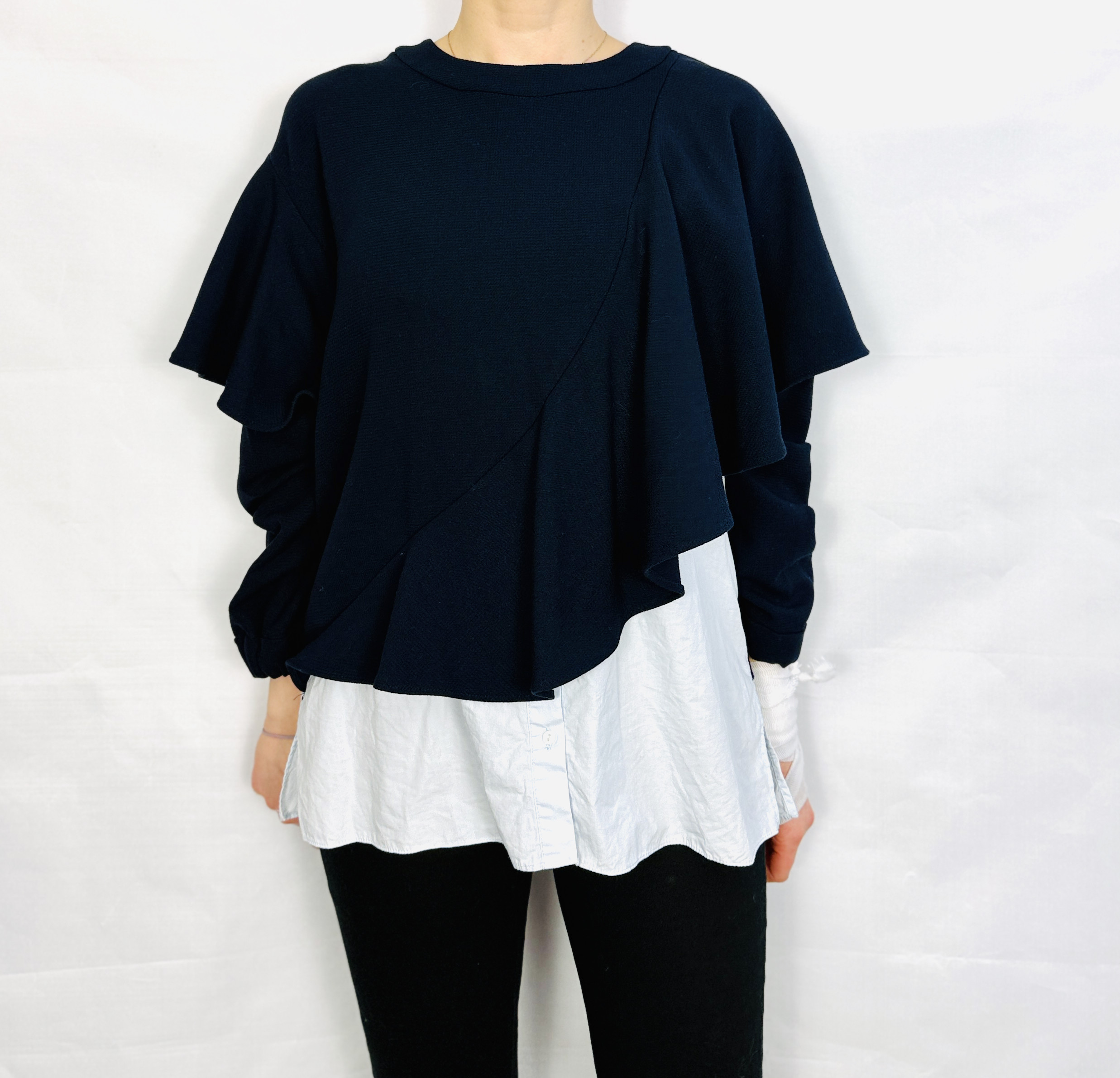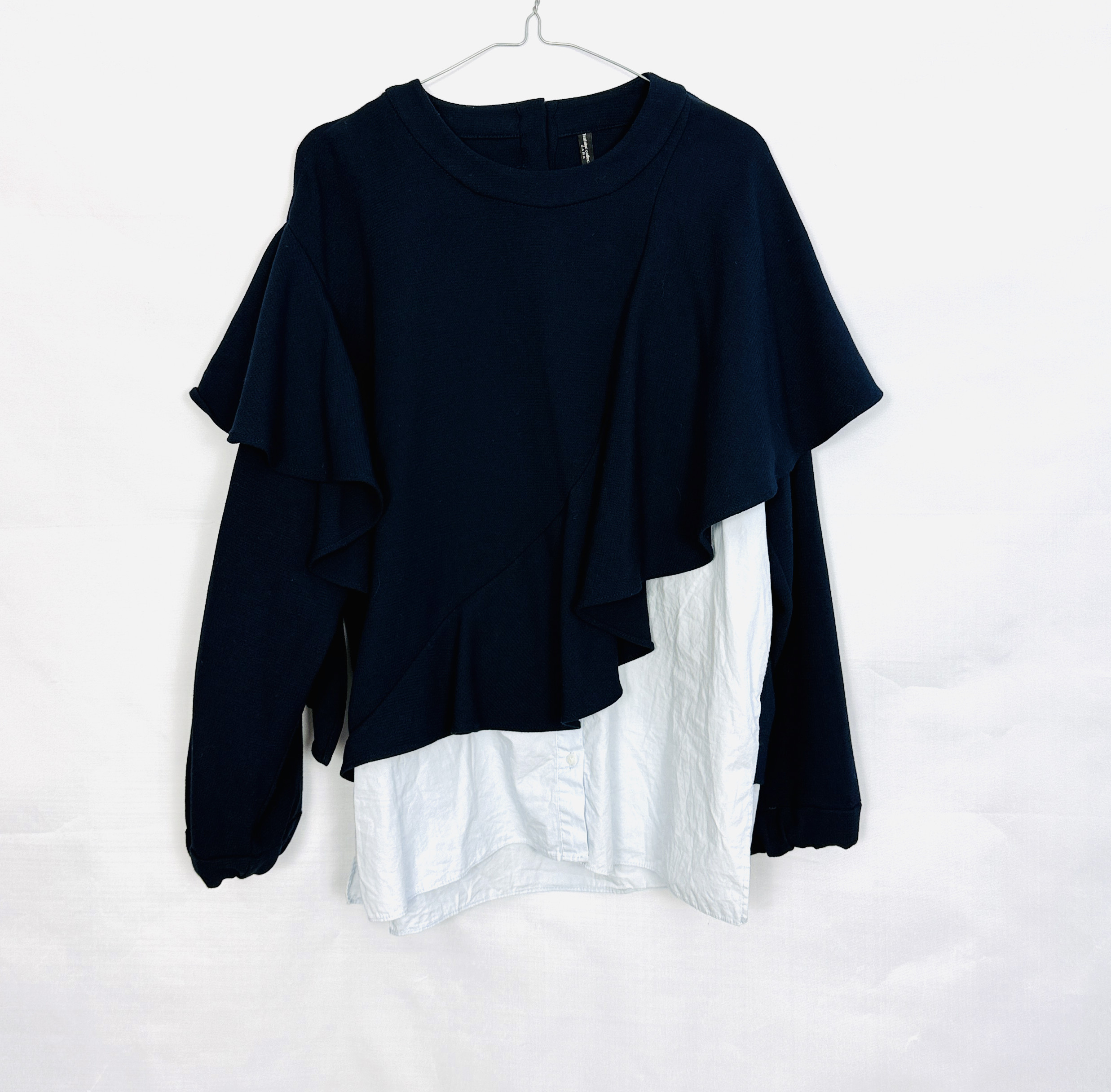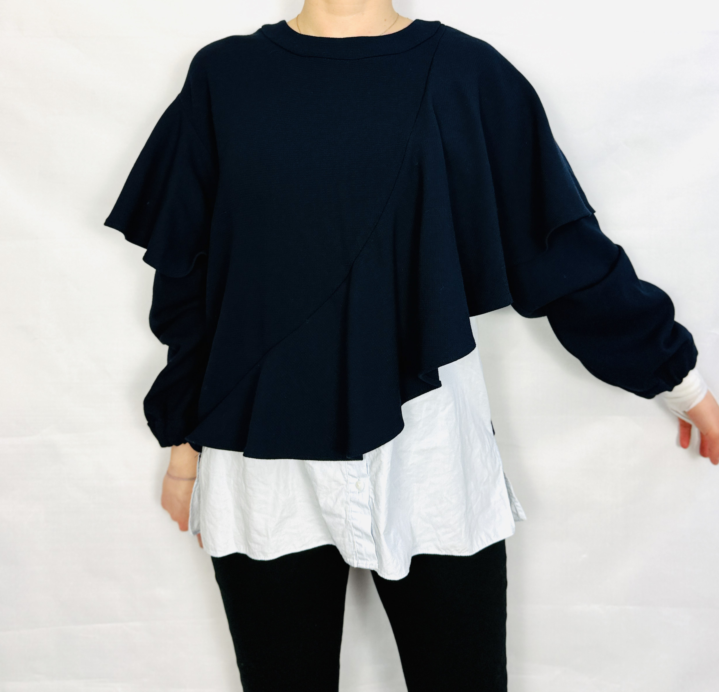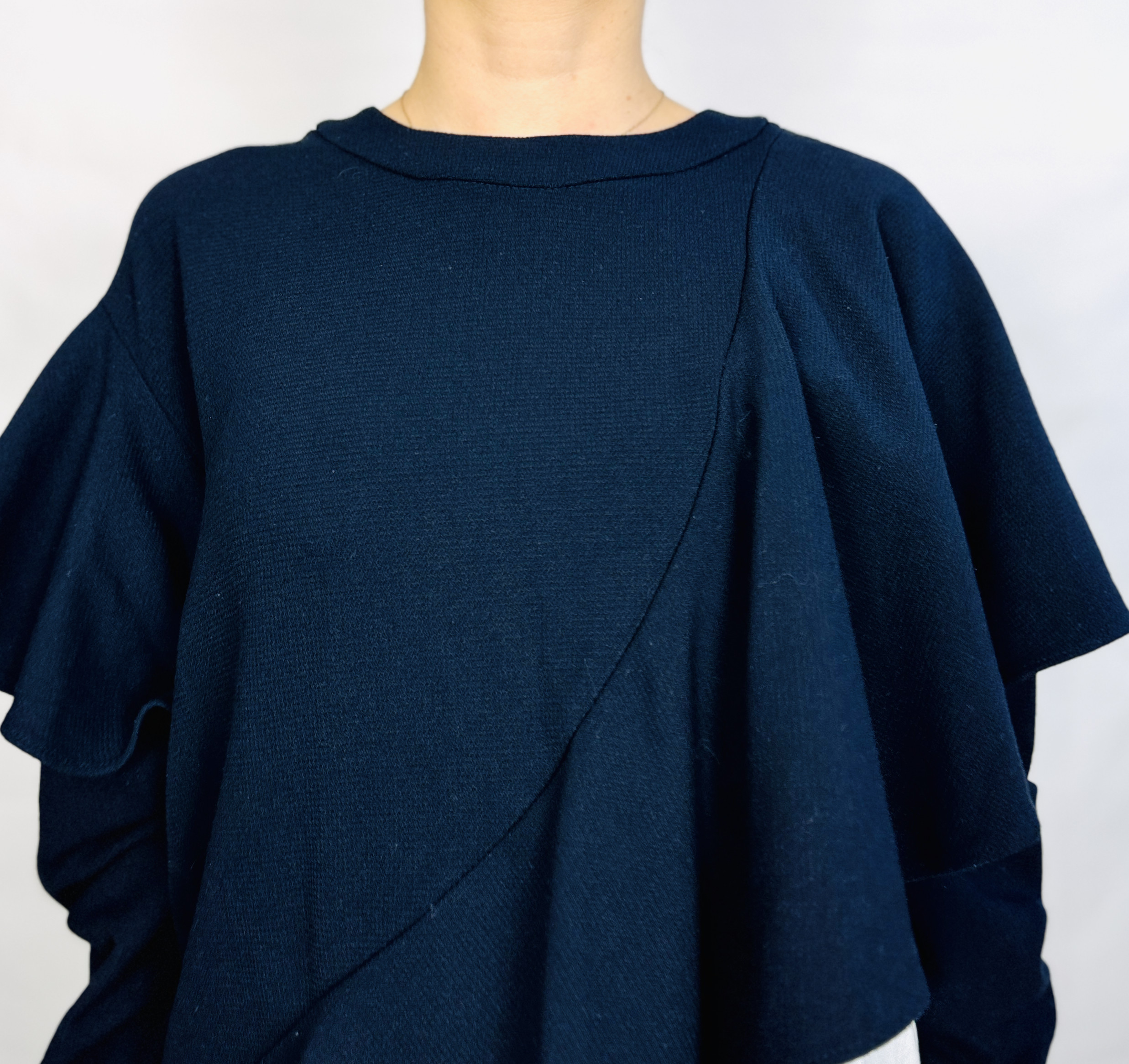 Ta granatowa bluzka to subtelne połączenie elegancji i artystycznego wdzięku — głęboki, stonowany kolor nadaje jej szykownego tonu, a asymetryczna warstwa falban wprowadza lekko teatralny, kobiecy akcent. Całość ma wyrafinowany, a jednocześnie swobodny charakter; to propozycja dla osób, które szukają ubrania o wyrazistej formie, ale bez krzykliwych zdobień, które doda stylizacji nieco dramatyzmu i miękkości.