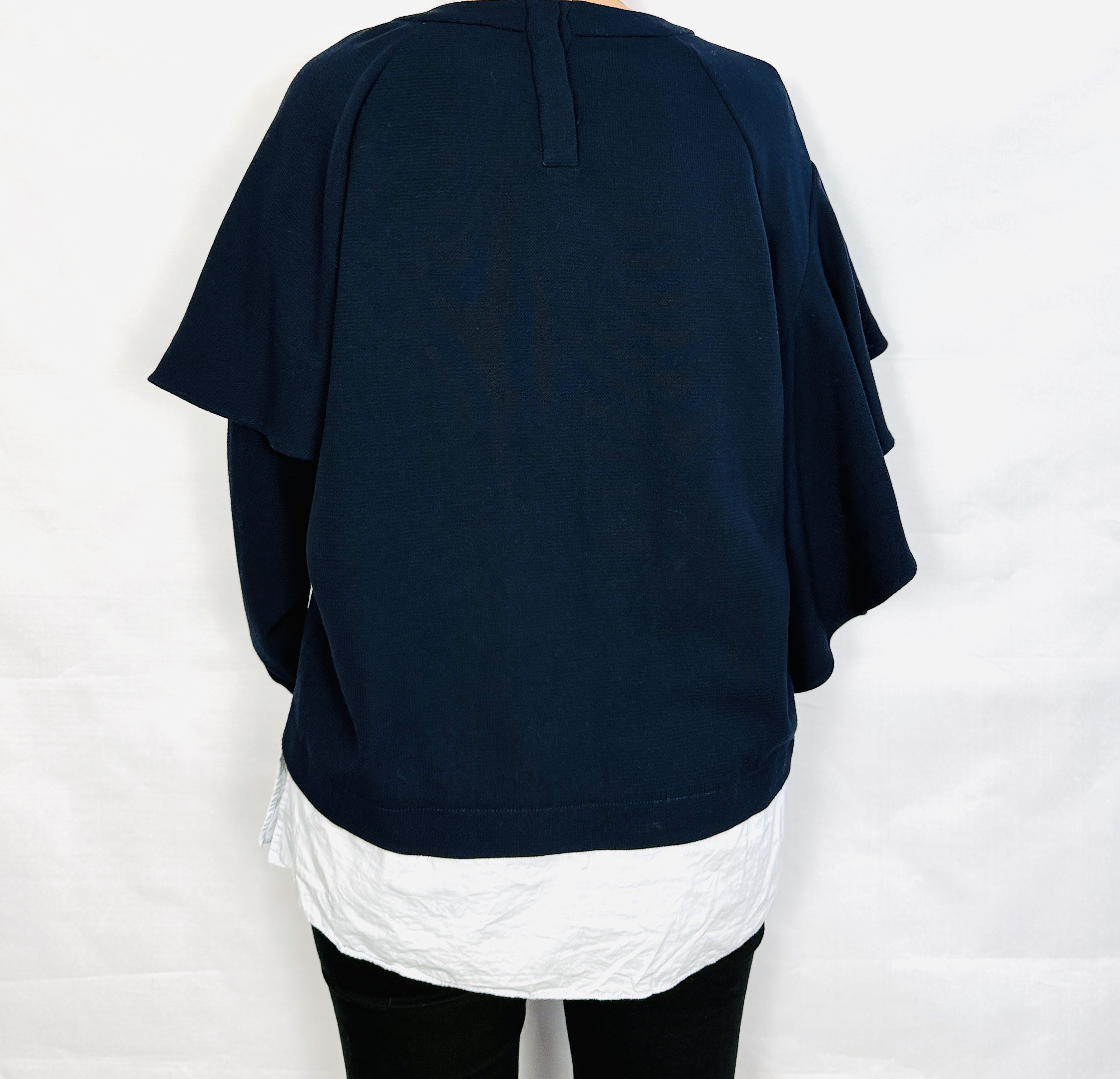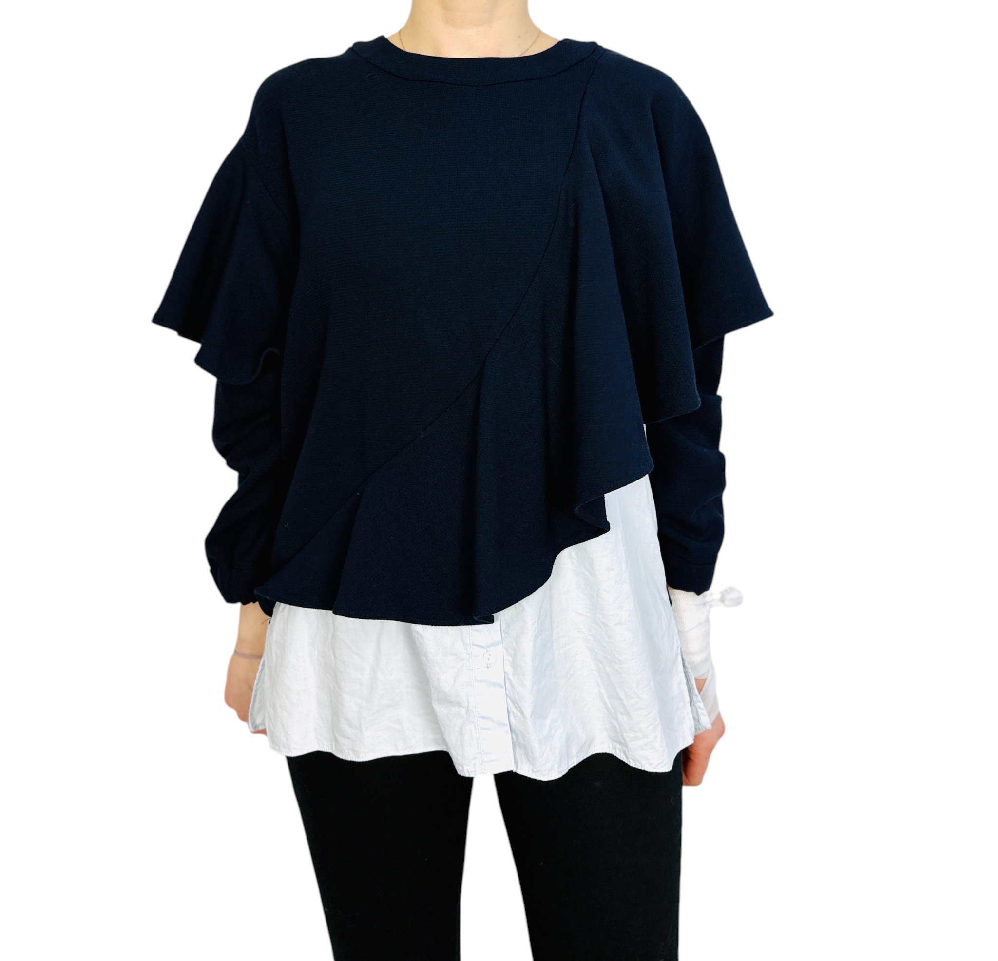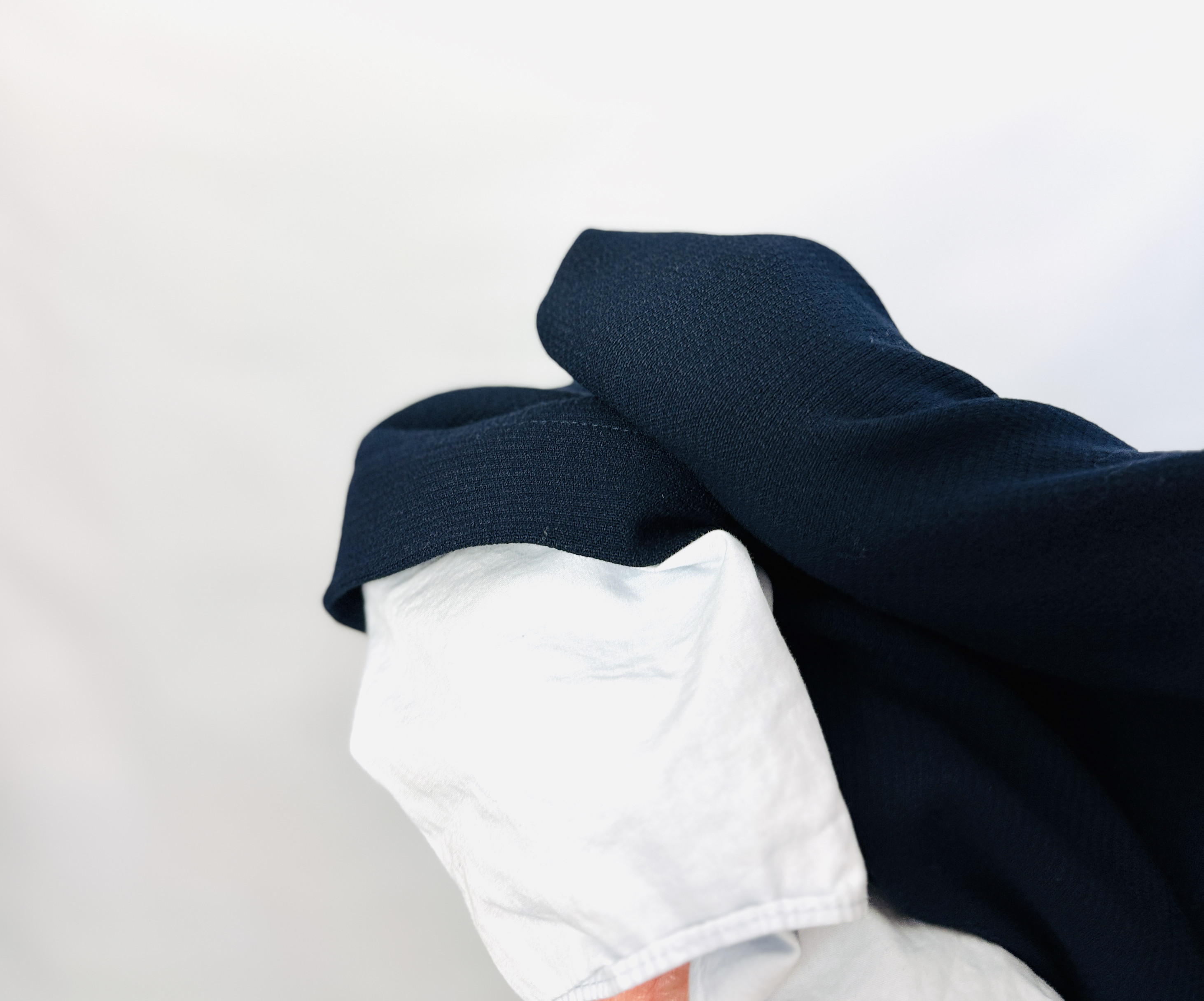 Materiał wygląda na gładki, miękko układający się i o delikatnej strukturze; wierzchnia warstwa tworzy miękkie fałdy, które poruszają się z gracją, natomiast dolna część prezentuje się jako gładka, lekko uporządkowana wstawka w kolorze białym. U dołu widoczna jest biała listwa z guzikami, dodająca projektowi wrażenia warstwowości i estetyki koszulowej. Takie zestawienie — głęboki granat z bielą — daje efekt kontrastu, który jest jednocześnie stonowany i elegancki, a różne faktury materiałów tworzą ciekawą grę światła i cienia.
