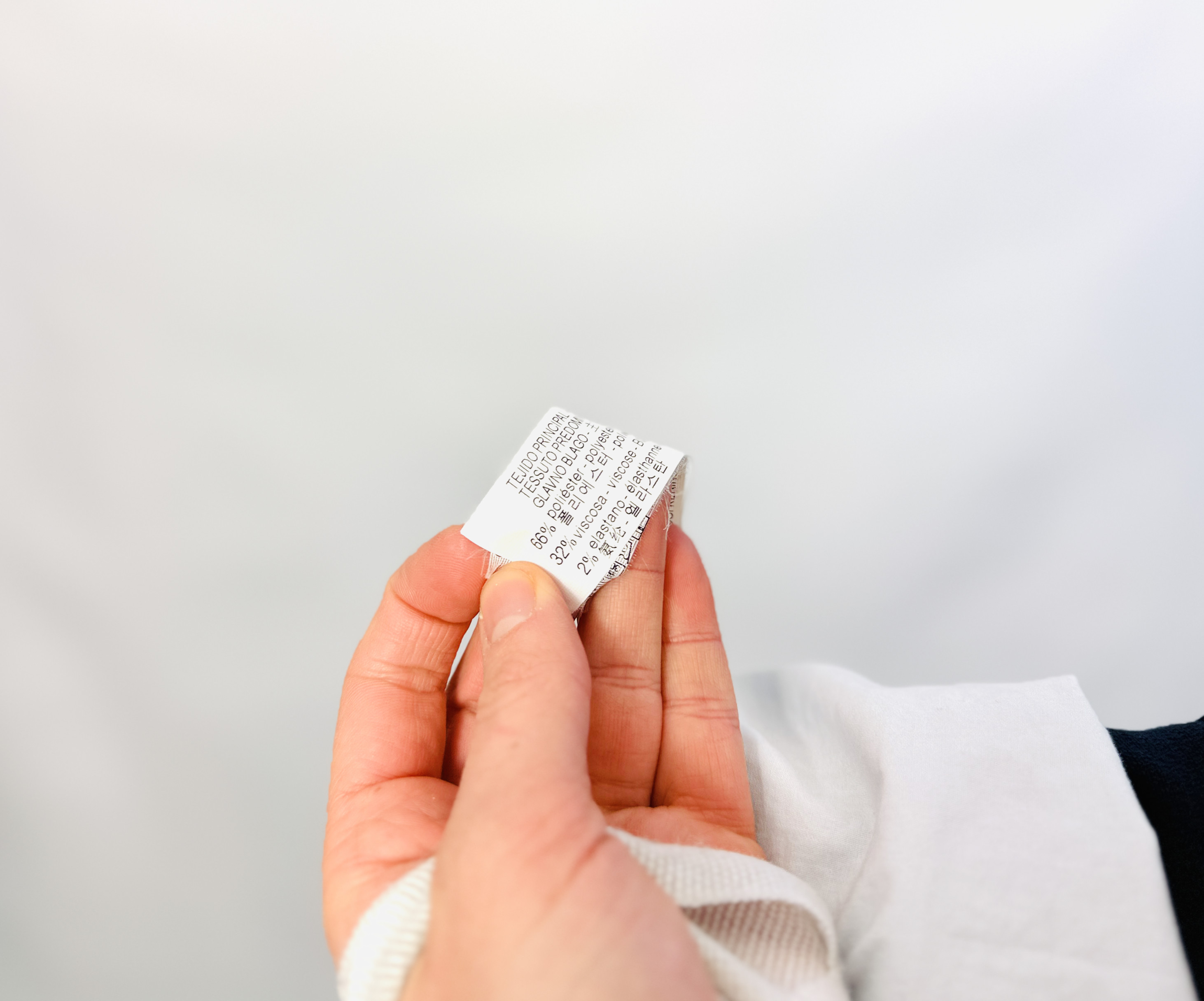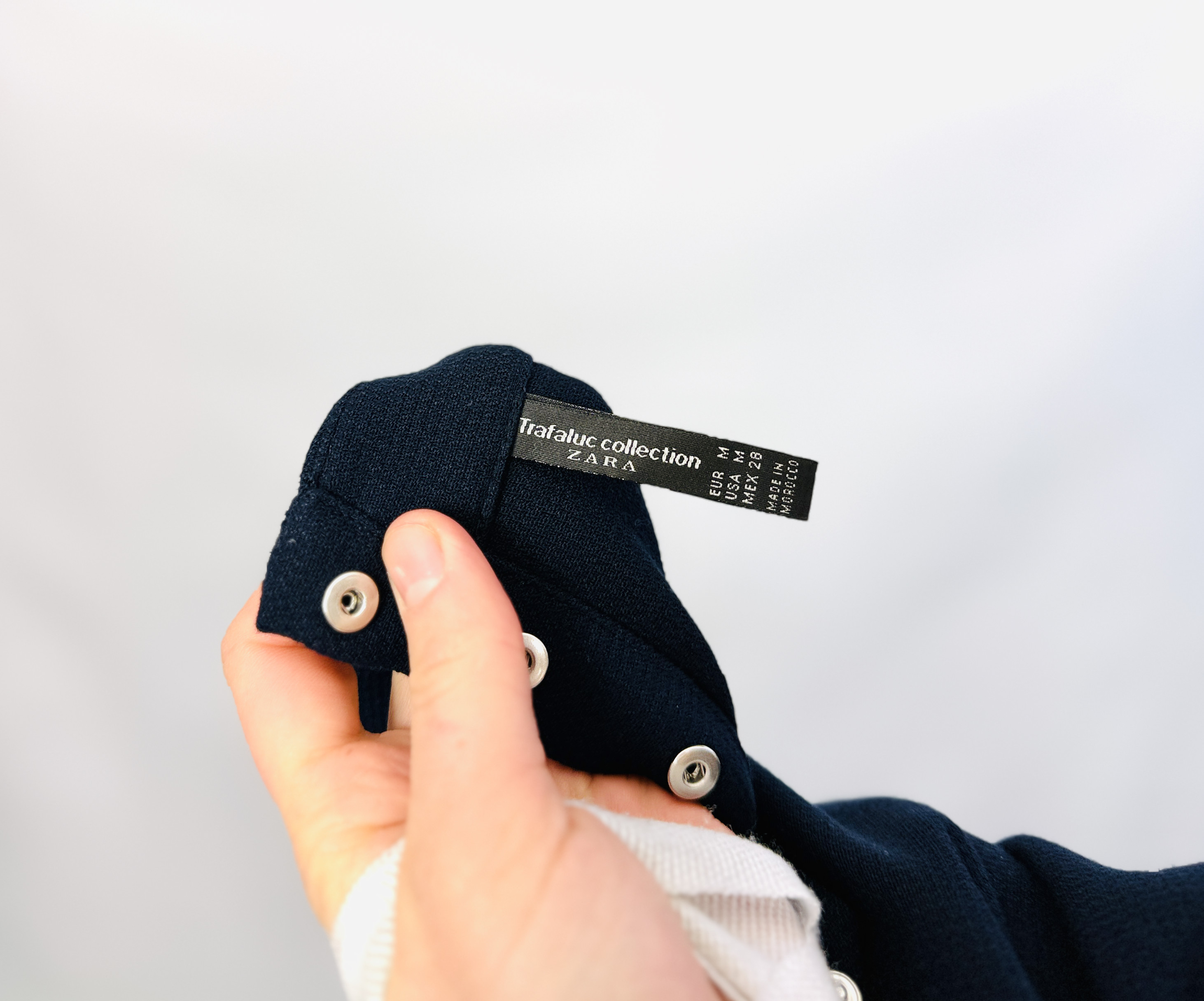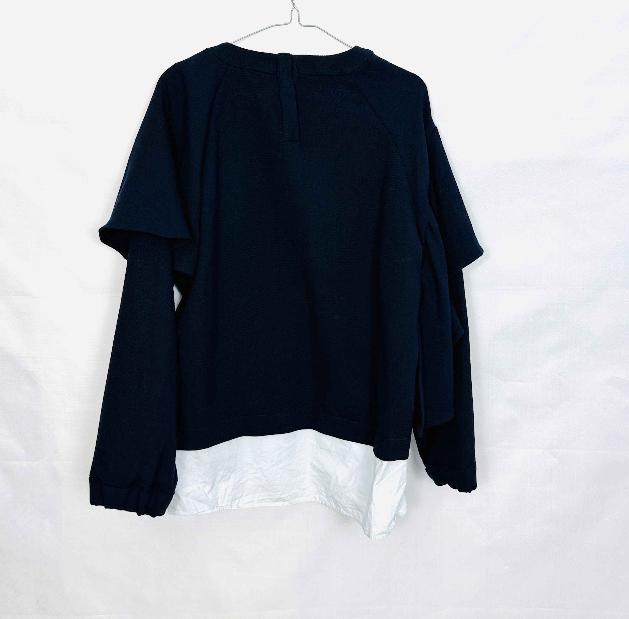 Materiał wygląda na gładki, miękko układający się i o delikatnej strukturze; wierzchnia warstwa tworzy miękkie fałdy, które poruszają się z gracją, natomiast dolna część prezentuje się jako gładka, lekko uporządkowana wstawka w kolorze białym. U dołu widoczna jest biała listwa z guzikami, dodająca projektowi wrażenia warstwowości i estetyki koszulowej. Takie zestawienie — głęboki granat z bielą — daje efekt kontrastu, który jest jednocześnie stonowany i elegancki, a różne faktury materiałów tworzą ciekawą grę światła i cienia.