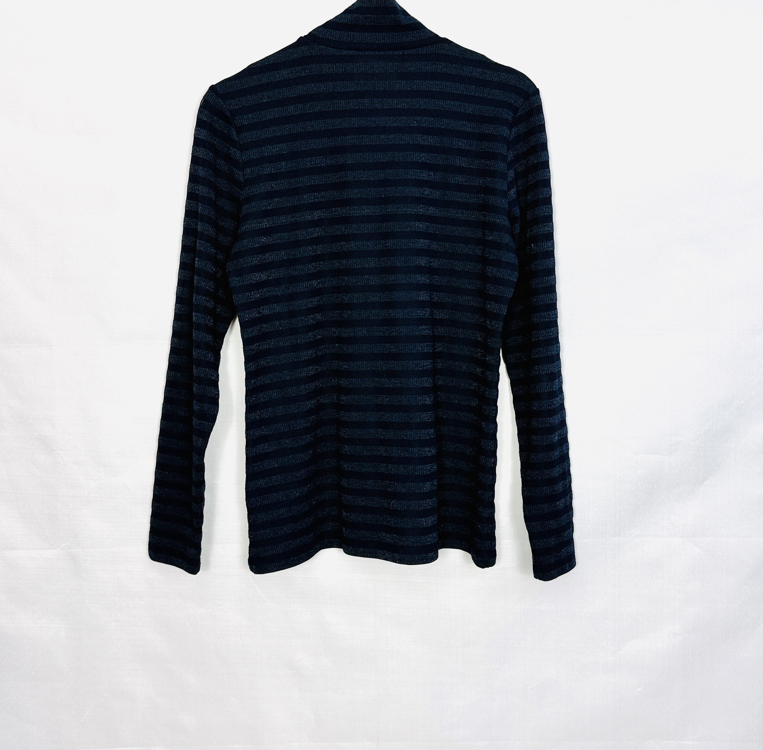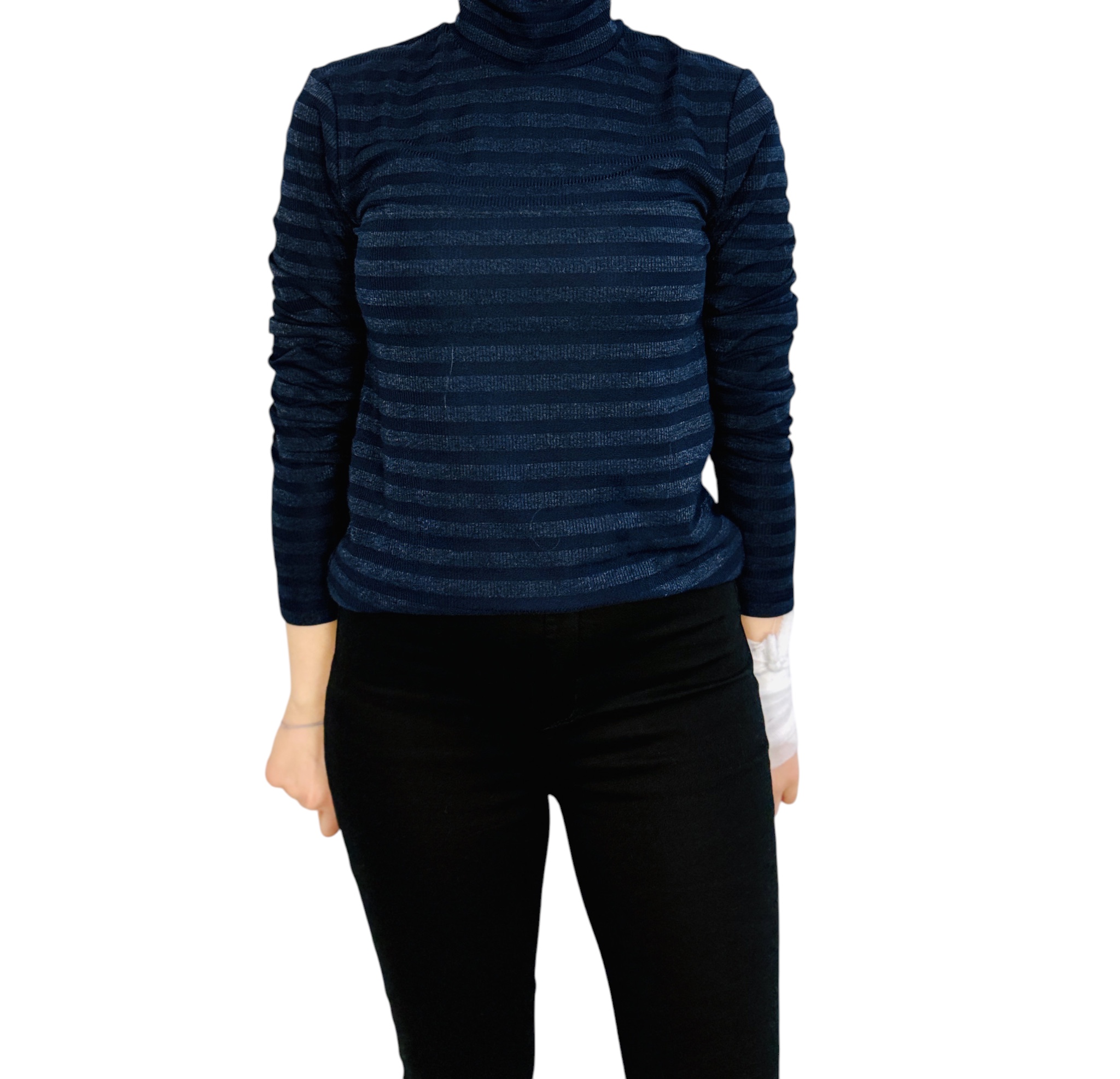 Krój bluzki jest wyraźnie dopasowany, podkreślający naturalne linie sylwetki i sięgający do wysokości bioder, co daje efekt zgrabnej, kobiecej proporcji. Dekolt tworzy wysoka stójka, która delikatnie otula szyję i dodaje całości uporządkowanego, nieco klasycznego wykończenia. Długie rękawy są dopasowane i nieznacznie marszczą się przy długości, co wprowadza rytm oraz subtelne podkreślenie ramion i przedramion. Poziome pasy, utrzymane w dwóch zbliżonych odcieniach granatu, biegną równomiernie przez korpus i rękawy, tworząc spokojny, graficzny efekt.