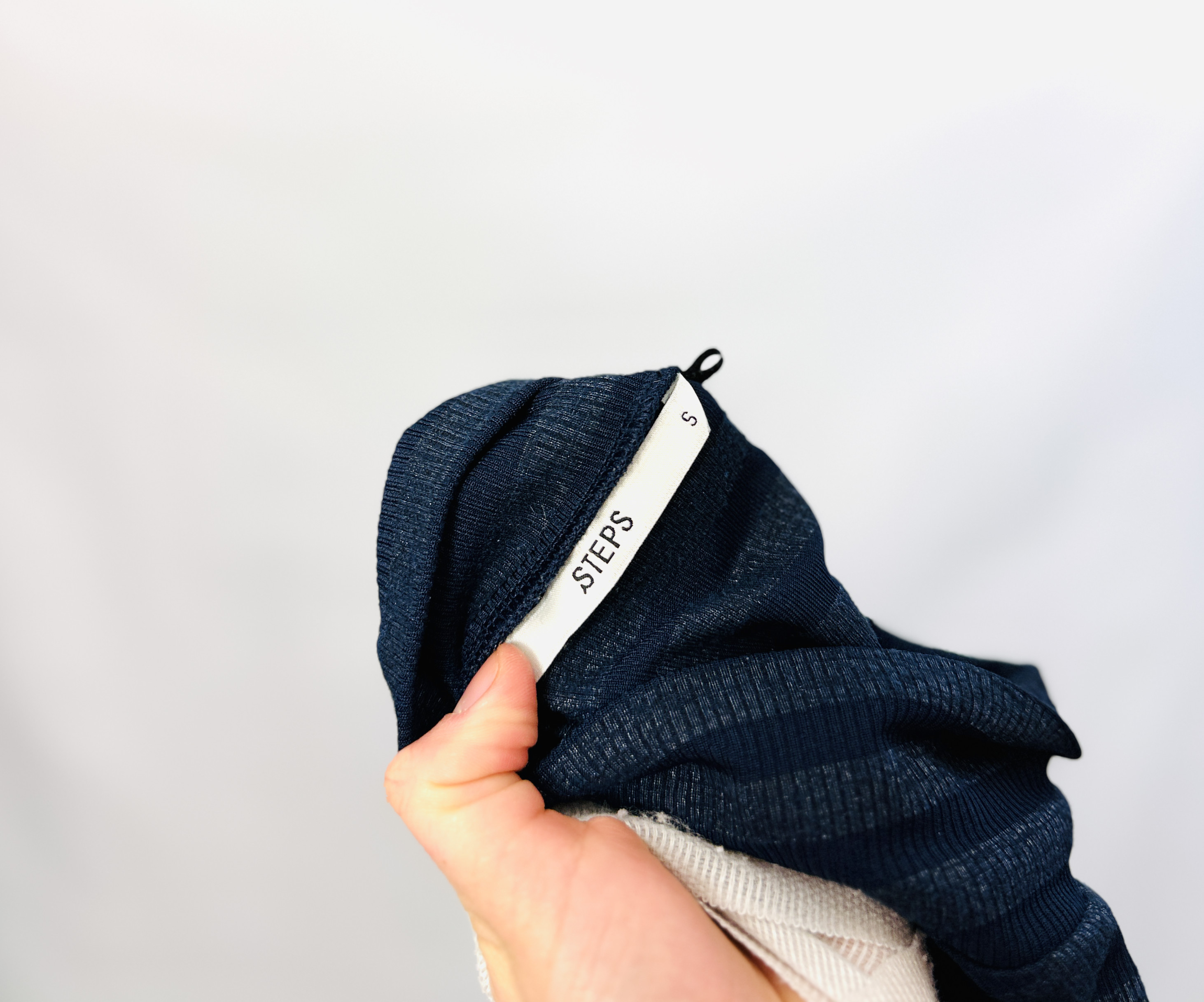 Materiał prezentuje się jako miękko układający się i lekko elastyczny, o subtelnej teksturze dzianiny, dzięki czemu bluzka ładnie dopasowuje się do ciała, nie opinając przesadnie. Taka struktura zapewnia komfort noszenia i swobodę ruchu, a delikatna elastyczność ułatwia zachowanie formy przez cały dzień. Poziome pasy dodają powierzchni głębi i niewielkiego rytmu, co w połączeniu z dopasowanym krojem tworzy harmonijny efekt — bluzka podkreśla sylwetkę, ale nie eksponuje jej w sposób nachalny.