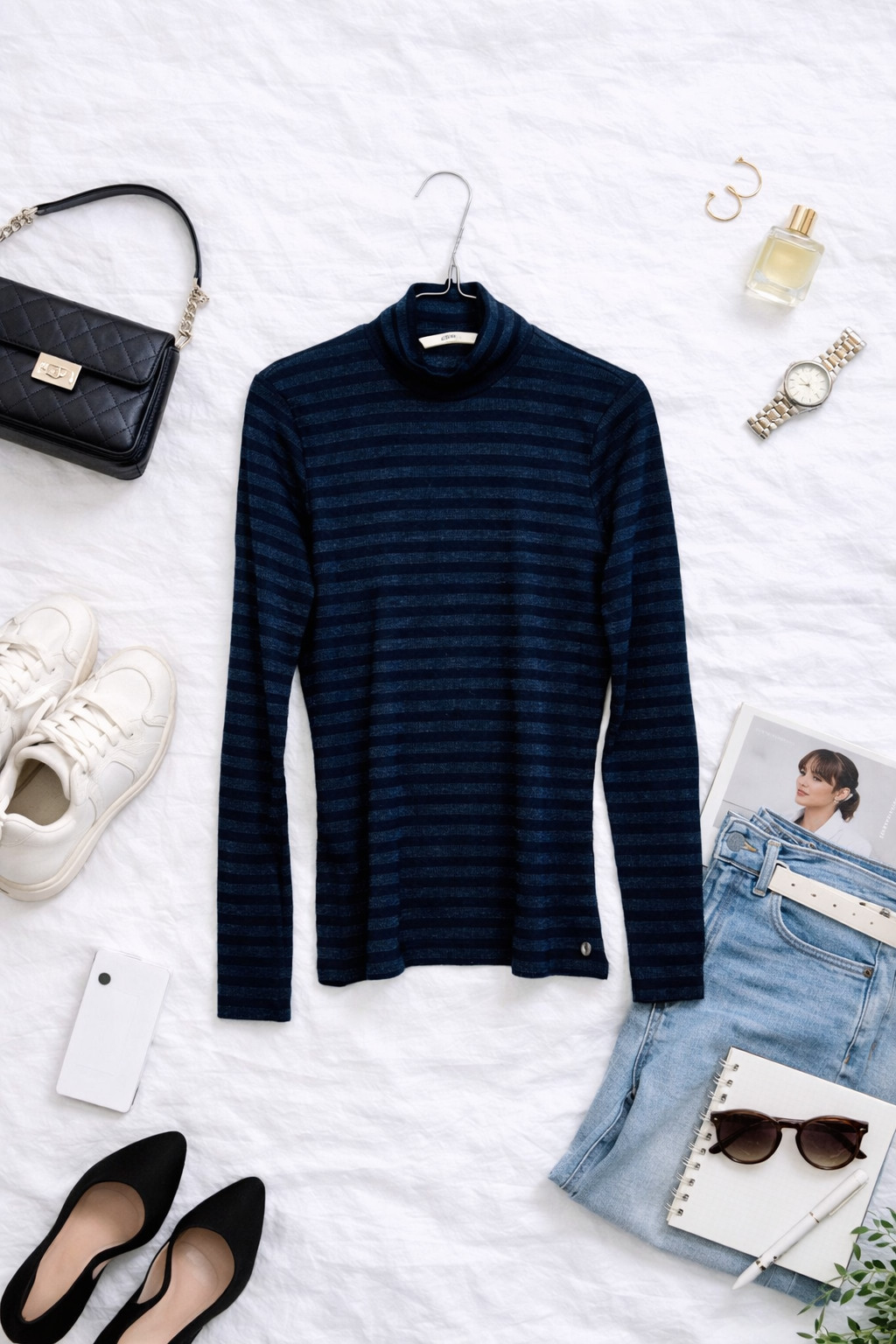 W zestawieniach proponuję wykorzystać jej uniwersalność: na co dzień połącz z ulubionymi jeansami i wygodnymi sneakersami dla miejskiego, casualowego looku; do pracy noś z cygaretkami lub prostą spódnicą i klasycznymi półbutami, tworząc stonowany, elegancki zestaw; na wieczorne wyjście zestaw z dopasowanymi spodniami i subtelnymi szpilkami lub botkami, podkreślając prostotę dodatkami w metalicznych tonacjach. Granat w parze z paskami znakomicie komponuje się z bielą, kremem, beżem oraz z akcentami camel czy butelkowej zieleni, co daje wiele możliwości tworzenia harmonijnych i kobiecych stylizacji na różne okazje.