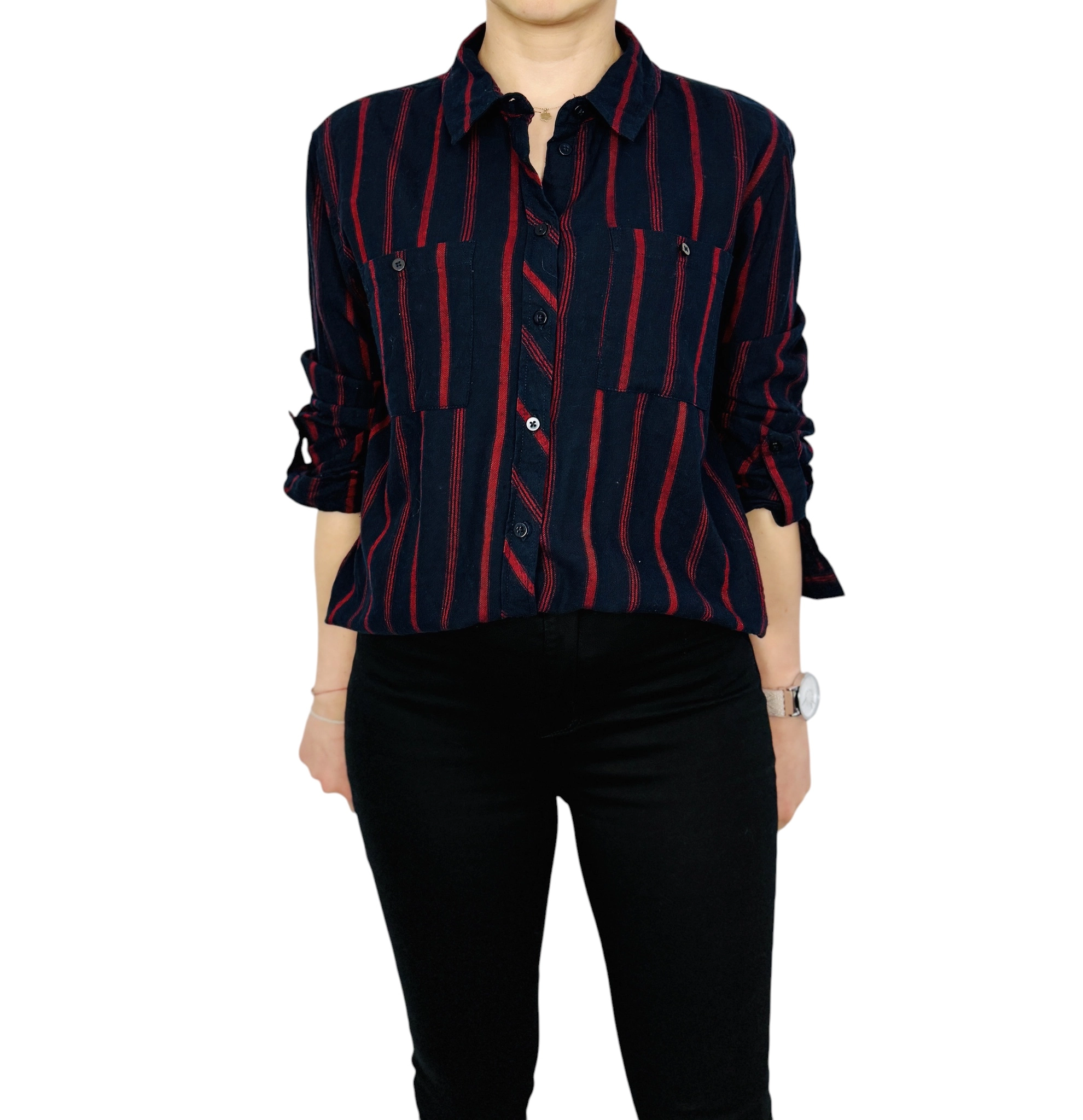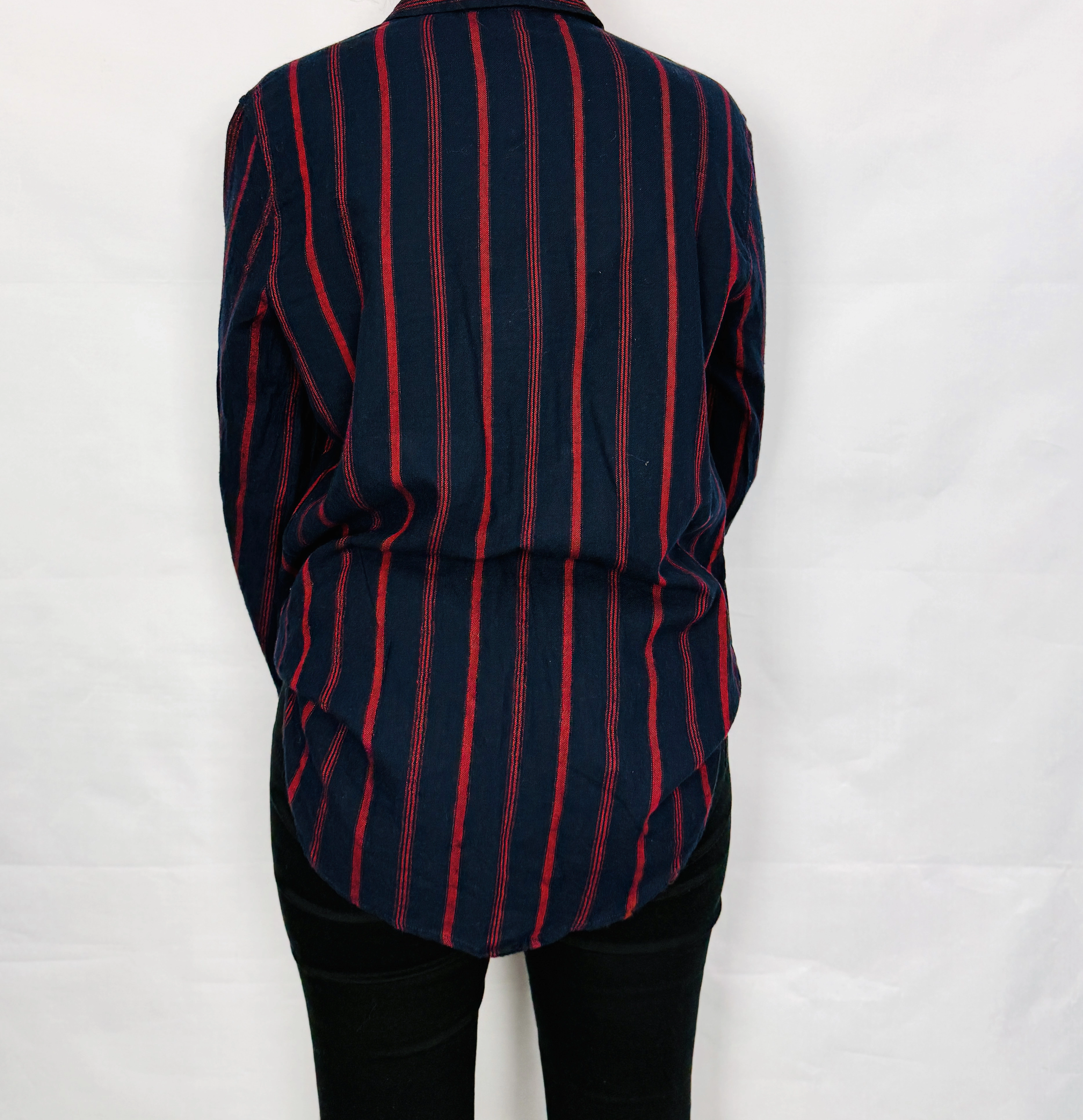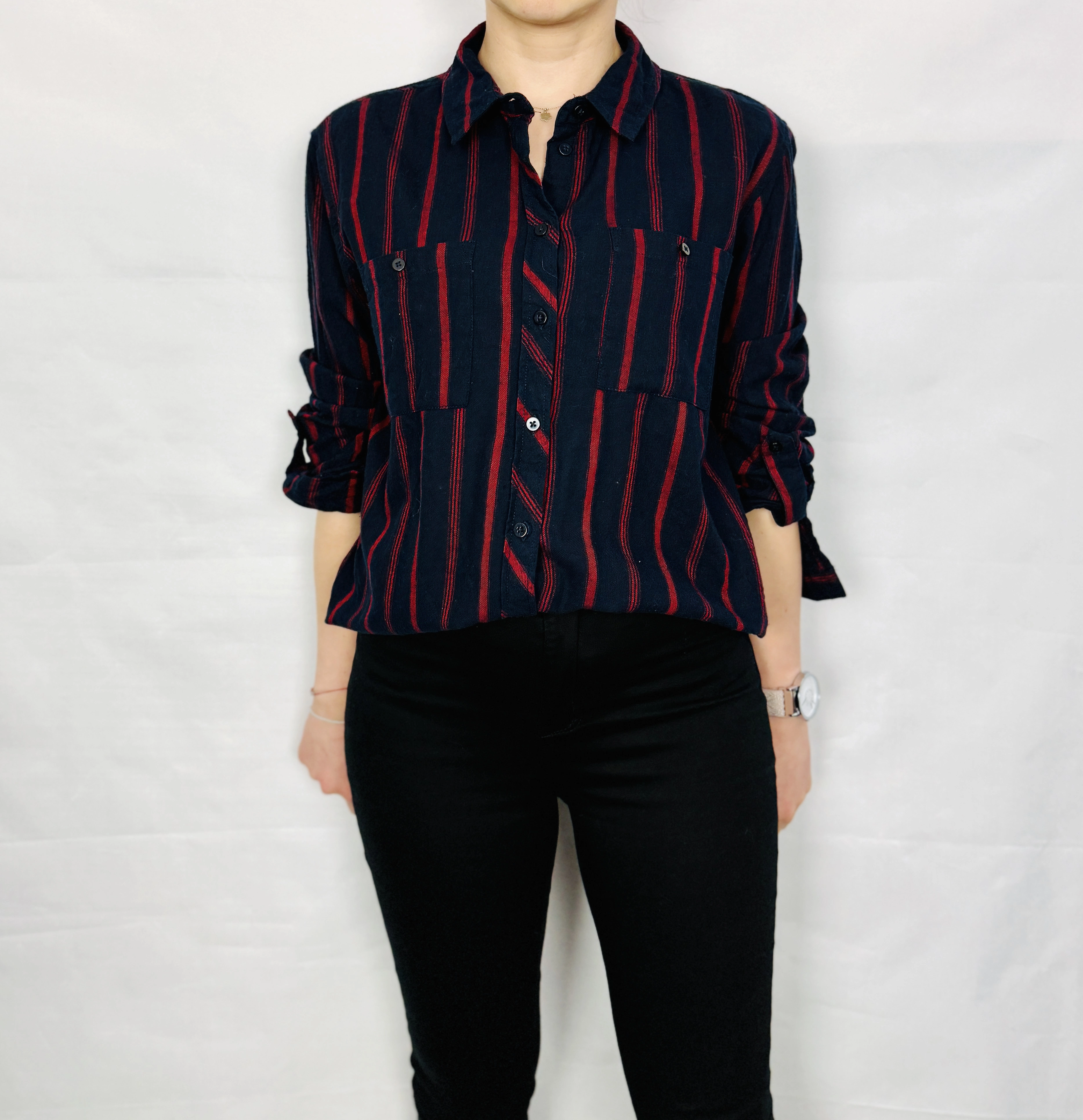 Ta granatowa koszula to doskonała propozycja dla kobiet, które cenią sobie wyrazisty styl połączony z klasyczną elegancją. Głęboki odcień granatu stanowi idealne tło dla pionowych, czerwonych pasów, co nadaje ubraniu zdecydowanego i nowoczesnego charakteru. To wzór, który przyciąga uwagę, a jednocześnie pozostaje bardzo stylowy i profesjonalny, sprawiając, że koszula ta staje się kluczowym elementem garderoby na wiele różnych okazji. Łączy w sobie surowość klasycznej męskiej szafy z kobiecą lekkością fasonu, co owocuje niezwykle ciekawym i modnym efektem wizualnym, idealnym dla pewnych siebie miłośniczek dobrego stylu.