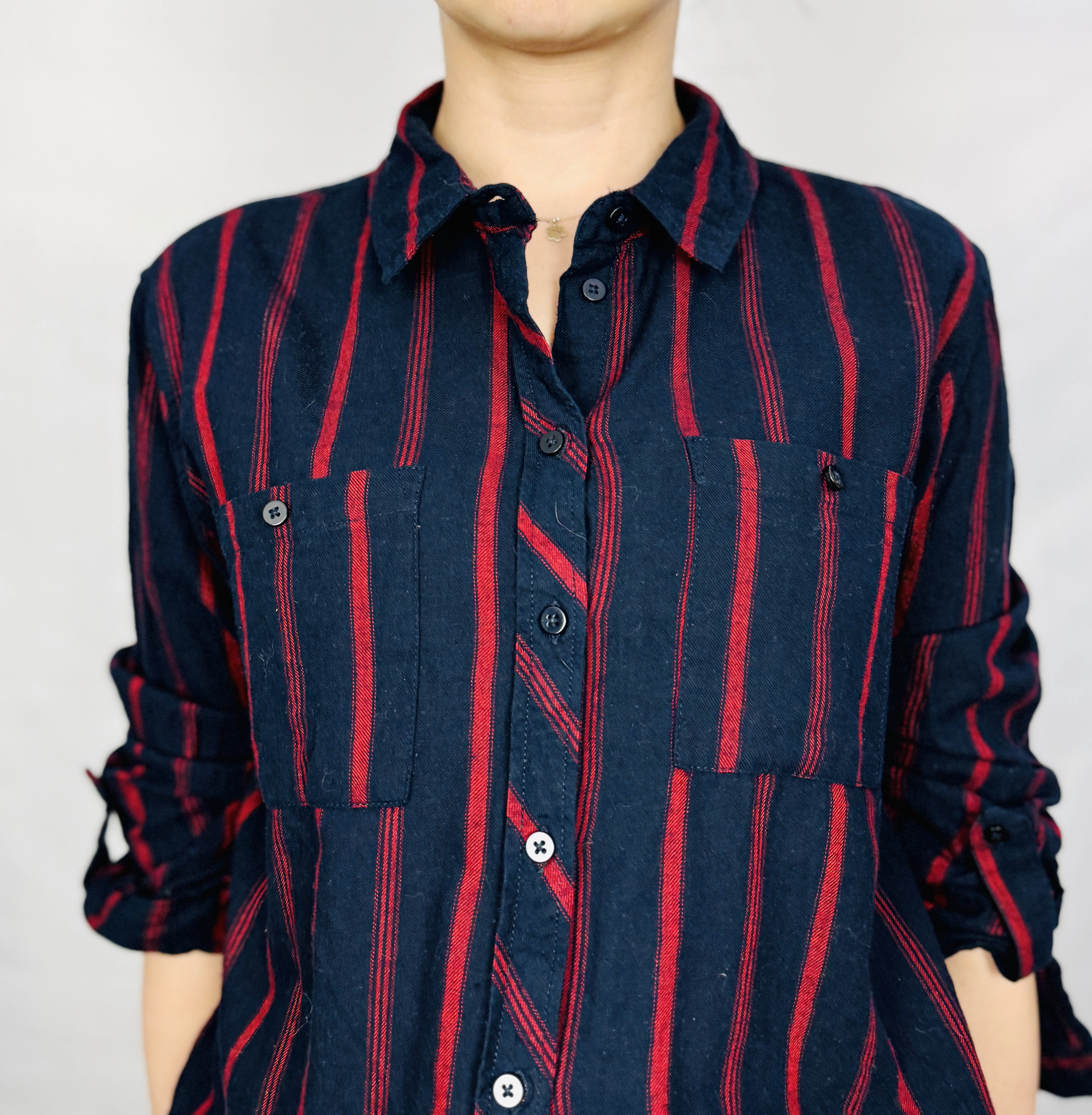 Materiał, z którego wykonano ten model, jest nieco grubszy i otulający, a jednocześnie miękko układający się na sylwetce. Gładsza struktura tkaniny jest przyjemna w dotyku i zapewnia trwałość fasonu, nie tracąc przy tym na lekkości. Czerwone pasy na granatowym tle są wyraźne i głębokie, co świadczy o wysokiej jakości nadruku i dbałości o detale. Tkanina pięknie współpracuje z ruchem ciała, nie gniecie się nadmiernie i zachowuje swój elegancki charakter przez cały dzień, stanowiąc synonim komfortu i funkcjonalności w codziennym wydaniu.