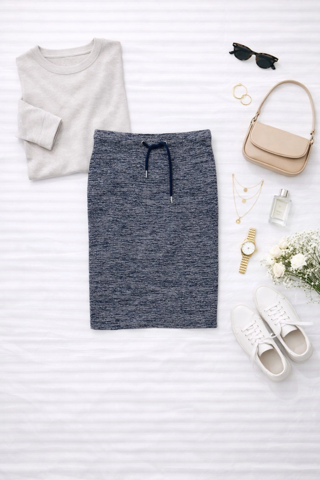 Ta spódnica to idealne połączenie sportowego luzu i kobiecej elegancji, które sprawdzi się w szafie każdej miłośniczki stylu casual chic. Melanżowa struktura materiału w odcieniach głębokiego granatu i bieli tworzy nastrojowy wizualny efekt, który nadaje całości nowoczesnego, nieco miejskiego charakteru. To ubiór, który emanuje radosnym komfortem, pozostając jednocześnie bazą do tworzenia nienagannych i stylowych zestawów na różne pory dnia, niosąc ze sobą nastrojową lekkość i radosną swobodę.