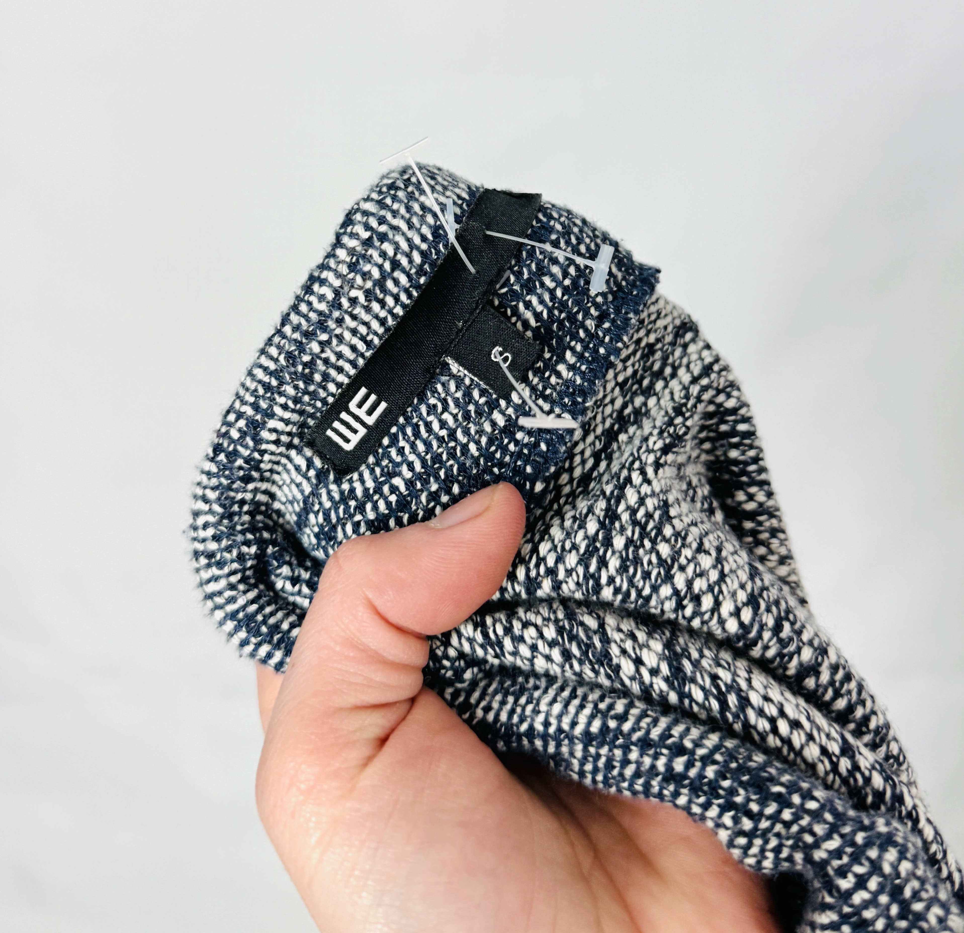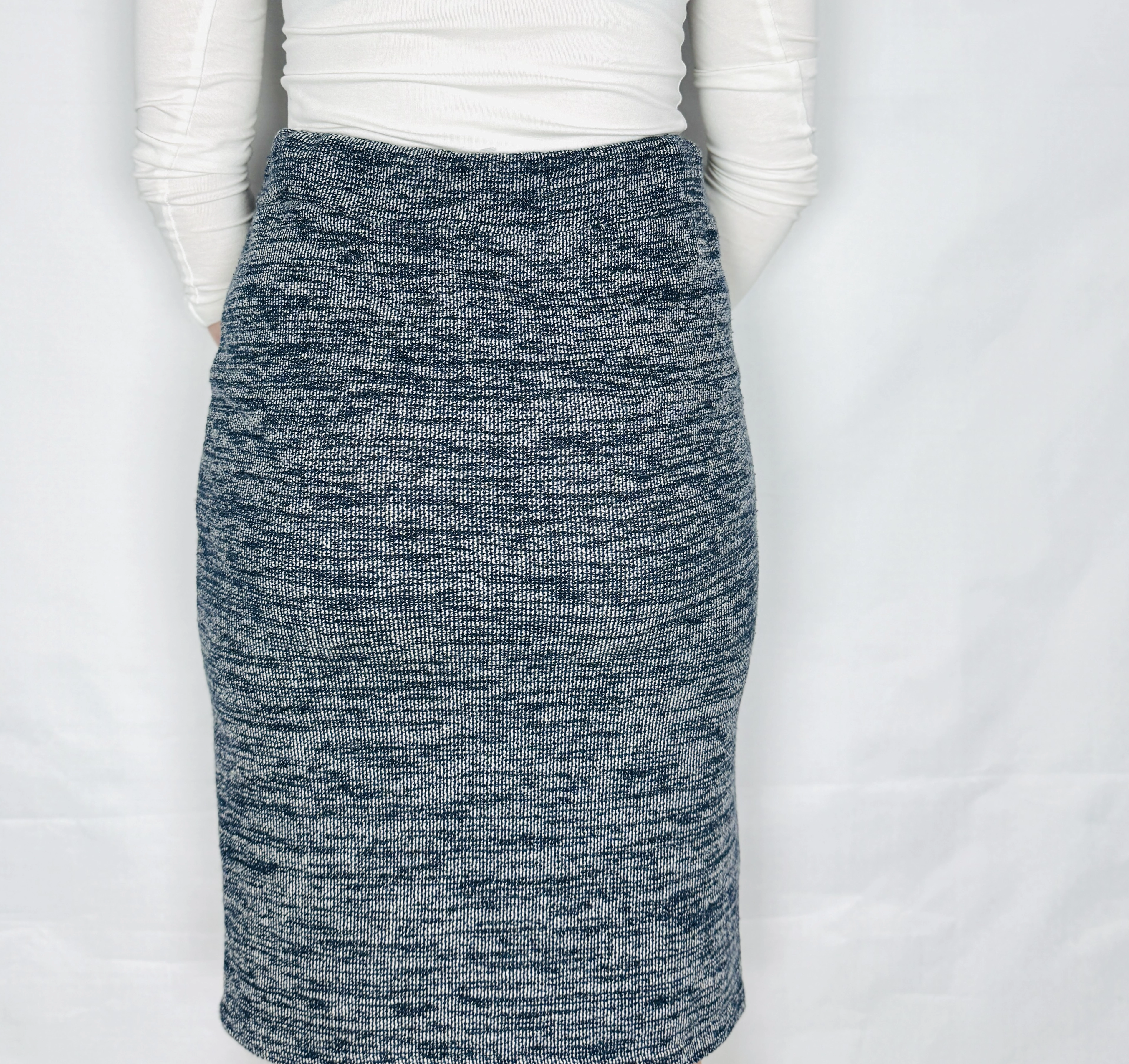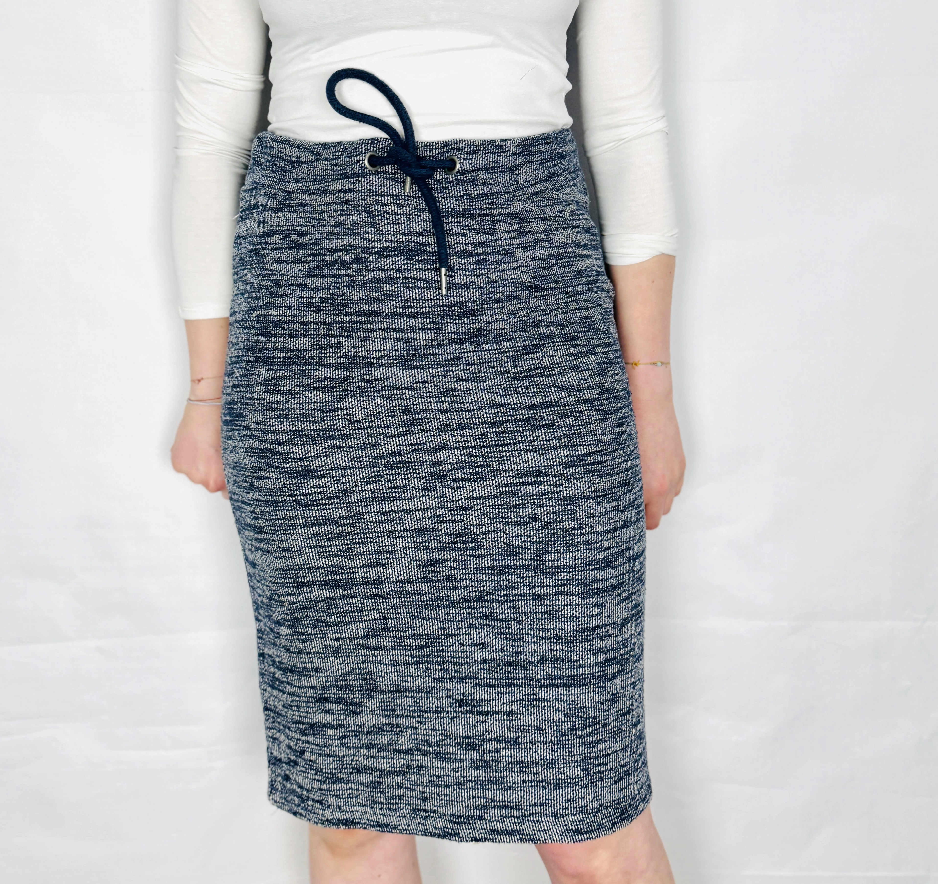Fason spódnicy charakteryzuje się prostą, lekko dopasowaną linią, która w radosny sposób podkreśla atuty sylwetki. Wysoki stan został wykończony nastrojowym ściągaczem z ozdobnym, radosnym sznurkiem w kolorze ciemnego granatu, co pozwala na nienaganne dopasowanie ubioru do talii. Krój subtelnie opływa biodra i uda, kończąc się nastrojową długością nad kolano, co nadaje figurze radosnej zgrabności. Brak zbędnych przeszyć sprawia, że spódnica prezentuje się bardzo radosnie i minimalistycznie, skupiając całą nastrojową uwagę na ciekawej strukturze dzianiny.