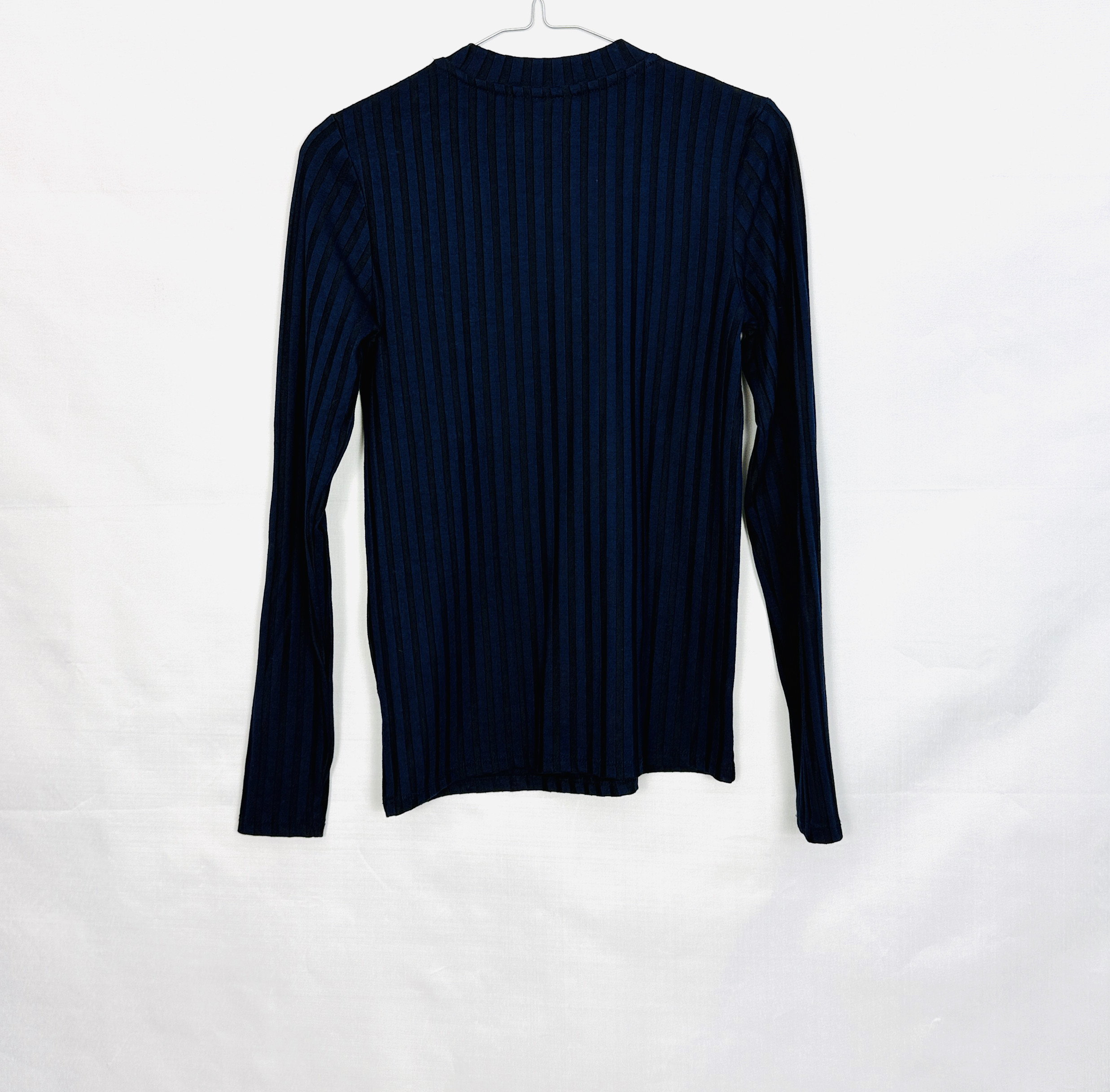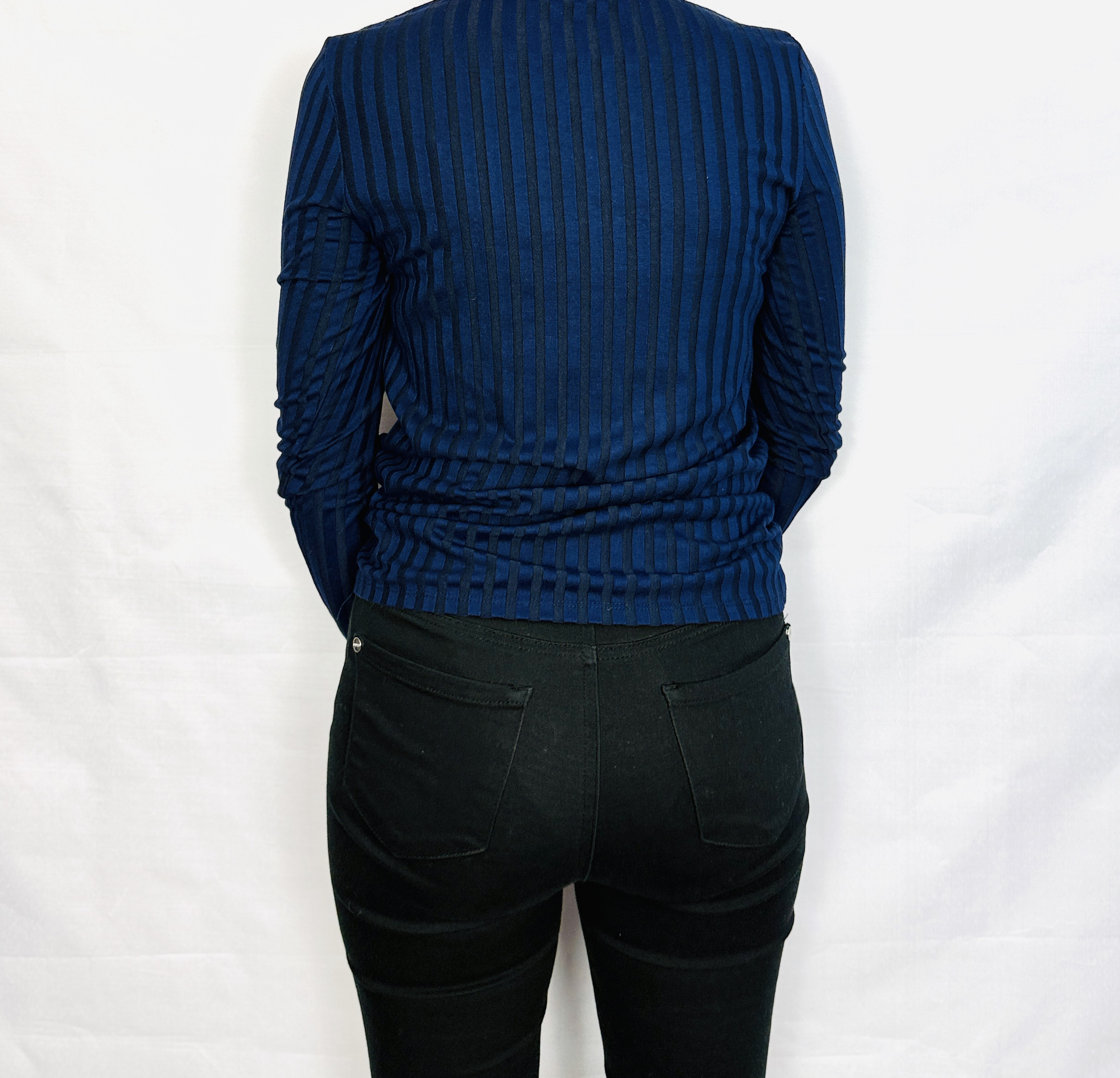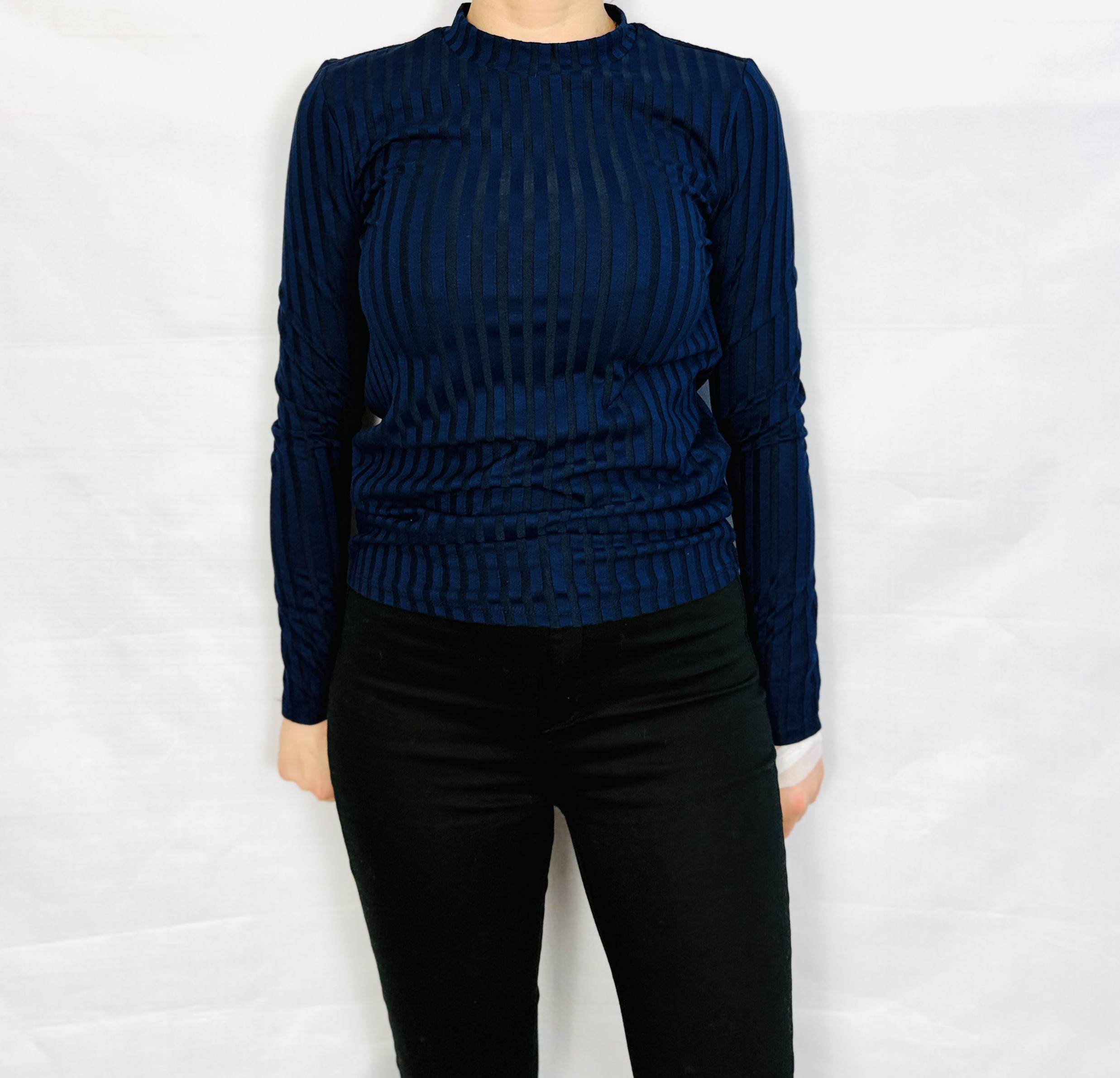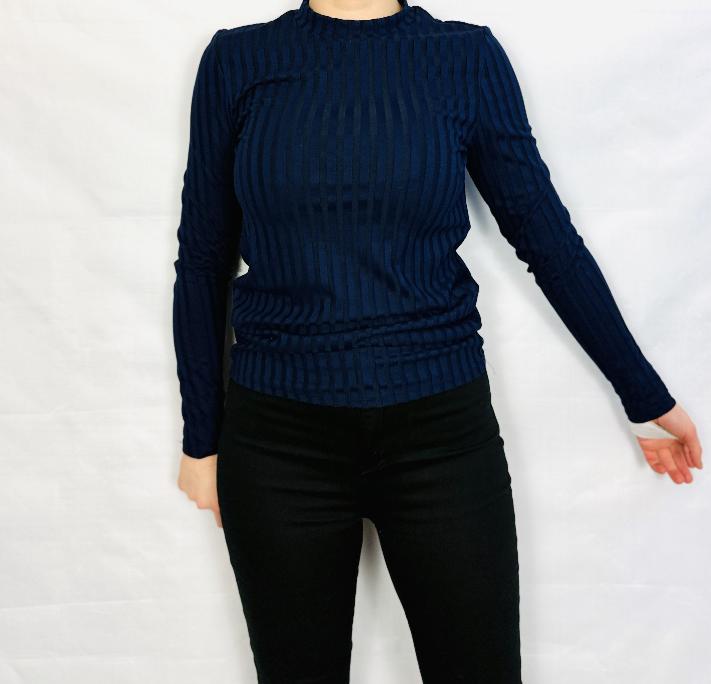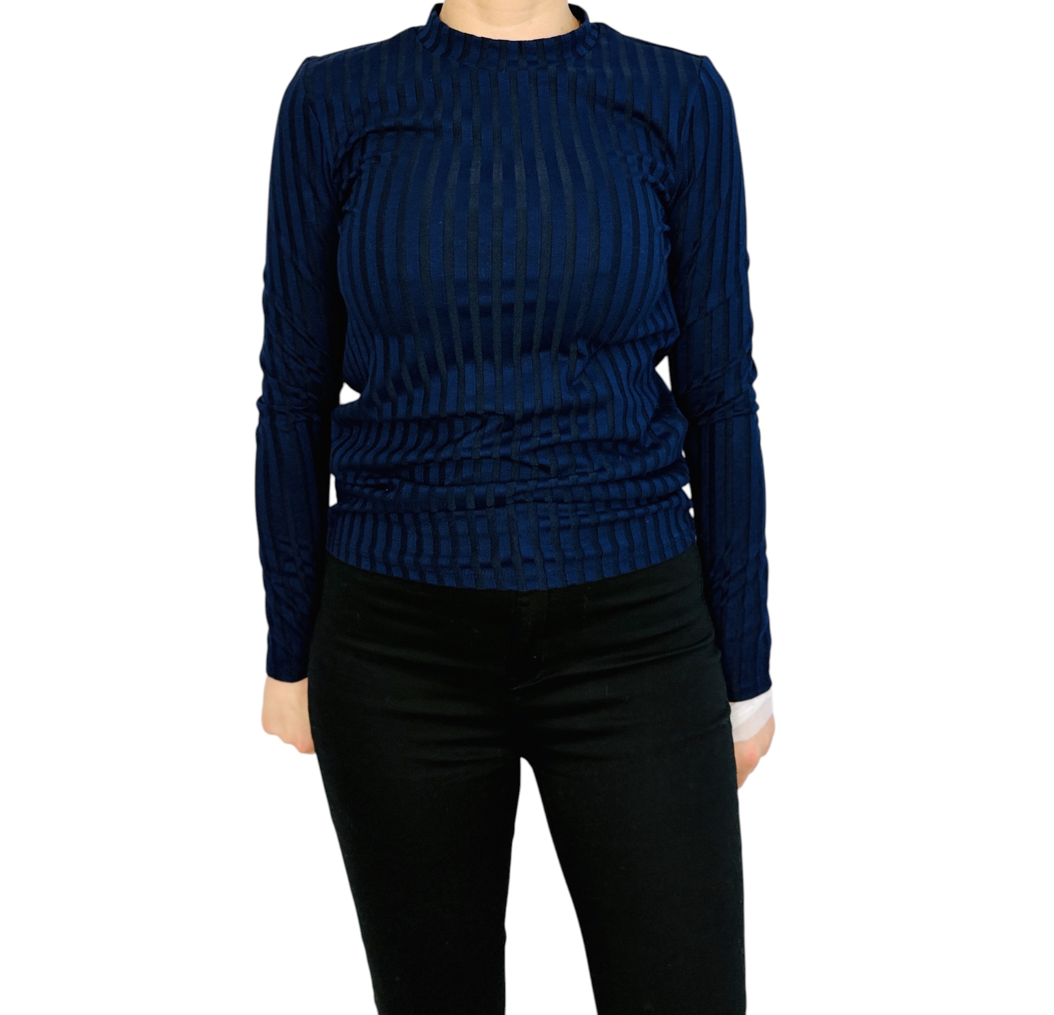 Ta bluzka to elegancka i wyrafinowana baza garderoby — głęboki granat nadaje jej spokojnego, klasycznego wyrazu, a subtelne prążkowanie wprowadza rytm i delikatną fakturę, która podkreśla kobiecość w nowoczesny sposób. Całość sprawia wrażenie dyskretnej elegancji z nutą minimalistycznego szyku; to model, który świetnie odnajdzie się zarówno w stonowanych, biurowych stylizacjach, jak i w bardziej wyrafinowanych wieczornych zestawieniach. Projekt zachowuje prostotę formy, jednocześnie oferując widoczny, ale stonowany charakter.