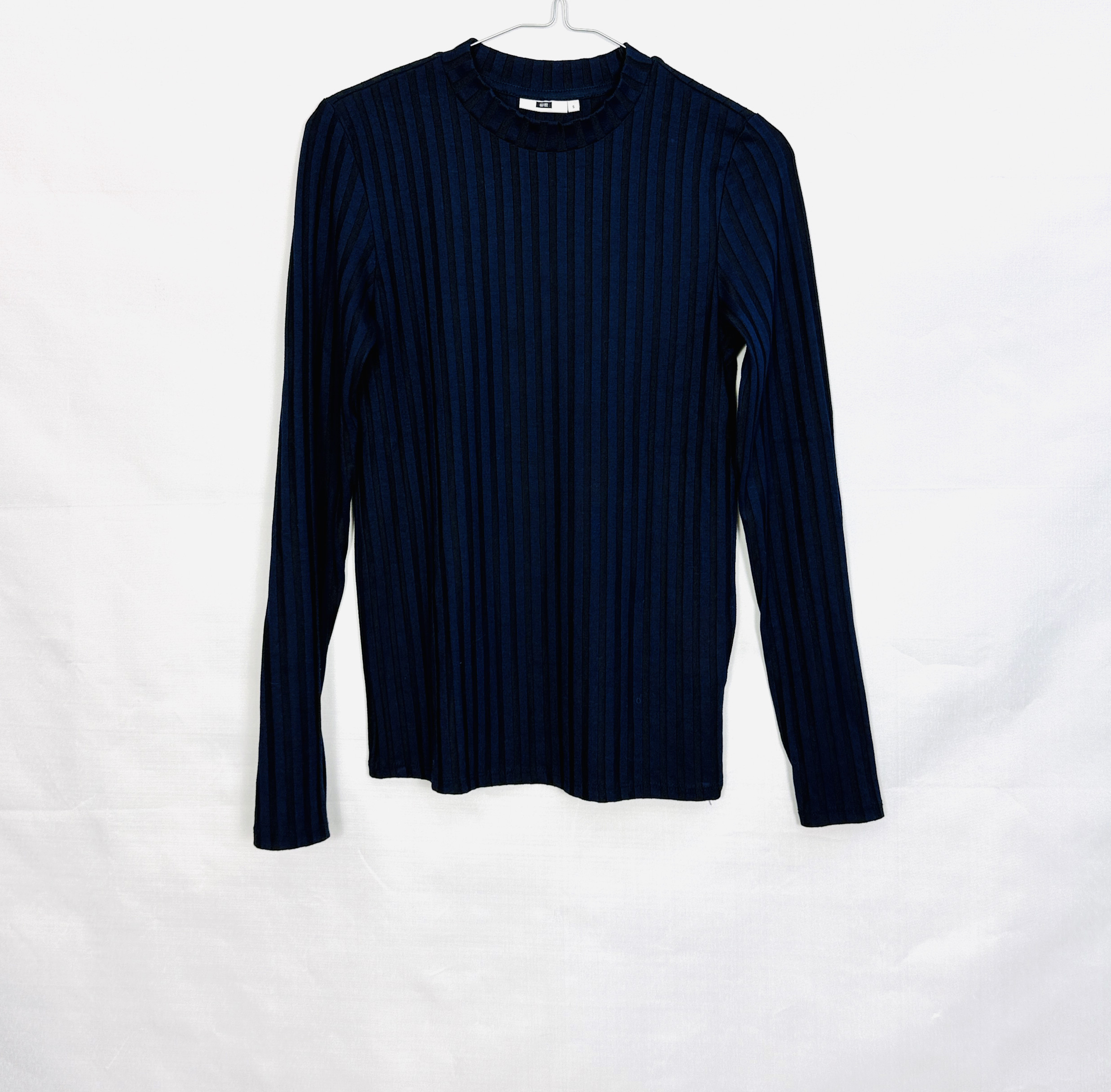 Dekolt tworzy delikatny półgolf z niewielkim, lekko marszczonym wykończeniem przy szyi, co dodaje bluzce kobiecego akcentu bez efektu nadmiaru. Sylwetka bluzki jest dopasowana; linia tułowia i rękawów podkreśla kształty, a długość sięga do wysokości bioder, co pozwala na łatwe łączenie z różnymi typami dołów. Rękawy są długie i przylegające, utrzymane w tym samym rytmie prążków co korpus, co daje spójny, uporządkowany wygląd. Widoczne pionowe żebrowanie nadaje całej formie wyraźnego, eleganckiego charakteru.