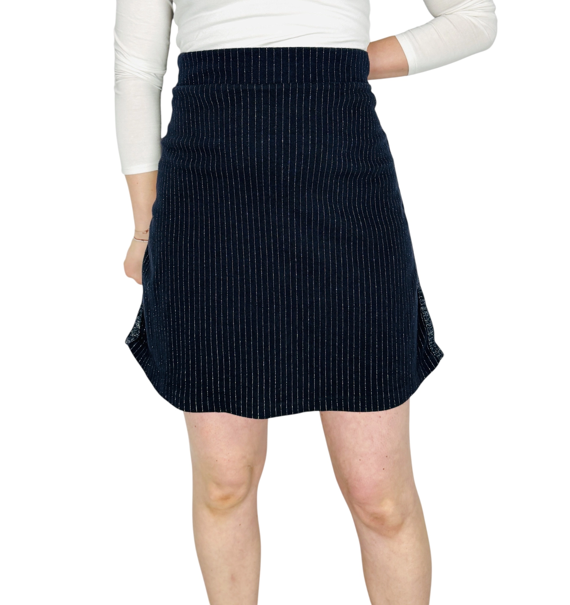Ta granatowa spódnica mini zachwyca eleganckim połączeniem klasyki i subtelnego blasku. Ciemny, głęboki odcień granatu w zestawieniu z delikatnymi, pionowymi paskami tworzy wyjątkowo stylową i dopracowaną całość. Całość nabiera charakteru dzięki lekko połyskującemu wykończeniu jednego z paneli, które dodaje nowoczesnego akcentu i przyciąga spojrzenia.
